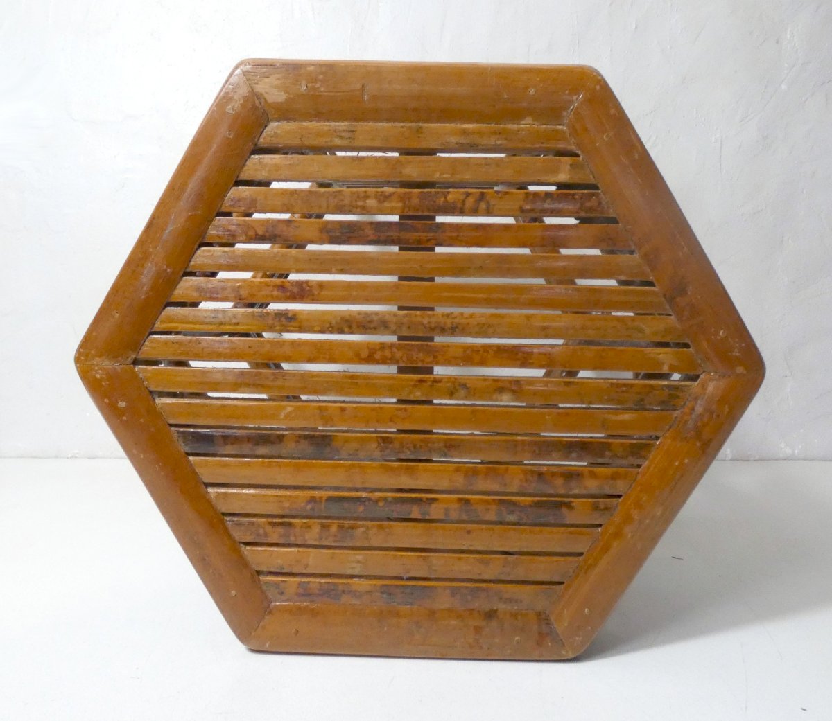 Superbe petite table d'appoint, de forme hexagonale, aux flancs bombés. Couleur bretzel. Ancienne, des années 60, 70. Hauteur: 48 cm. Diamètre: 41 cm. Elle est en excellent état.