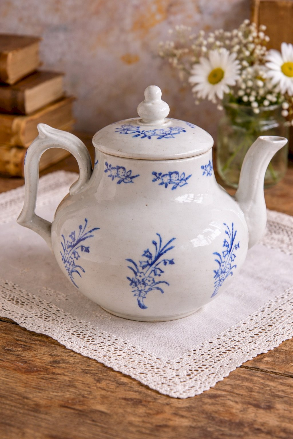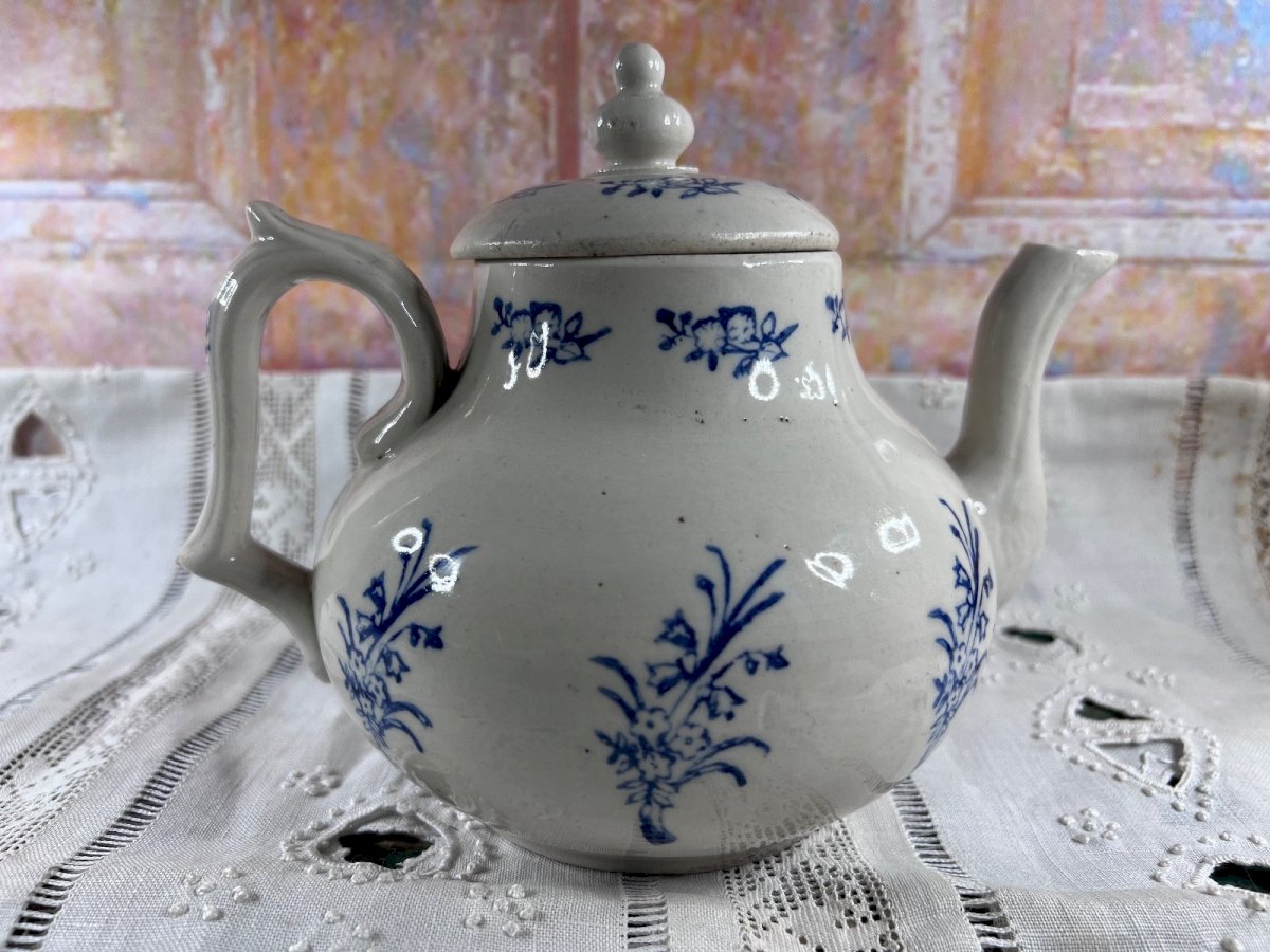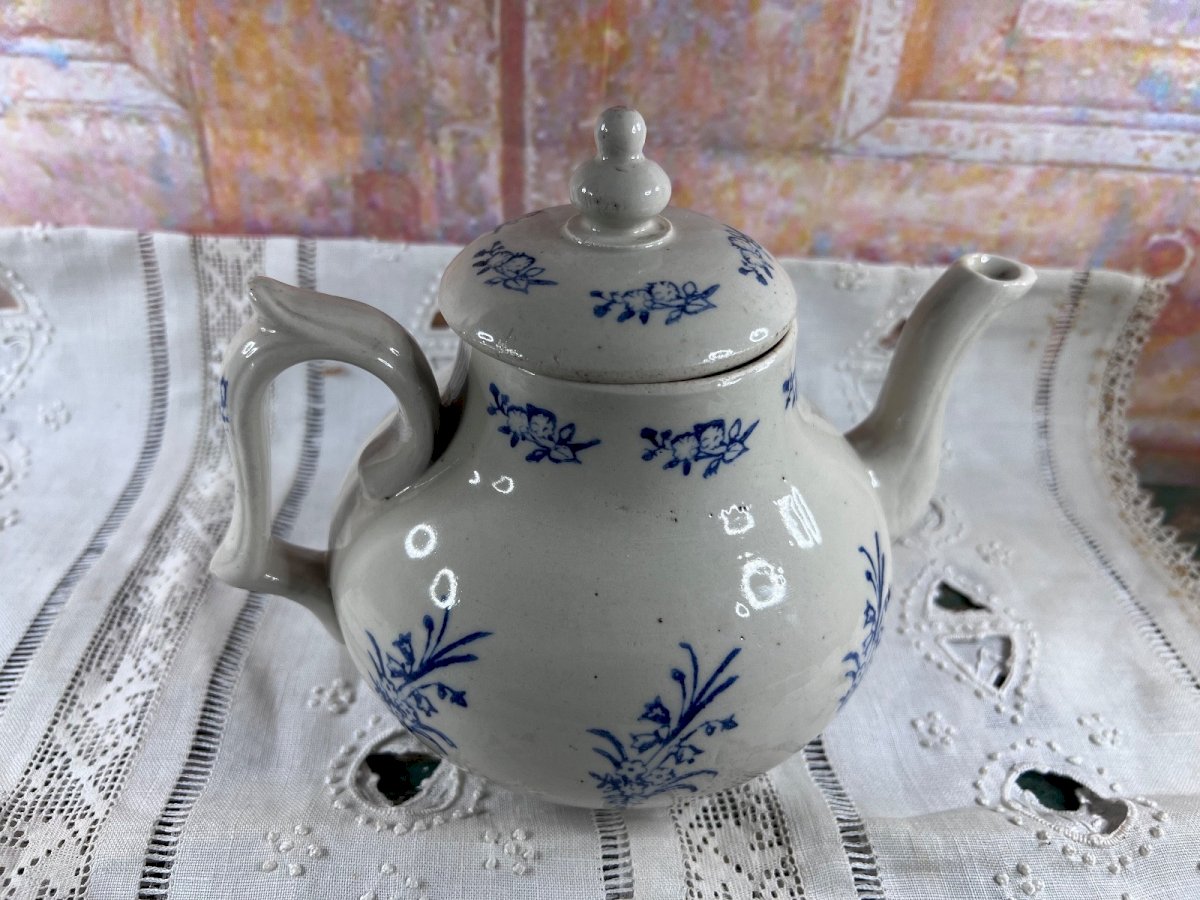 Charmante théière ancienne en faïence française , issue de la production de Saint‑Uze , célèbre pour ses céramiques utilitaires de qualité à la fin du XIXᵉ et au début du XXᵉ siècle. Cette pièce présente une forme généreuse et équilibrée , typique des théières familiales, décorée d’un motif floral bleu sur fond blanc , peint sous couverte, d’une grande sobriété et élégance. Le bec verseur élancé, l’anse bien dessinée et le couvercle d’origine à prise bouton confèrent à l’ensemble une belle harmonie. La faïence offre une patine douce , témoignage du temps et de son usage ancien. Détails Origine : France Manufacture : Saint-Uze Matériau : Faïence Décor : Floral bleu sur fond blanc Époque : Fin XIXᵉ – début XXᵉ siècle Couvercle : présent et d’origine Dimensions Largeur (bec à anse) : 19 cm (≈ 7.48 inches) Hauteur (avec couvercle) : 18 cm (≈ 7.09 inches) État Bon état ancien. Présence de traces normales d’usage et de fabrication (petits points, légères irrégularités de cuisson), sans fêle ni restauration visible. Les photos font partie intégrante de la description. Pays d'origine:France