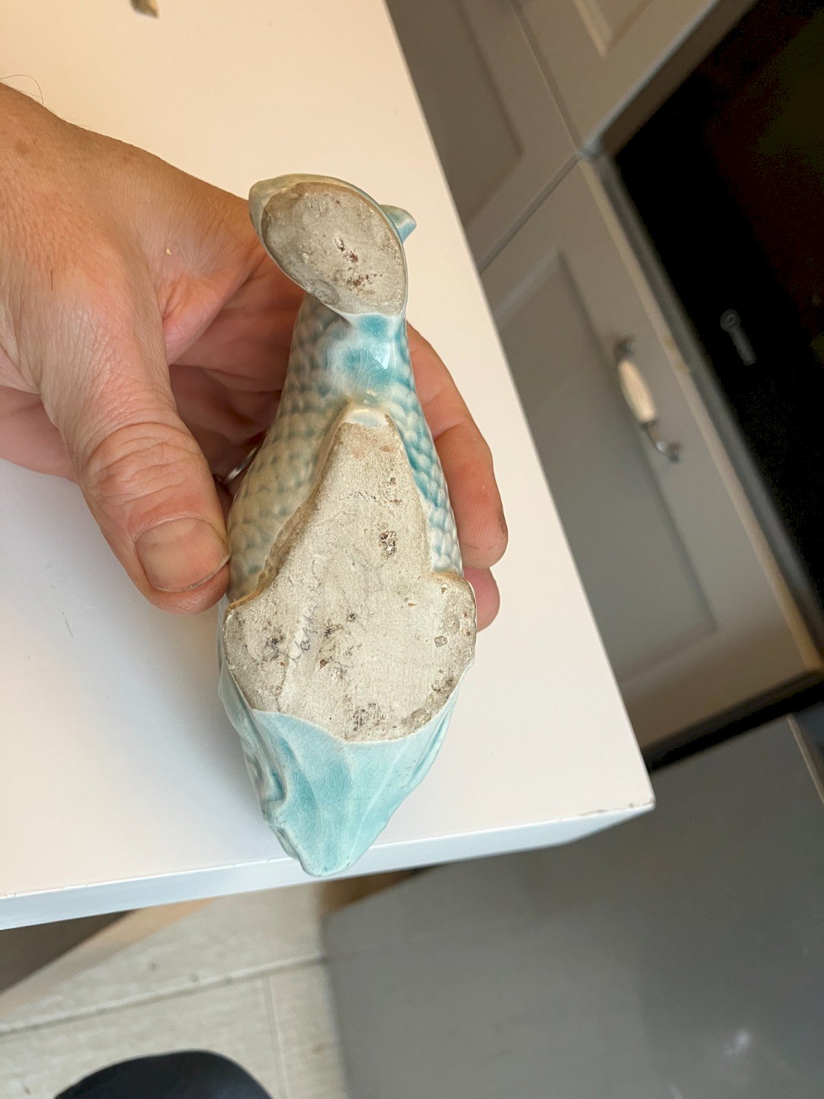 ancienne tirelire a casser en faience emaillee terre vernissee poisson