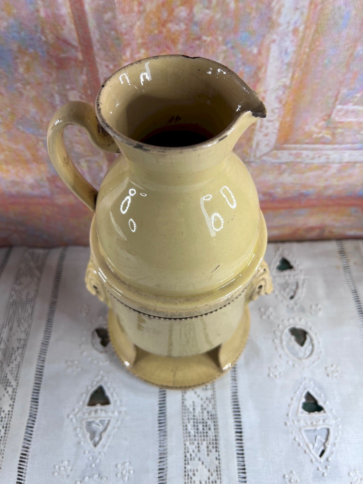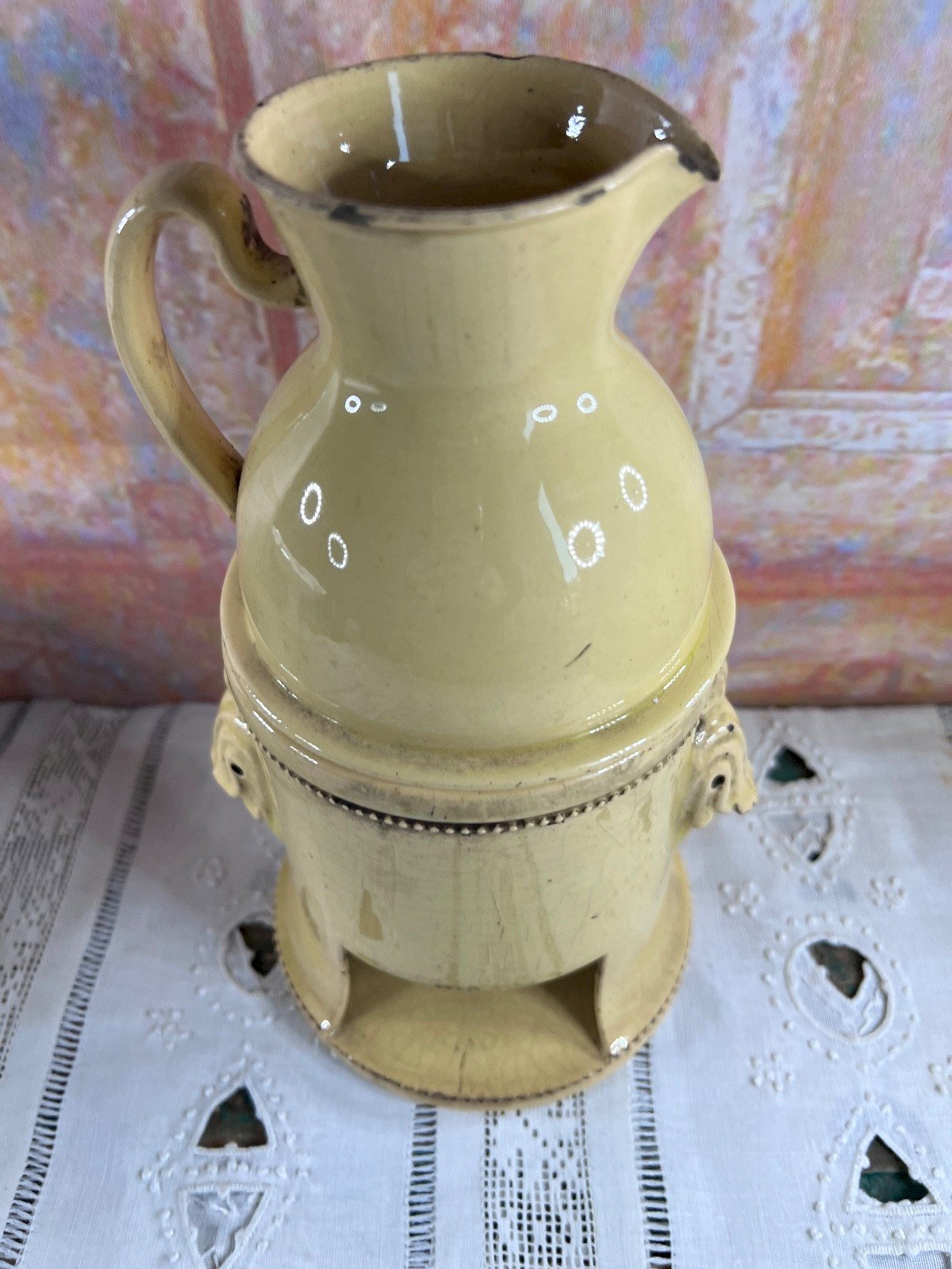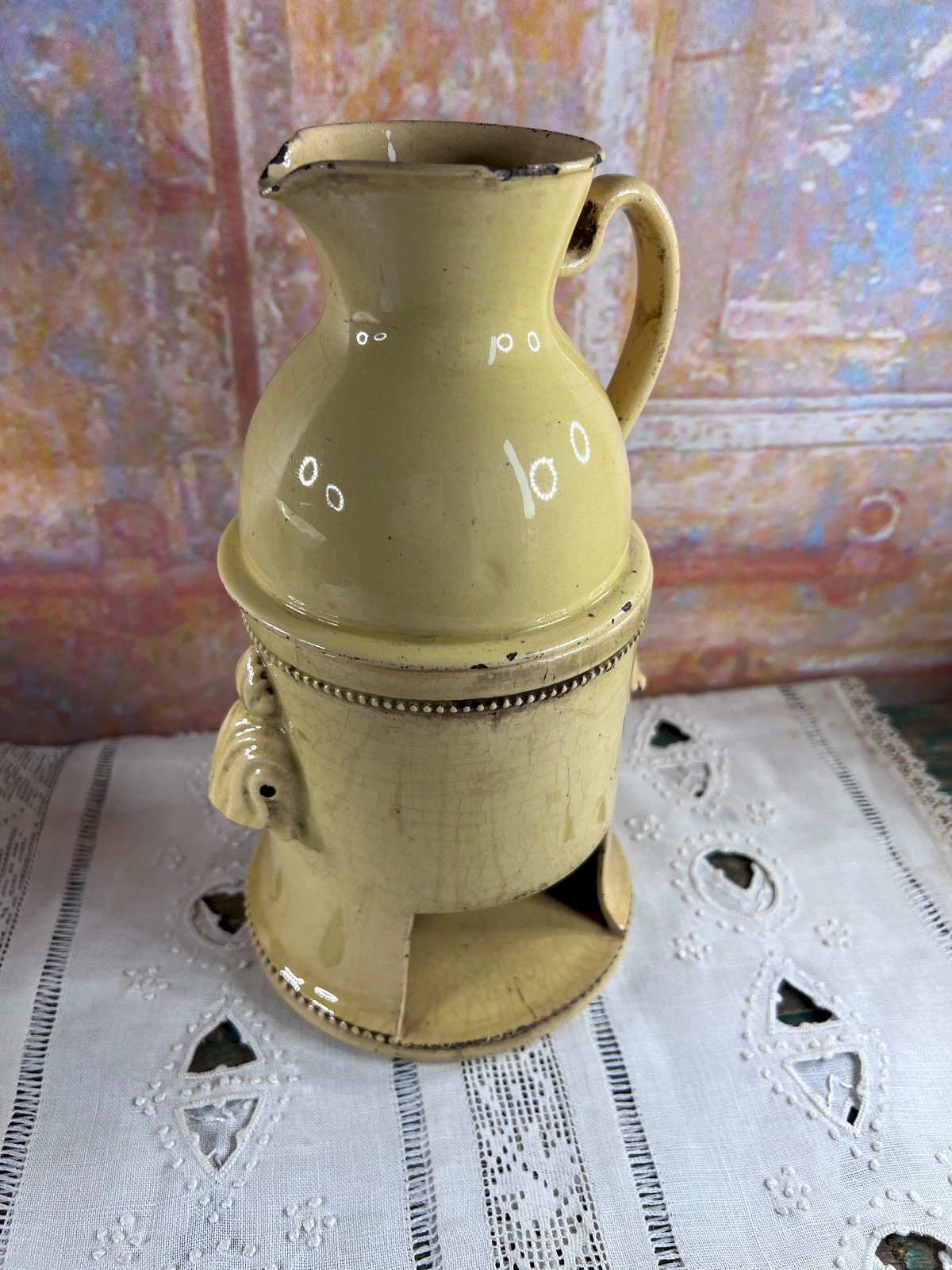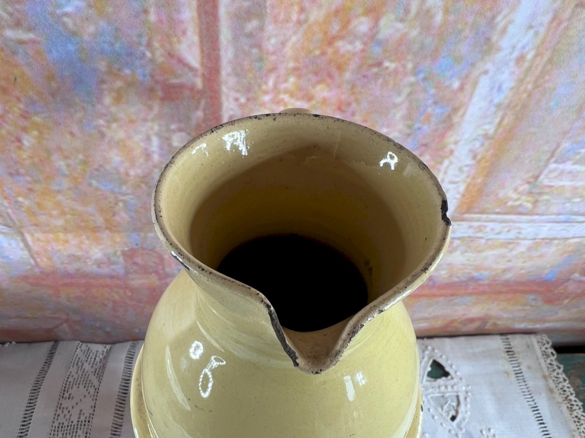 Ancienne tisanière en faïence française , composée de son réchaud et de son pichet verseur , destinée à la préparation et au maintien au chaud des tisanes. Ce type d’objet était couramment utilisé entre la fin du XVIIIᵉ siècle et le début du XIXᵉ siècle , période durant laquelle les tisanes médicinales faisaient partie du quotidien. La faïence présente une glaçure crème craquelée , caractéristique des productions anciennes, avec de jolies prises moulées décoratives et une forme équilibrée, à la fois utilitaire et élégante. La pièce conserve une belle patine du temps , authentique et non restaurée. État État ancien conforme à l’âge : éclat visible au bec verseur traces d’usage et petits manques anciens (voir photos détaillées) Ces défauts n’enlèvent rien au charme ni à la lecture de l’objet et ont été pris en compte dans le prix. Dimensions Hauteur totale : 24 cm Diamètre : 12 cm Mots-clés tisanière ancienne, faïence française, réchaud faïence, pichet ancien, objet ancien cuisine, art de la table ancien, céramique ancienne, XVIIIe XIXe siècle, collection faïence, décoration ancienne, poterie ancienne Authenticité:Original Type:Tisanière Origine:France Pays d'origine:France Sous-type:Réchaud à tisane Matière:Faïence Style:Napoléon, Empire