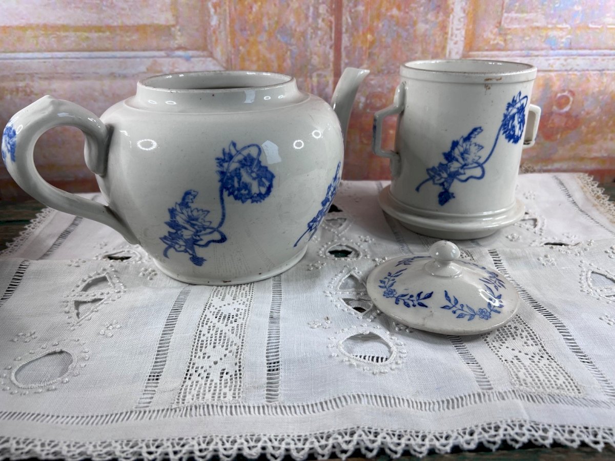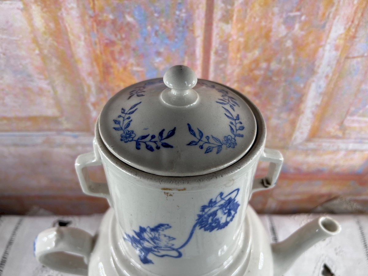 Ancienne tisanière en faïence française attribuée à la manufacture de Saint-Uze , composée de la théière et de son réchaud. Ce type d’ensemble était destiné à maintenir les infusions au chaud grâce à une bougie placée dans la partie inférieure. La faïence est décorée d’un motif floral bleu sur fond blanc , peint sous couverte, caractéristique des productions utilitaires de Saint-Uze à la fin du XIXᵉ et au début du XXᵉ siècle . Les formes sont généreuses et équilibrées, typiques des tisanières familiales de cette époque. ⚠️ État – à lire attentivement Bon état général pour un objet ancien Petit défaut au bec verseur (visible sur les photos) Gros doute sur l’adéquation du couvercle : le couvercle tient correctement mais son ajustement n’est pas optimal il est possible qu’il ne soit pas d’origine Traces d’usage, petites irrégularités et marques de fabrication normales ? L’ensemble est vendu en l’état , les photos faisant partie intégrante de la description. ? Dimensions Diamètre : 18 cm Hauteur de la théière : 15 cm Hauteur totale (avec réchaud) : 30 cm Détails Origine : France Manufacture : Saint-Uze (attribuée) Matériau : Faïence Décor : Floral bleu sur fond blanc Période estimée : fin XIXᵉ – début XXᵉ siècle Composition : théière + réchaud + couvercle (non garanti d’origine) Pays d'origine:France