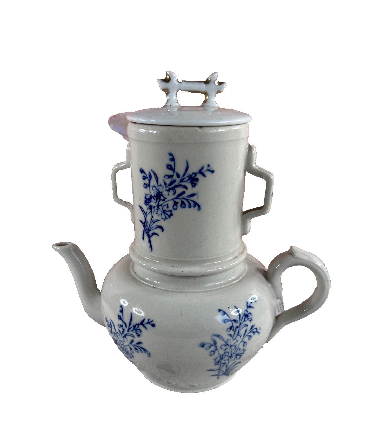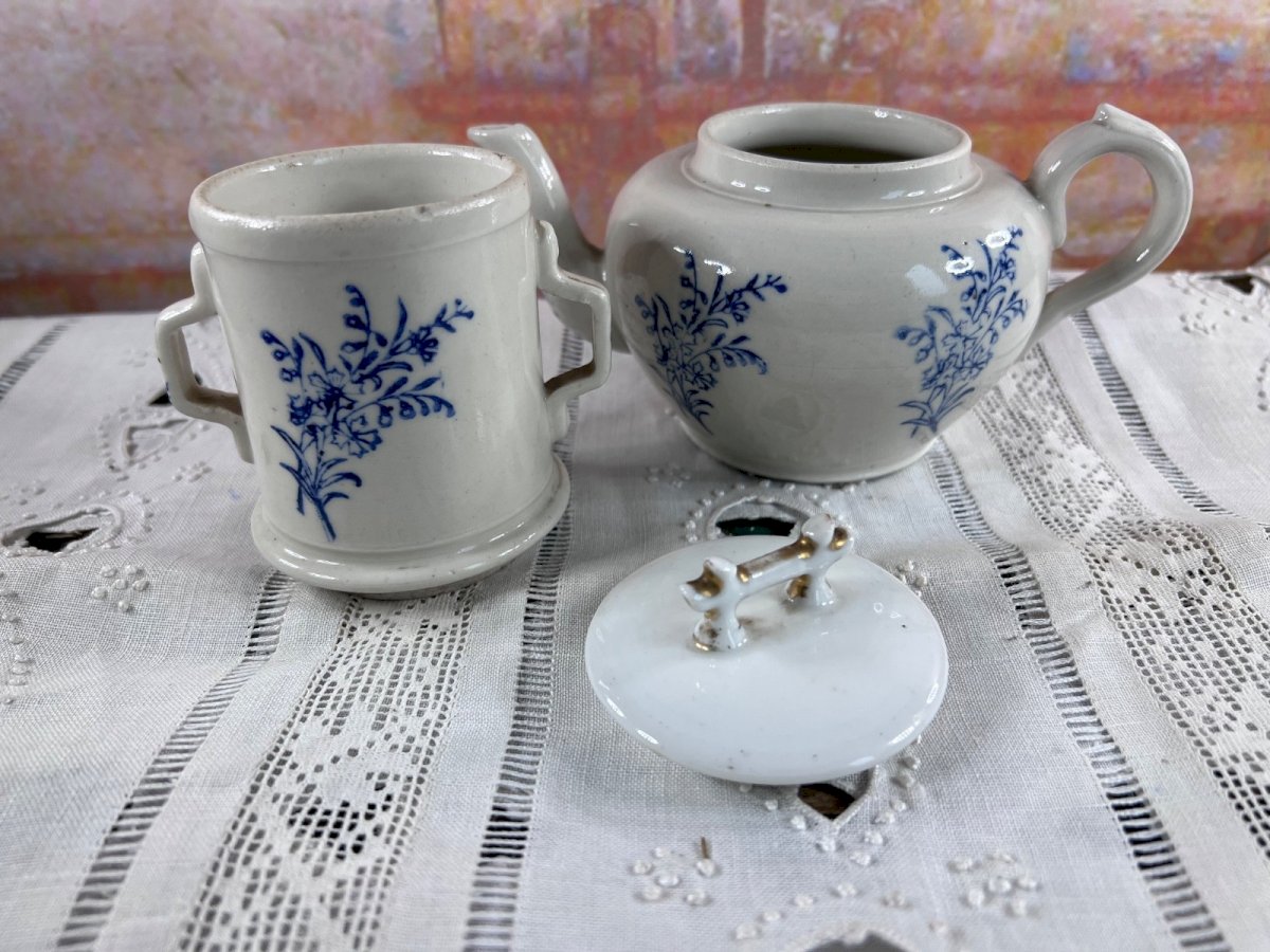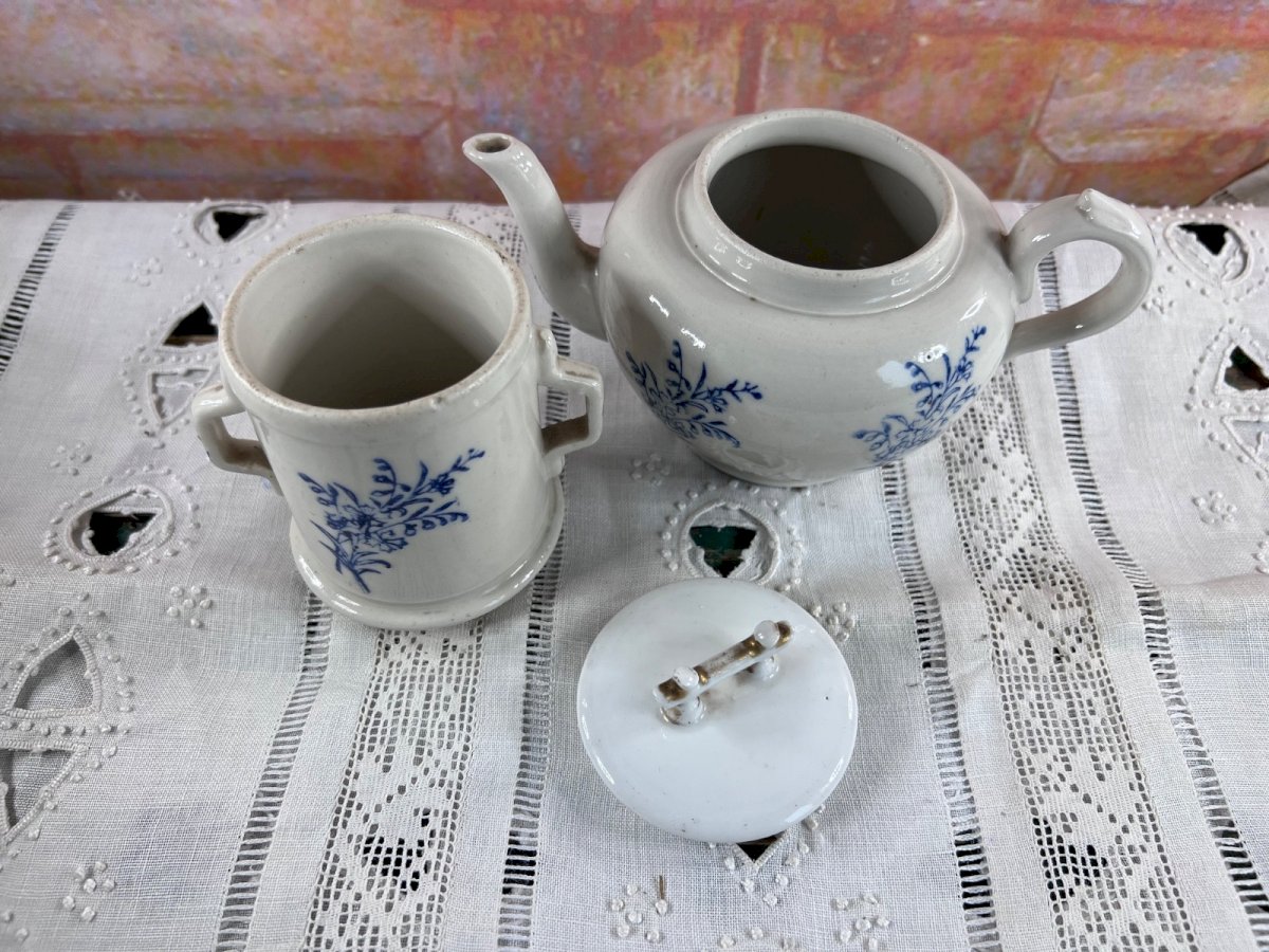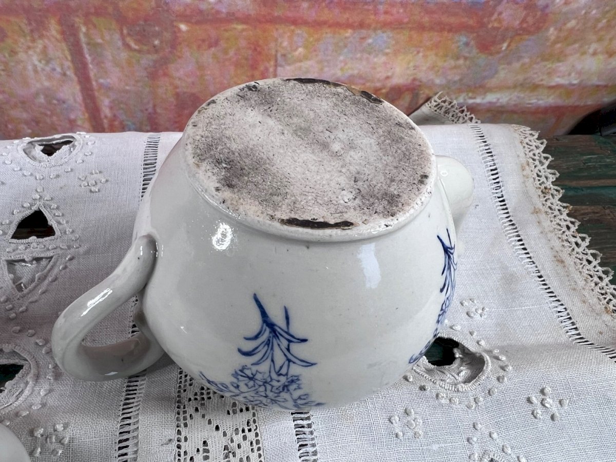 Ancienne tisanière en faïence française attribuée à la manufacture de Saint-Uze , composée de la théière, du réchaud et d’un couvercle non d’origine . La faïence est décorée d’un motif floral bleu sur fond blanc , peint sous couverte, caractéristique des productions utilitaires de Saint-Uze à la fin du XIXᵉ et au début du XXᵉ siècle . Les formes sont simples et équilibrées, typiques des tisanières destinées à l’usage quotidien, aujourd’hui très recherchées pour la décoration. ⚠️ État – important Bon état général pour un objet ancien Couvercle non d’origine (il s’adapte correctement mais n’est pas celui d’origine) Traces d’usage, petites marques et irrégularités de cuisson normales pour l’époque Pas de fêle ni restauration visible ? Objet vendu en l’état , les photos faisant partie intégrante de la description. Dimensions Diamètre : 12 cm Hauteur totale : 18 cm Détails Origine : France Manufacture : Saint-Uze (attribuée) Matériau : Faïence Décor : Floral bleu sur fond blanc Période estimée : fin XIXᵉ – début XXᵉ siècle Composition : théière + réchaud + couvercle non d’origine Pays d'origine:France