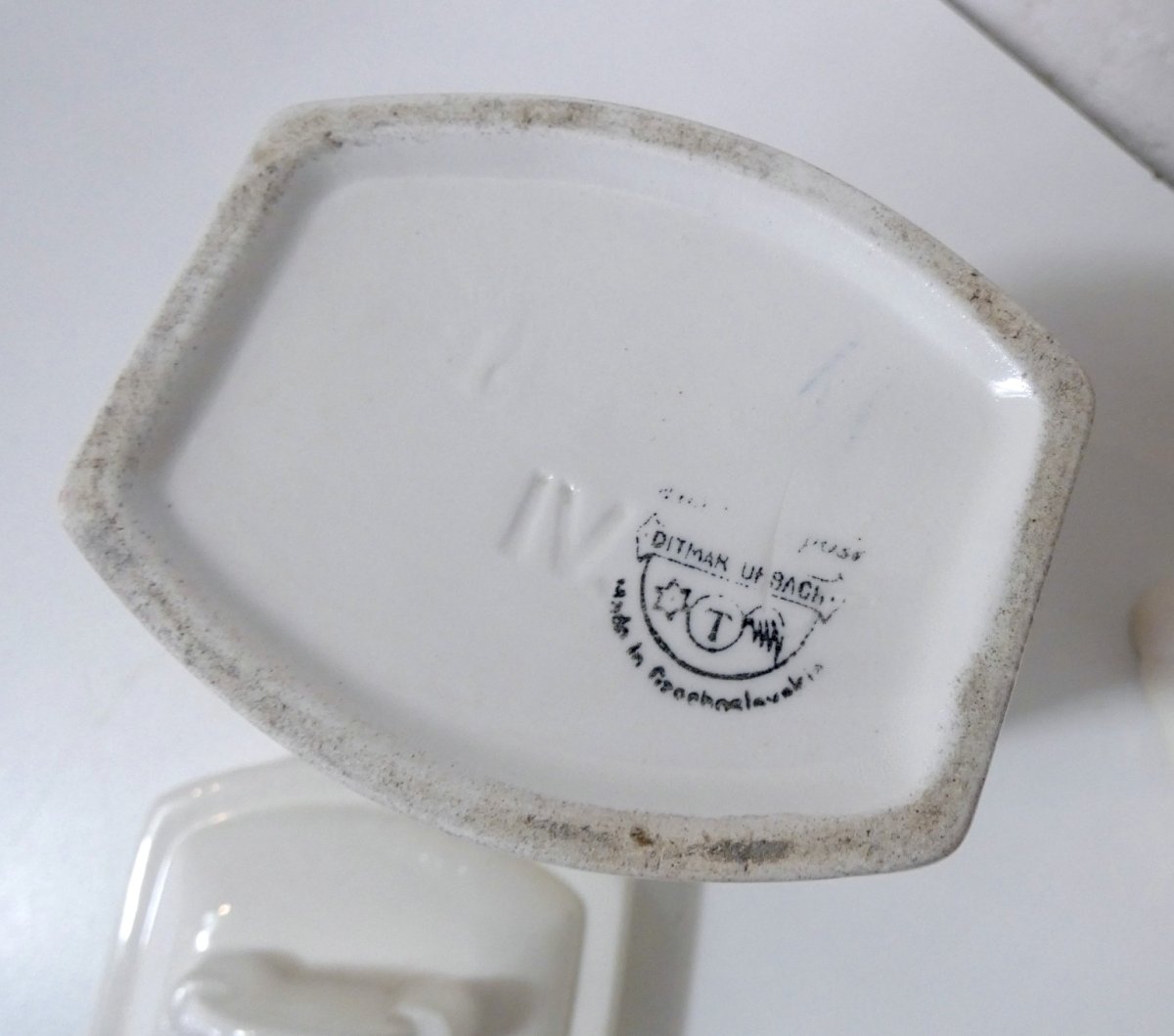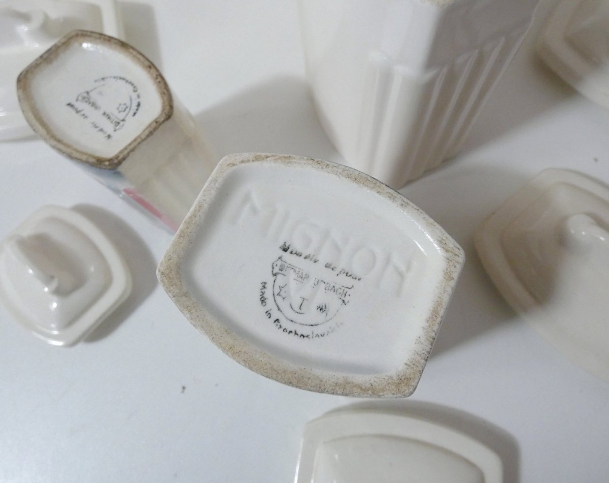 5 pots gigognes en faïence. Estampillés: Ditmar Urbach. Modèle "MIGNON". Le plus grand (sucre) mesure 17 cm. Ensemble en très bon état.