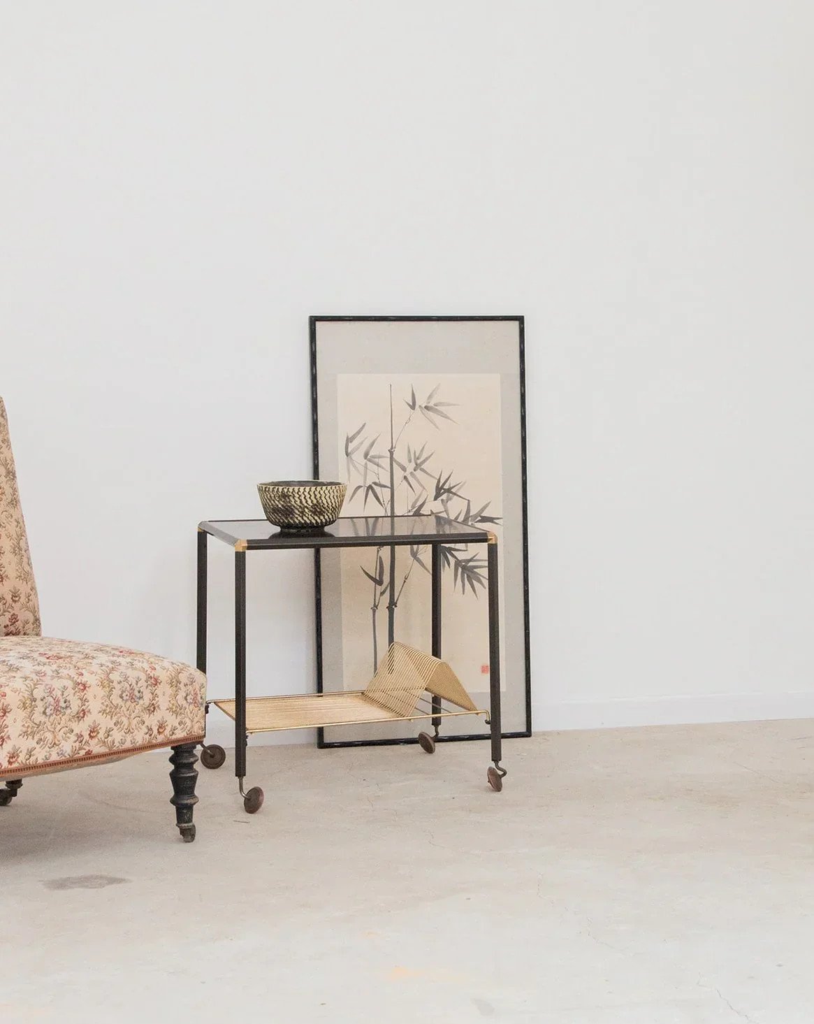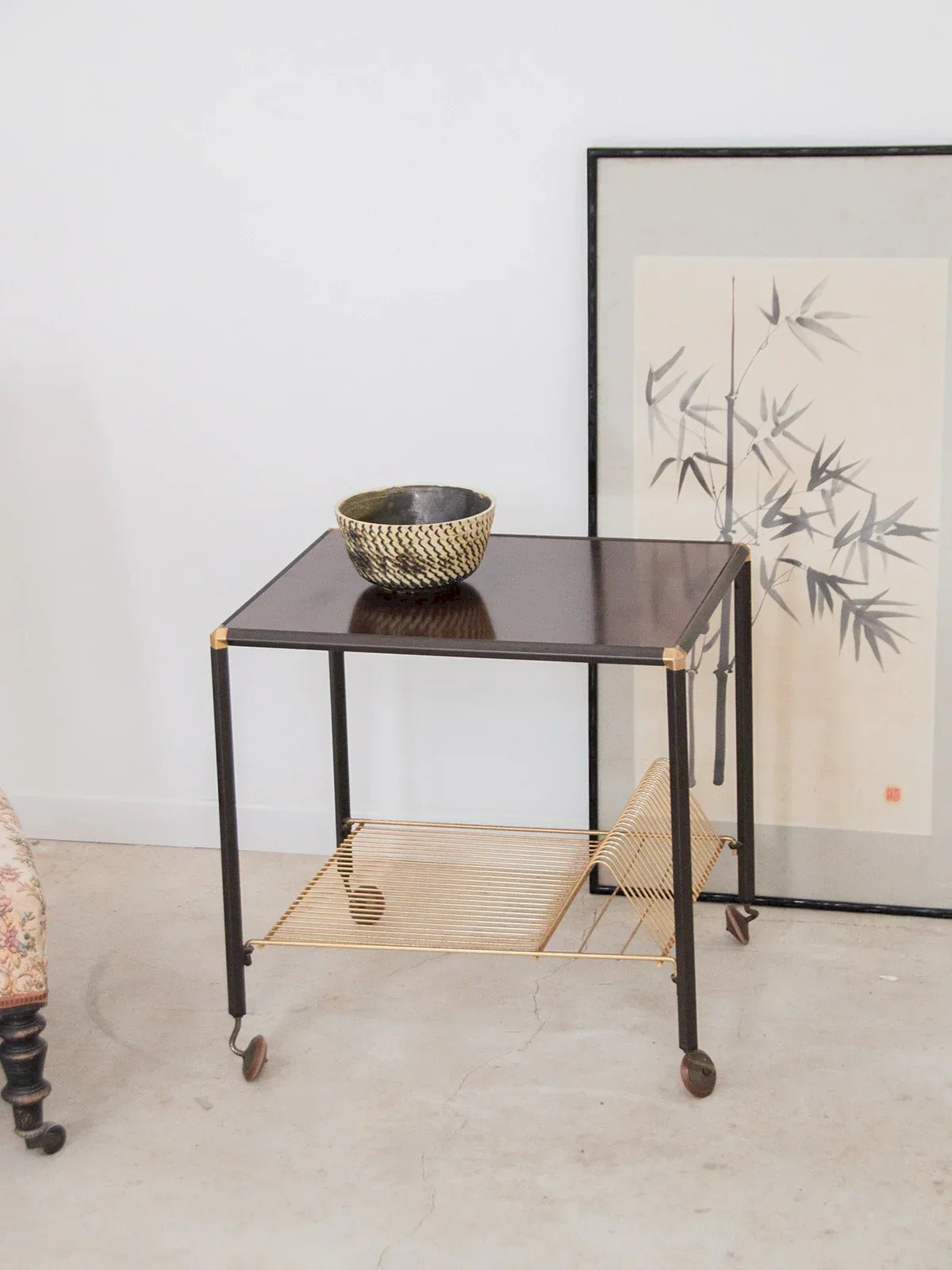 Apportez une touche pratique et élégante à votre espace avec cette desserte sur roulettes. Elle est parfaite pour optimiser votre rangement ! Sa structure en métal en bas assure une durabilité et un style moderne, tandis que ses roulettes permettent un déplacement facile. Idéale pour la cuisine ou le salon, elle s’adapte à tous vos besoins tout en ajoutant du charme à votre décoration. Exclusivité web, la rencontre se fera chez vous ! Longueur : 54 cm Largeur : 44 cm Hauteur : 54 cm Petite histoire de la desserte La desserte, aussi appelée table servante, voit le jour au XVIIème siècle. À l’époque, elle est utilisée pour servir et desservir les plats et la vaisselle aux cours des repas. Munie de roulettes, elle se transfère d’un endroit à l’autre sans effort et permet de débarrasser la table plus rapidement en réduisant le nombre de trajets entre la salle à manger et la cuisine. C’est par sa grande utilité que la desserte est devenue un élément important du mobilier, servant aussi à servir le thé ou le petit-déjeuner. Cette petite table d’appoint mobile a su trouver au fil des siècles une place de choix dans notre intérieur. État:Occasion: Objet ayant été utilisé. Objet présentant quelques marques d'usure superficielle, ...Occasion: Objet ayant été utilisé. Objet présentant quelques marques d'usure superficielle, entièrement opérationnel et fonctionnant correctement. Il peut s'agir d'un modèle de démonstration ou d'un objet retourné en magasin après une courte période d'utilisation. les éventuelles imperfections. Marque:Debongout Type:Produit chiné Matériau:Métal, Laiton Style:Contemporain Personnalisé:Dessertes