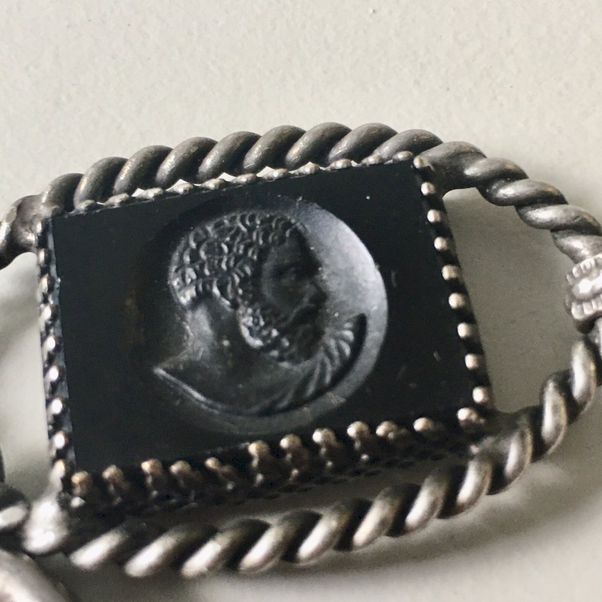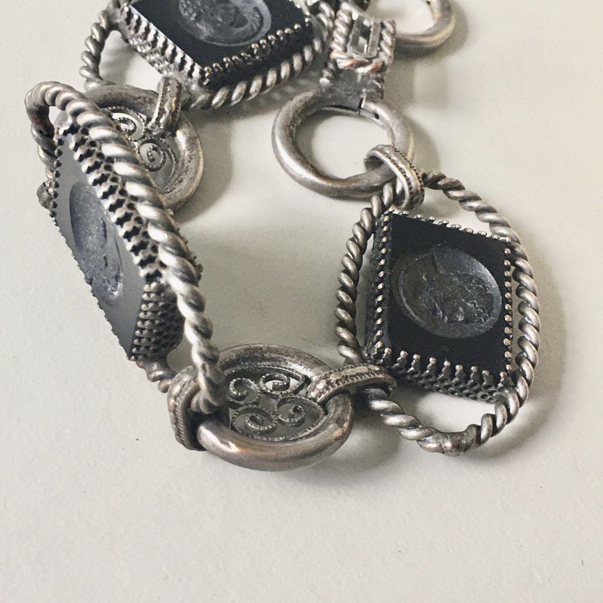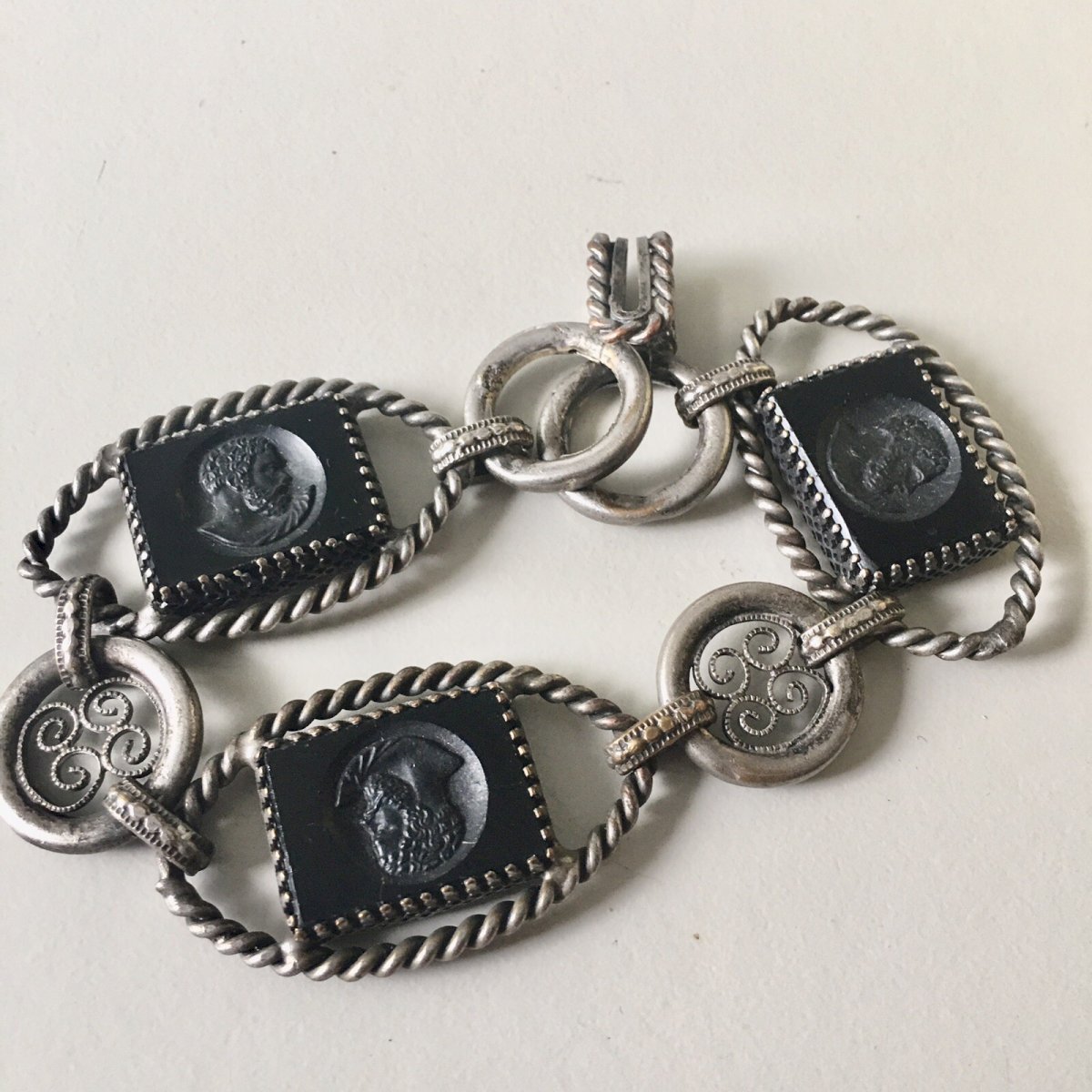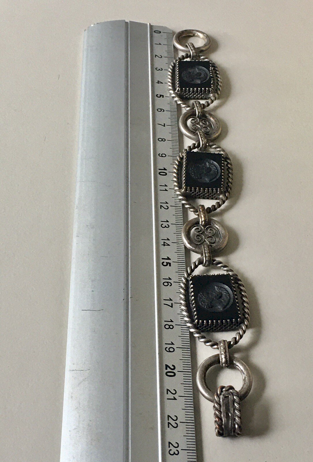 Antique Bracelet Camee Verre Noire Recto Verso Victorian Jewellery. État : Occasion bracelet en métal argenté, quelques manques d’argenture. Les camées en verre sont recto verso. Impossible de s’en rendre compte avec les photos. Usure d’usage vendu dans l’état plutôt bon état antique État:Occasion: Objet ayant été porté. ...Occasion: Objet ayant été porté. les éventuelles imperfections. Pierre dominante:Verre Type:Bracelet Couleur dominante:Noir Type de médaillon:Souvenir Matière:Verre Métal:Plaqué argent Thème:Antique Forme du pendentif:Rectangulaire
