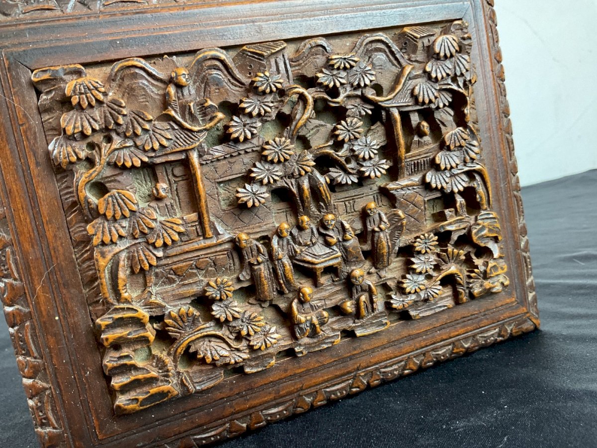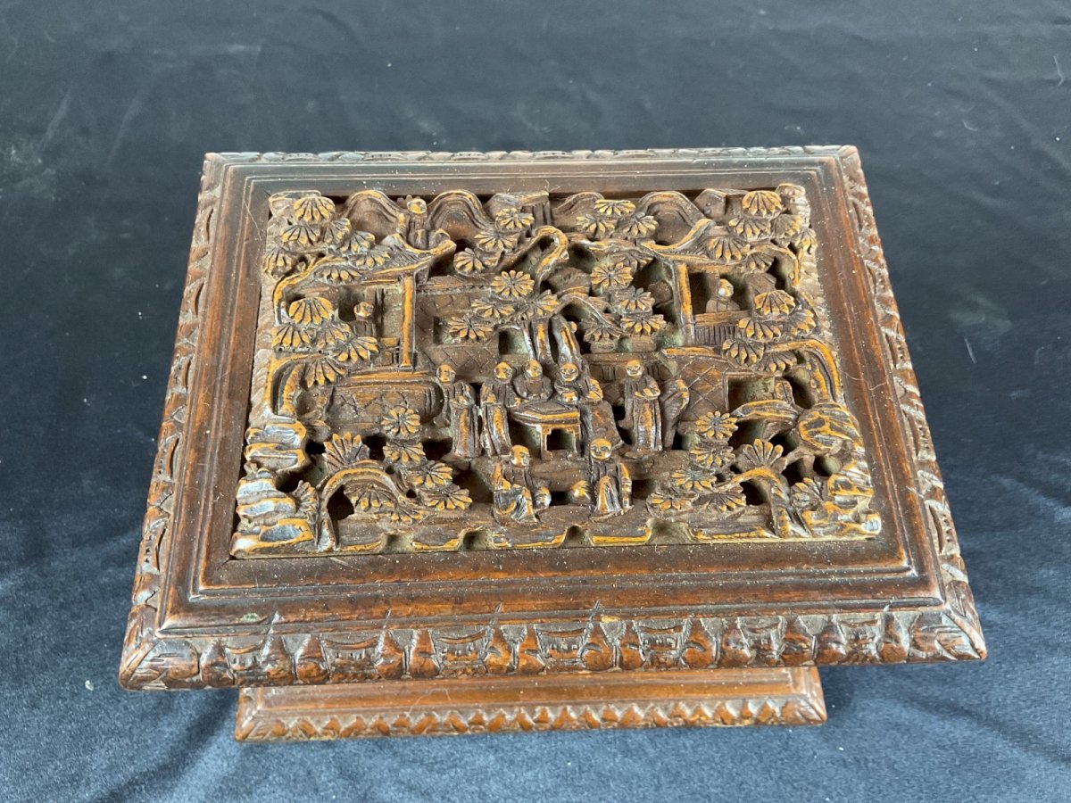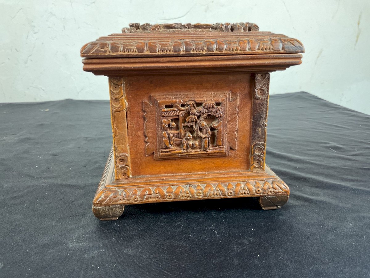 Antique Chinese Canton Qing Carved Wooden Jewelry Box 19th C 广东十三行精品檀香盒 Lock Key Hauteur : 12,5 cm Largeur : 17 cm Authenticité:Original Type:Objet de vitrine, Décoratif Origine:Asie Matière:Bois Style:Napoléon III