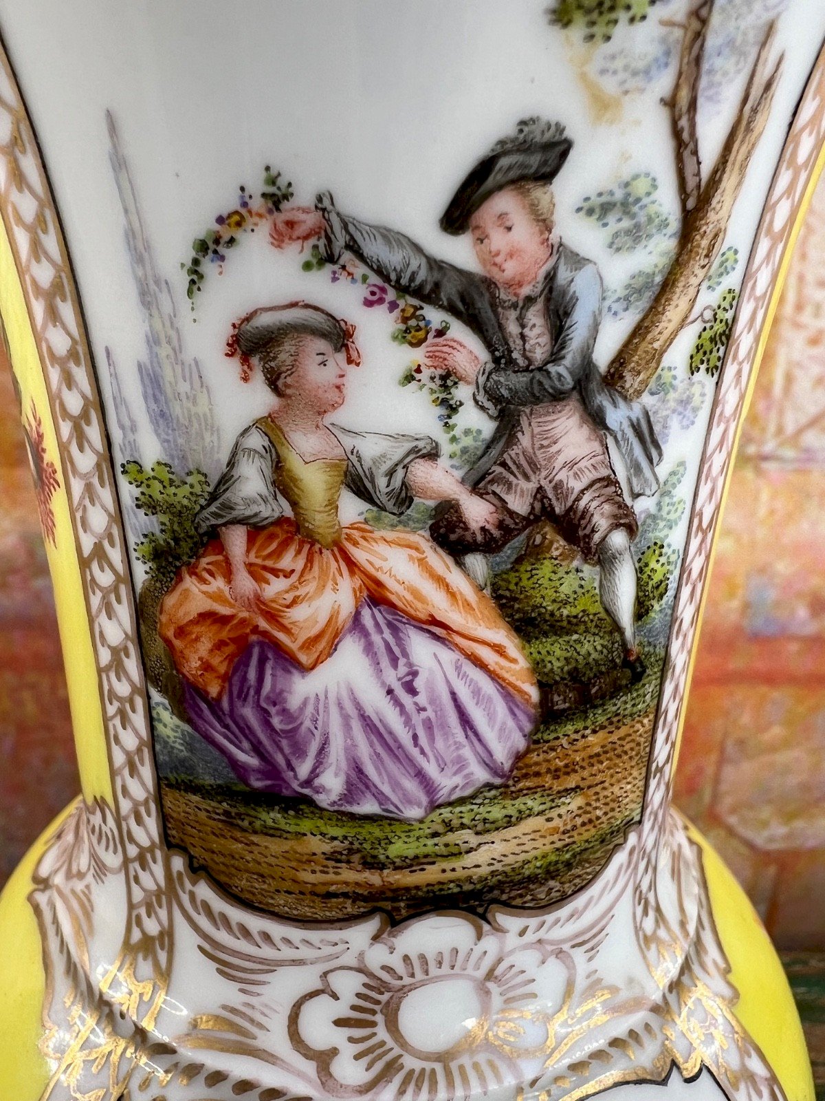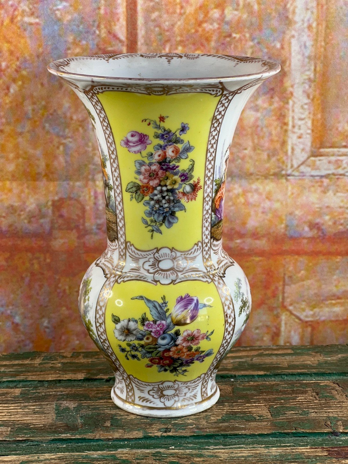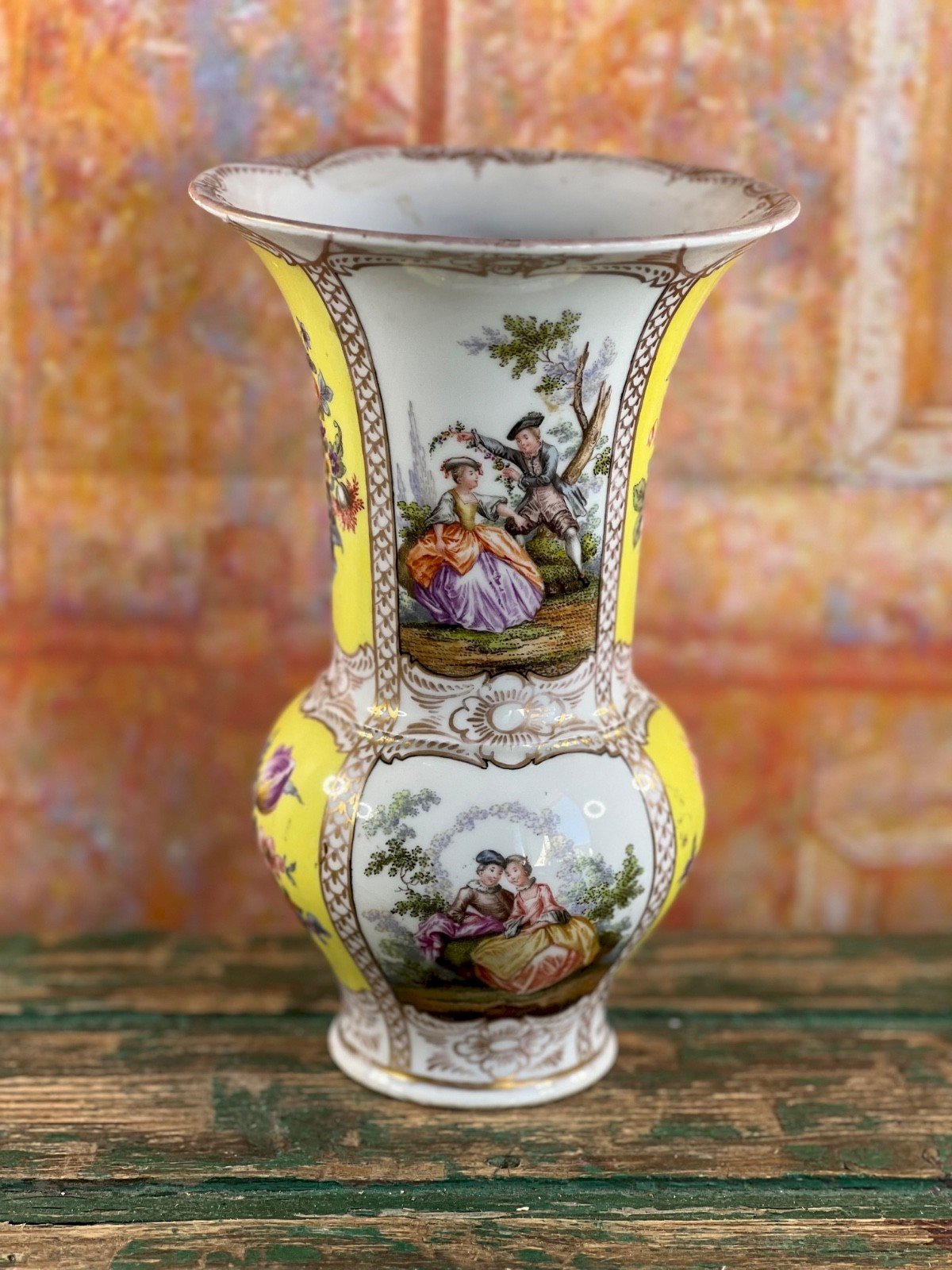 Superbe vase en porcelaine de Dresden attribué à Helena Wolfsohn, vers 1880. Ce vase de collection présente un magnifique décor rococo peint à la main, inspiré des porcelaines de Meissen . Sur un fond jaune lumineux , se déploient des scènes galantes et des motifs floraux délicats , entourés de rehauts d’or d’une grande finesse. Une œuvre pleine de charme, emblématique du raffinement allemand du XIXe siècle. Caractéristiques : Manufacture : Helena Wolfsohn, Dresden (attribué) Époque : Fin XIXe siècle (vers 1880) Matériau : Porcelaine peinte à la main, rehauts d’or Décor : Scènes romantiques et bouquets floraux sur fond jaune Marque : Monogramme "AR" en bleu sous la base (typique de Wolfsohn, Dresden) Pays de production : Allemagne, Saxe Hauteur : 20,5 cm (8.07 in) Diamètre du col : 13 cm (5.12 in) Base : 6,5 cm (2.56 in) État : Très bel état général, infimes traces du temps, sans fêle ni éclat. Un objet de collection élégant et romantique , idéal pour les amateurs de porcelaine fine allemande et du style Rococo. Expédition soignée et protégée, avec assurance. ?? Dresden Porcelain Vase attributed to Helena Wolfsohn, circa 1880. Beautiful Rococo-style hand-painted porcelain vase from Dresden, Germany. The bright yellow background highlights charming romantic scenes and delicate floral cartouches richly accented with fine gilding . A refined and authentic 19th-century decorative piece inspired by Meissen craftsmanship. Details: Maker: Helena Wolfsohn (attributed) Origin: Dresden, Saxony, Germany Date: circa 1880 Material: Hand-painted porcelain, gilt highlights Design: Romantic couples and flowers on yellow background Mark: “AR” blue monogram under the base (typical Wolfsohn mark) Height: 20.5 cm / 8.07 in Top diameter: 13 cm / 5.12 in Base: 6.5 cm / 2.56 in Condition: Excellent antique condition. Minor age-related wear. No chips or cracks. A collector’s vase combining European charm and 19th-century elegance . Secure international shipping with insurance and professional packaging. Dresden porcelain Helena Wolfsohn Rococo vase Meissen style German porcelain 19th century decor Hand painted vase Antique Dresden Romantic scene Yellow porcelain European antique Gilded vase Collectible porcelain Pays d'origine:Allemagne