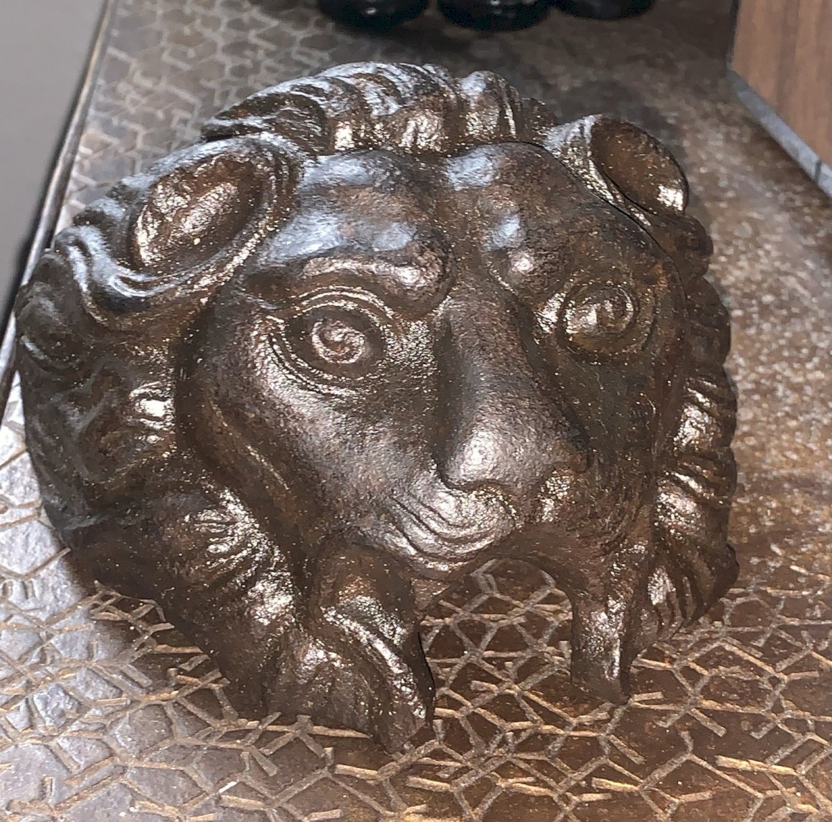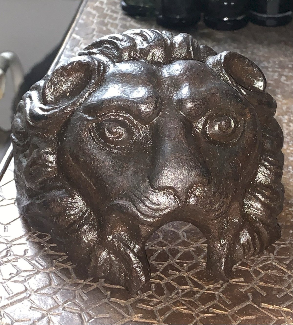 Très ancien mascaron en fonte Tête de lion Objet ancien  Antérieur au XIXe Noirci POSTÉRIEUREMENT.Dommage Longueur:12,2cm Largeur:11,5cm poids:2370grammes Type:Jardin, Décoration extérieure Période:XIXème et avant Sous-type:Fontaine, Bassin Matière:Fonte Style:Renaissance