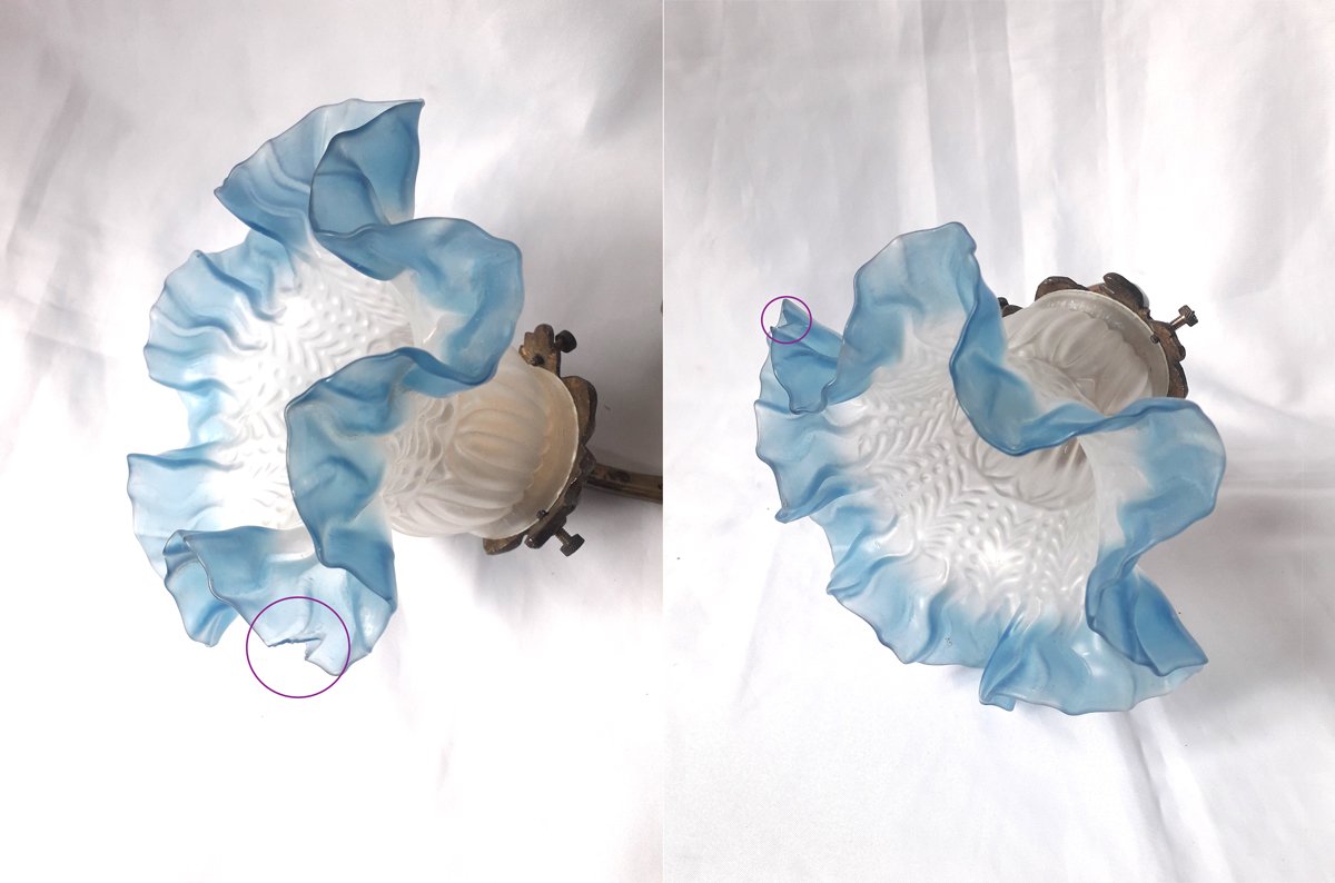 - Abat-jour tulipe en pâte de verre moulé translucide blanc à bords dégradés de bleu, motif grain de riz. La tulipe est certainement postérieure à l’applique : date plutôt des années 30-40.
