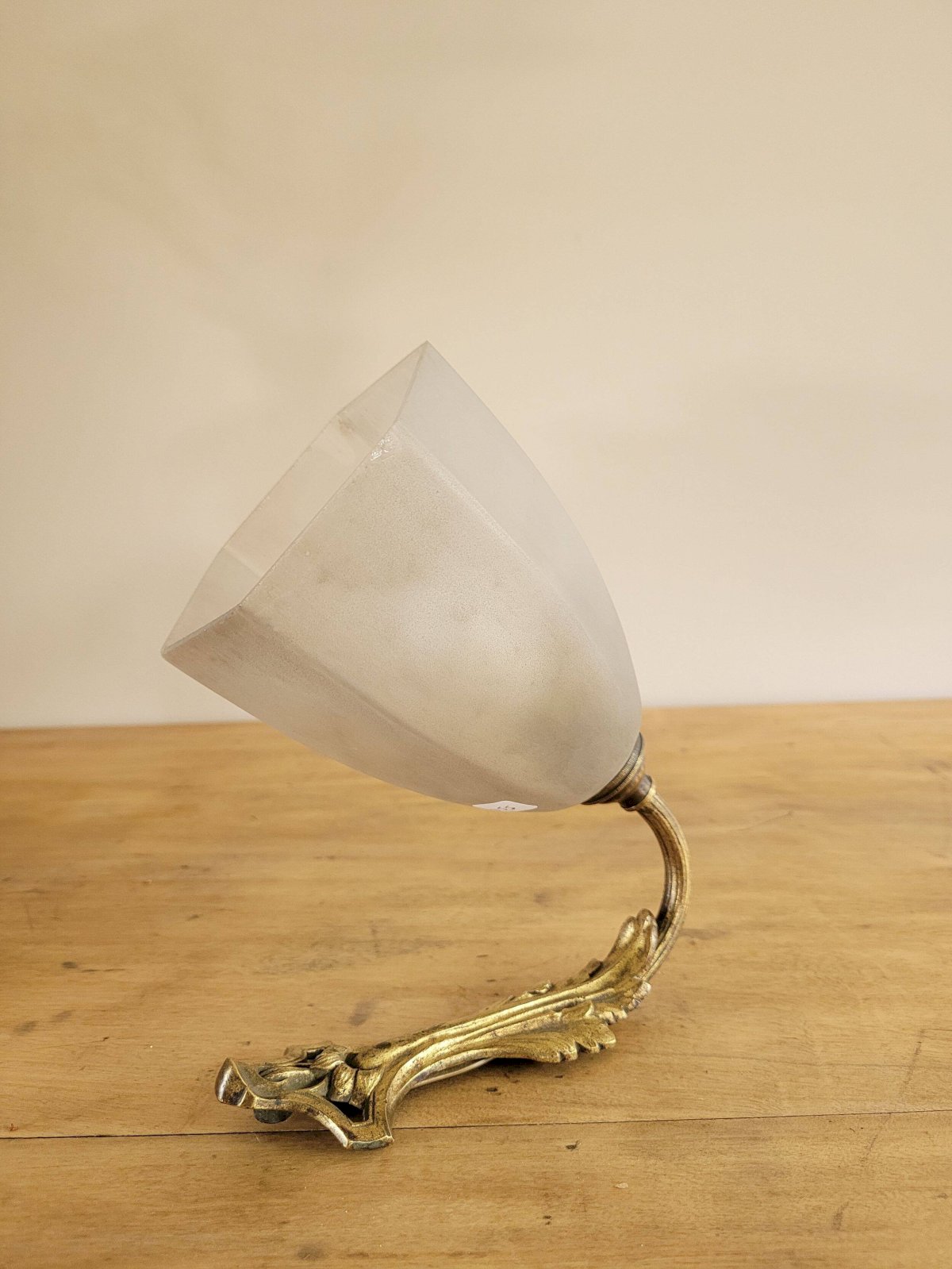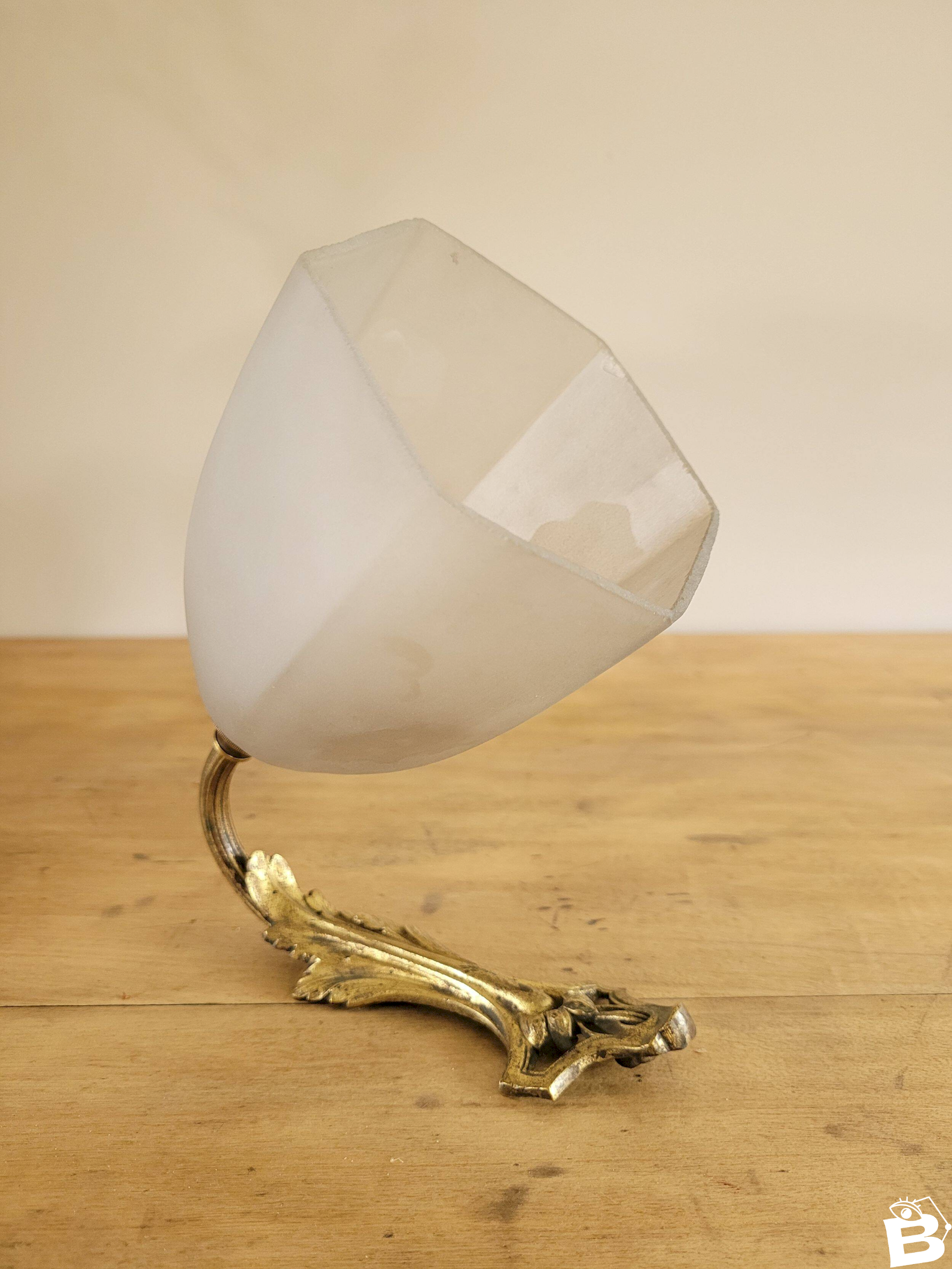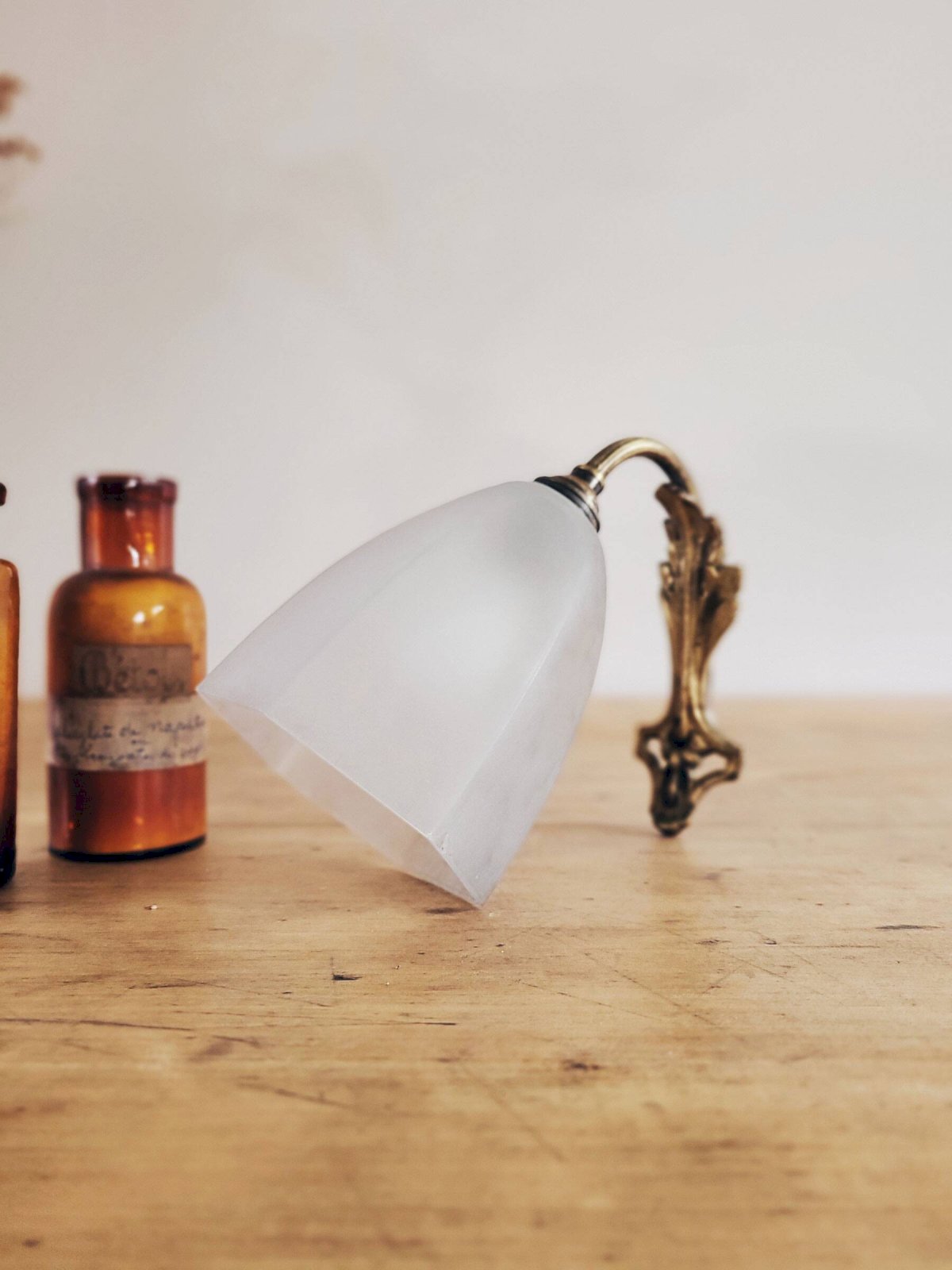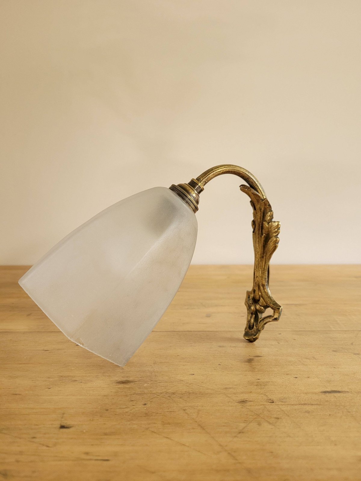 On aime chiner des mignonneries, en voilà une ! Cette petite applique en métal doré et verre dépoli nous inspire une atmosphère chaleureuse, une pièce d’un rouge bourgogne, un escalier à l’anglaise quand la nuit s’invite…En bon état général.