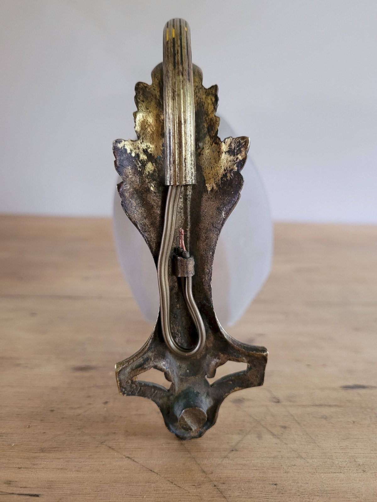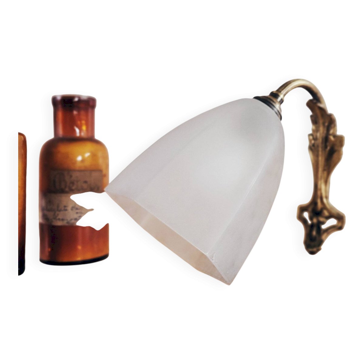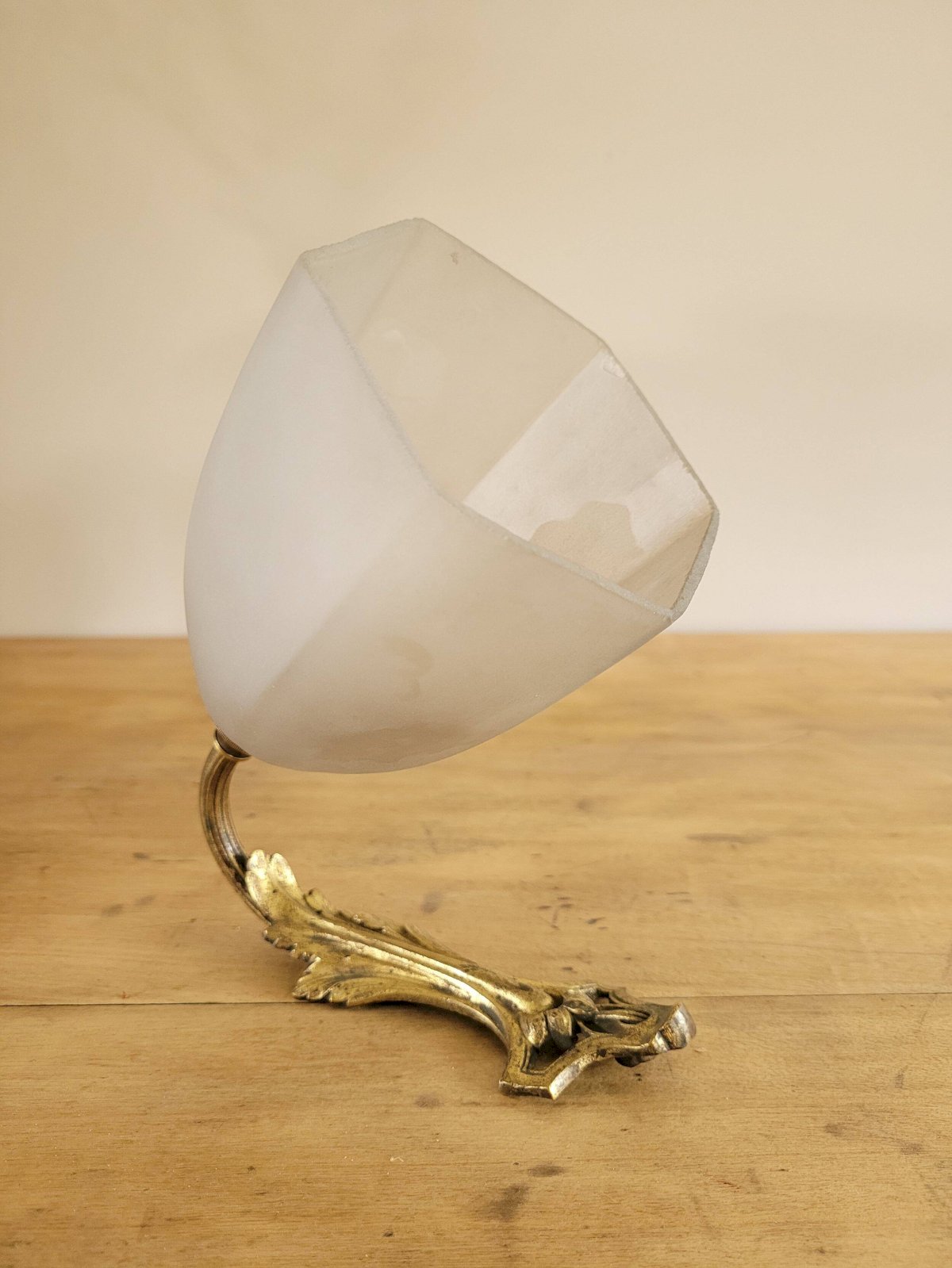 On aime chiner des mignonneries, en voilà une ! Cette petite applique en métal doré et verre dépoli nous inspire une atmosphère chaleureuse, une pièce d’un rouge bourgogne, un escalier à l’anglaise quand la nuit s’invite…En bon état général.