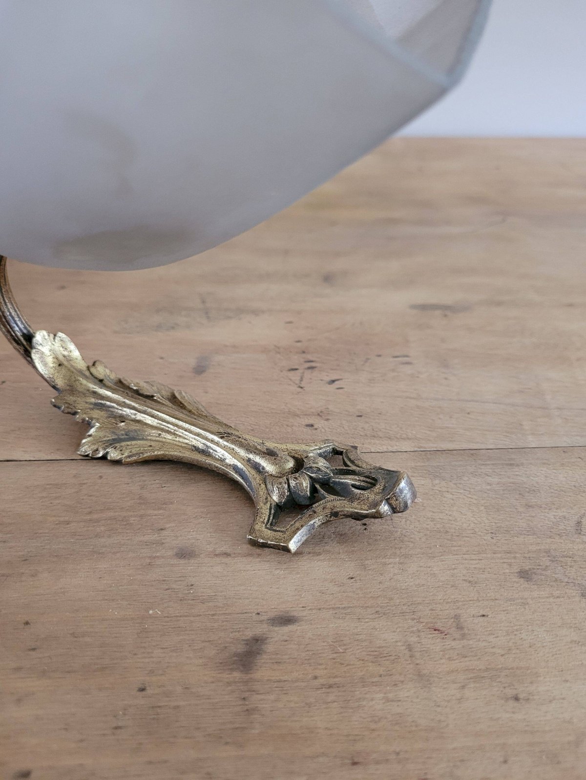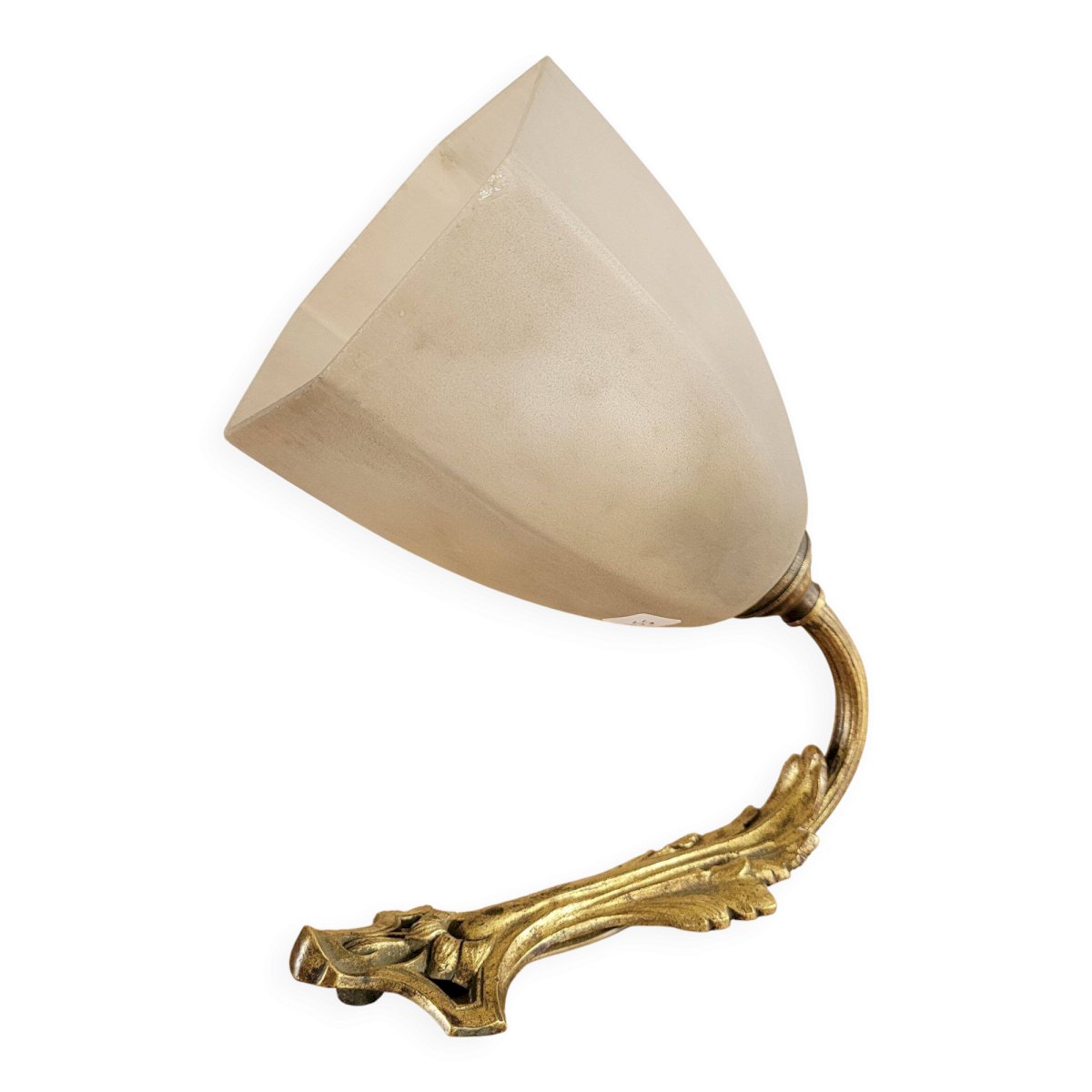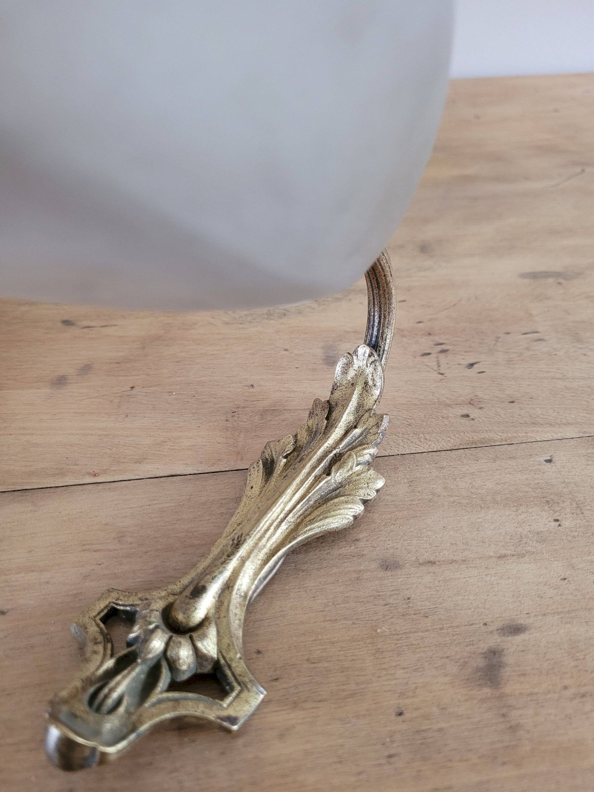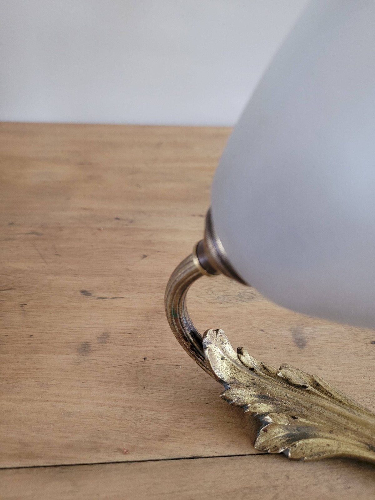 On aime chiner des mignonneries, en voilà une ! Cette petite applique en métal doré et verre dépoli nous inspire une atmosphère chaleureuse, une pièce d’un rouge bourgogne, un escalier à l’anglaise quand la nuit s’invite…En bon état général.