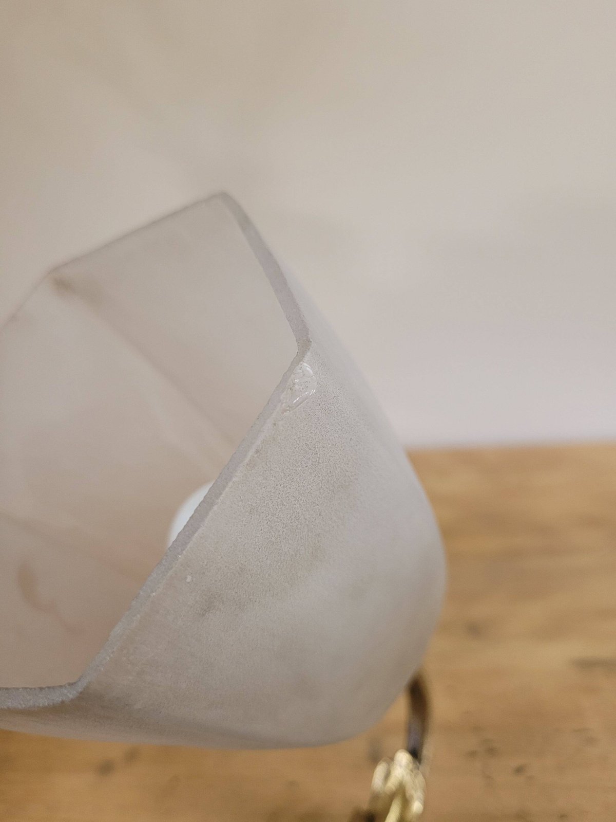 A noter un petit éclat sur l’abat-jour et quelques traces du temps (voir photo).Partie électrique entièrement restaurée dans notre atelier.Douille B22 standard.Dimensions:11 X 18 X 21 cm (L X H X P)Envoi possible par la Poste!Retrait sur place gratuit (14570 Clécy) ou livraison à Caen et alentours (20€).