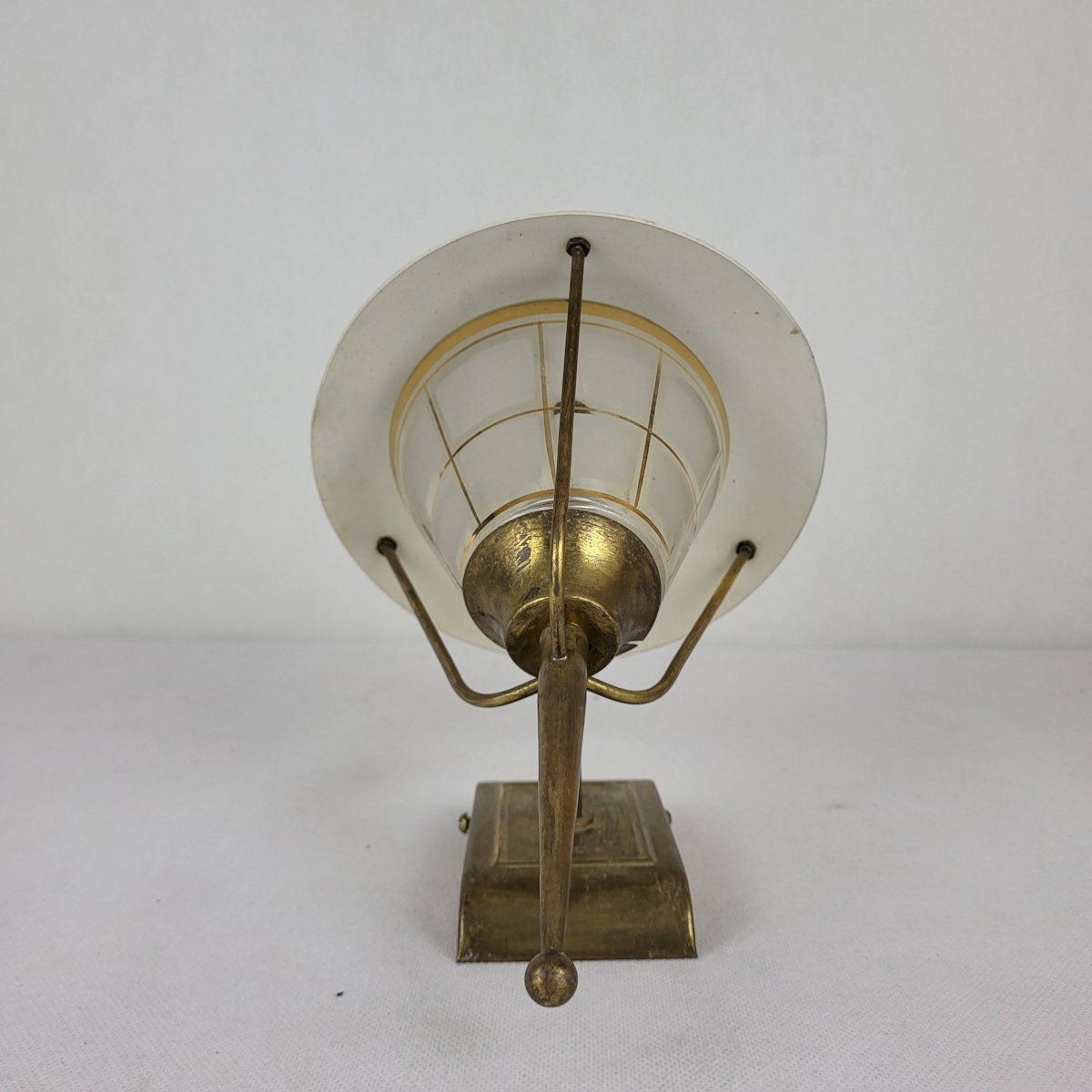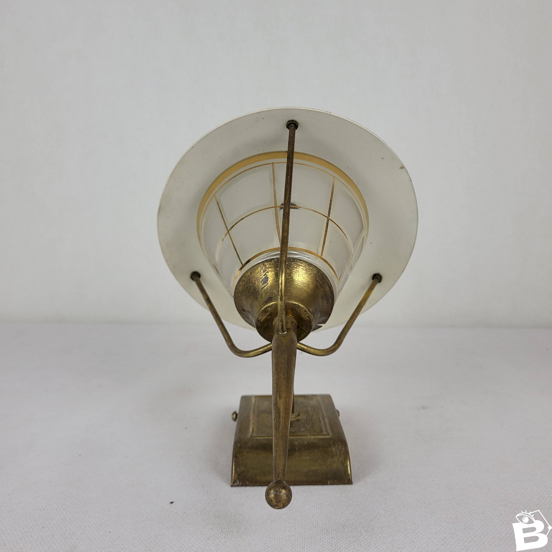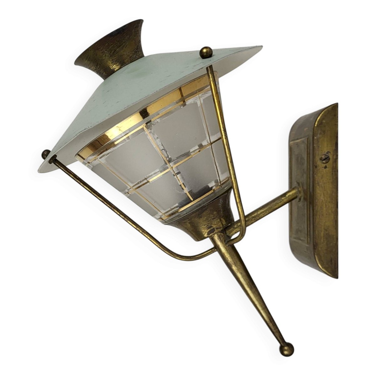 Applique lanterne maison lunel années 50.Métal doré - tôle peinte - verre.Possède sa fixation.Globalement en bon état avec une patine liée à l'age.On notera un fêle du métal (derrière le cache douille en métal doré)Les photos font également office de descriptif.Emballage soigné et livraison rapide.Hauteur 26 cm.Profondeur (posé) 17, 5 cm.Diamètre réflecteur 21 cm.