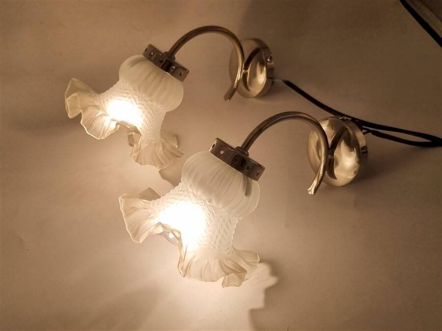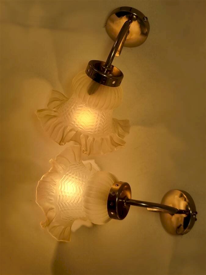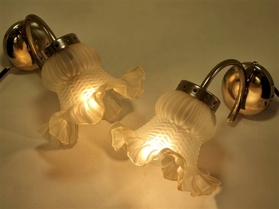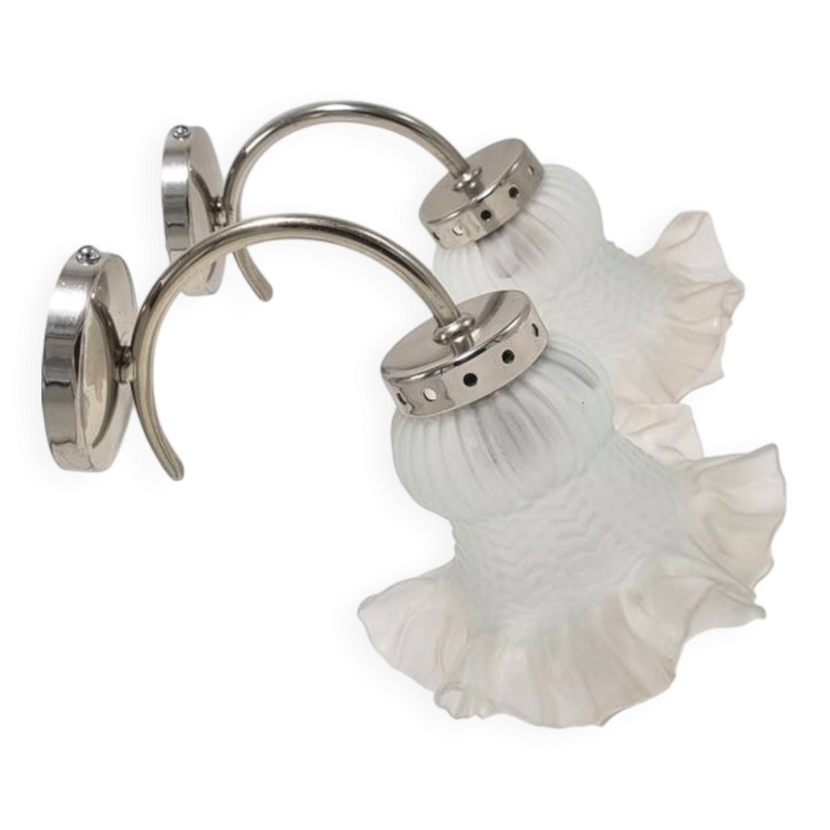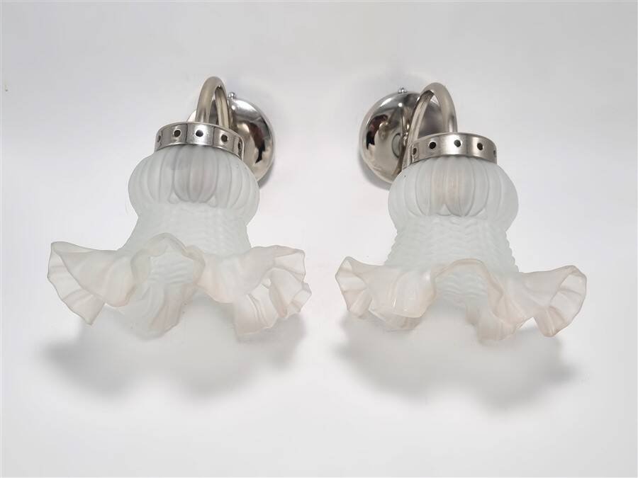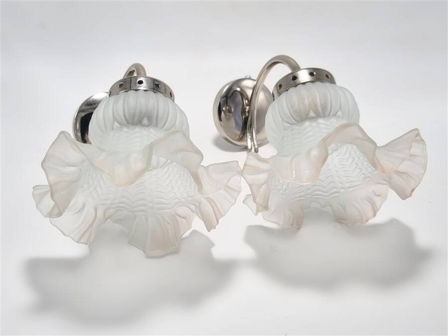 Paire d'appliques murales vintage composée de tulipes translucides à la bordure légèrement rosée et de supports en métal de couleur argentée.