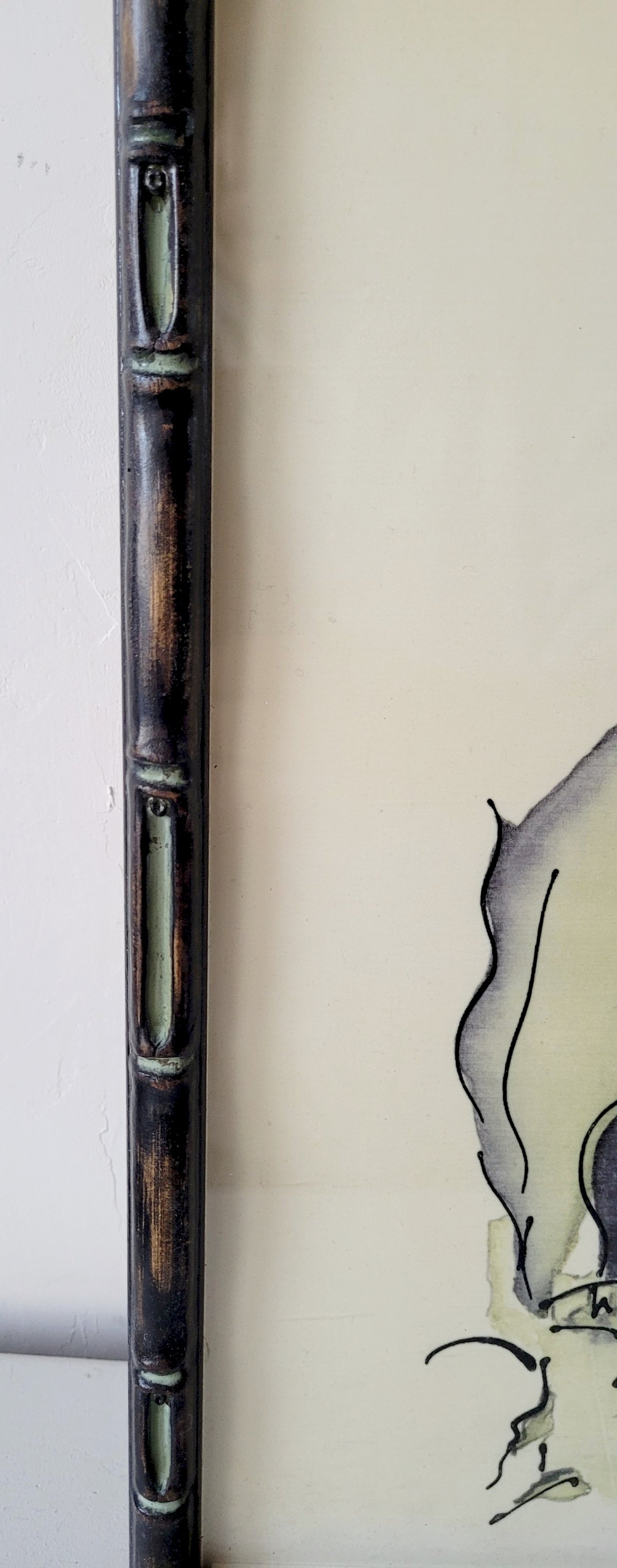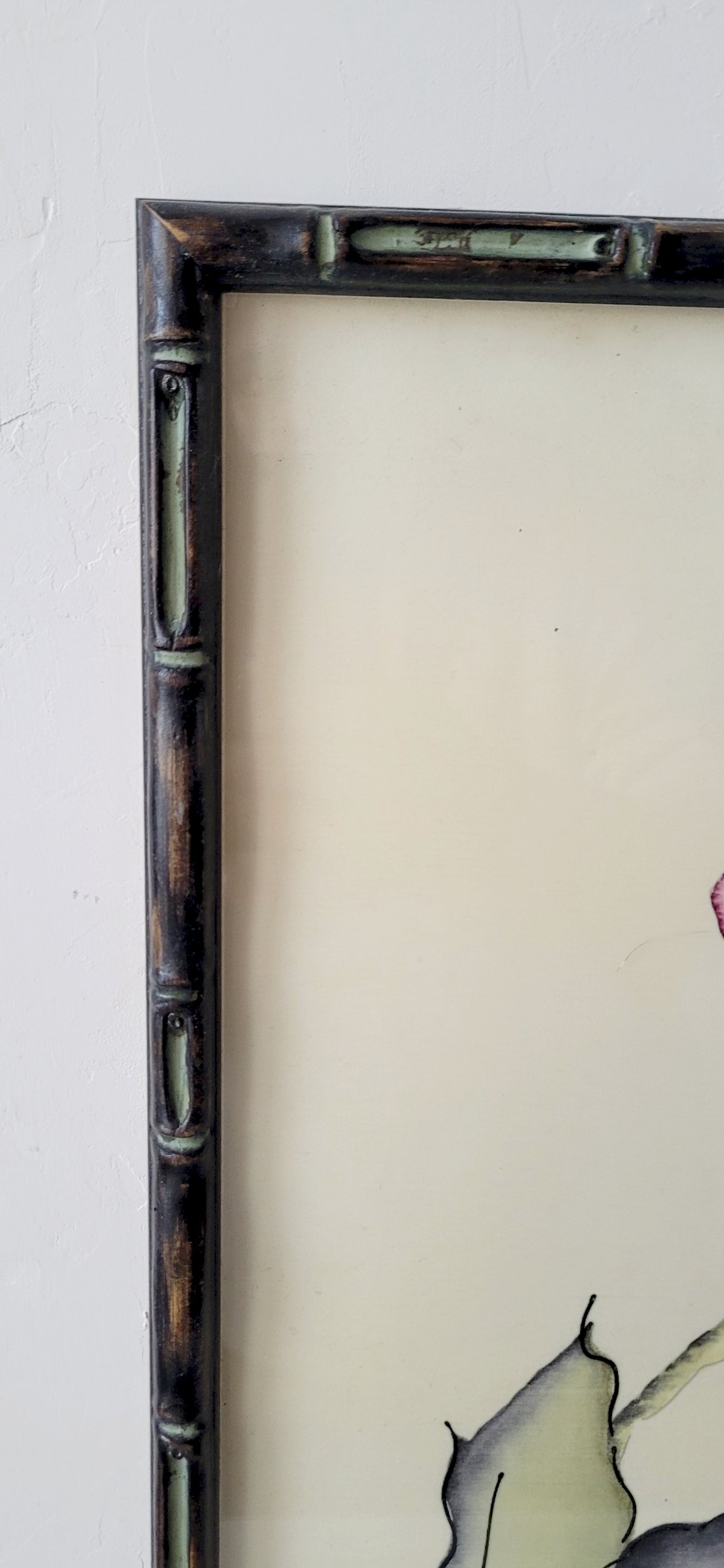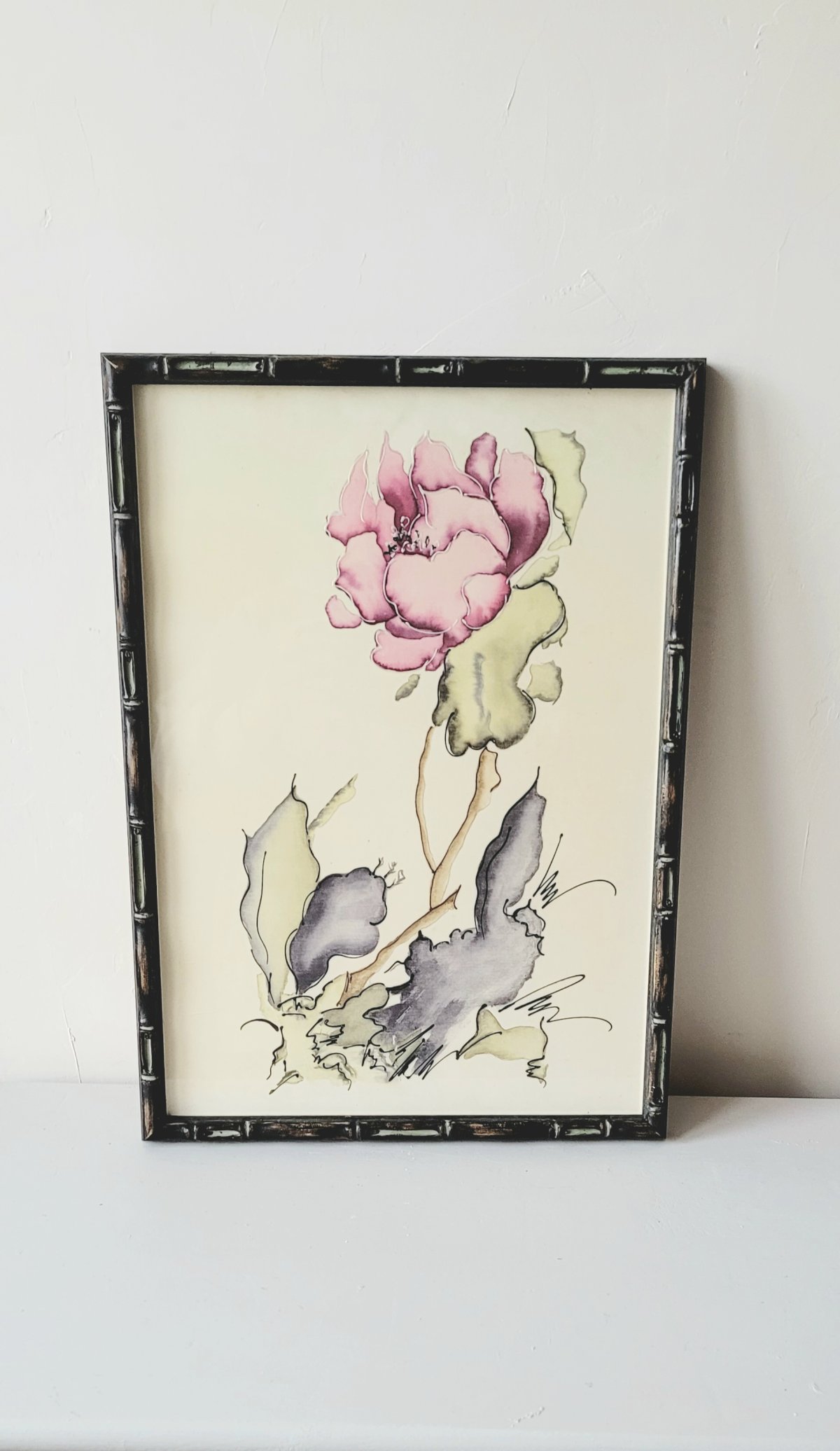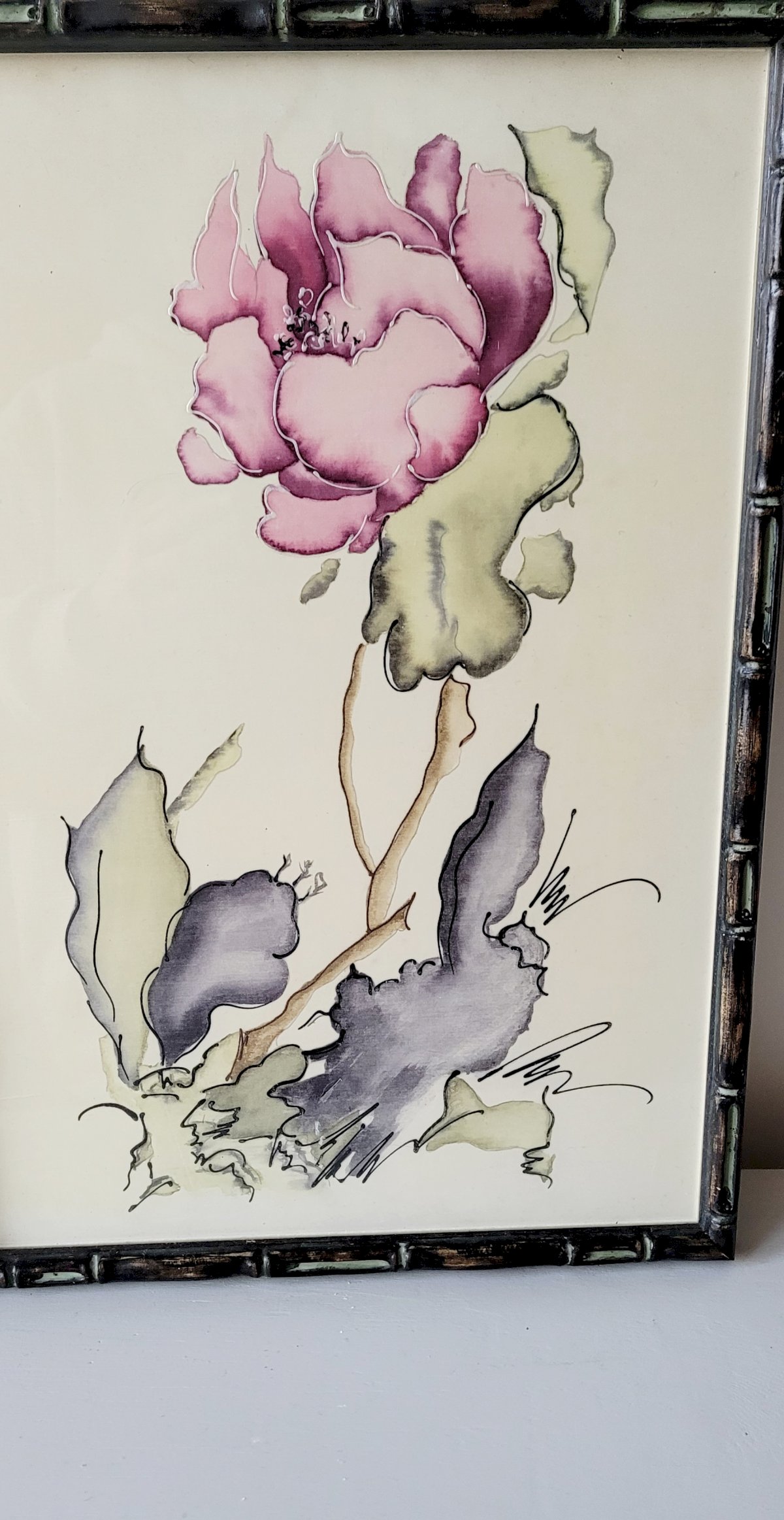 Belle aquarelle florale (pivoine il me semble) dans un cadre imitation bambou, années 60/70.