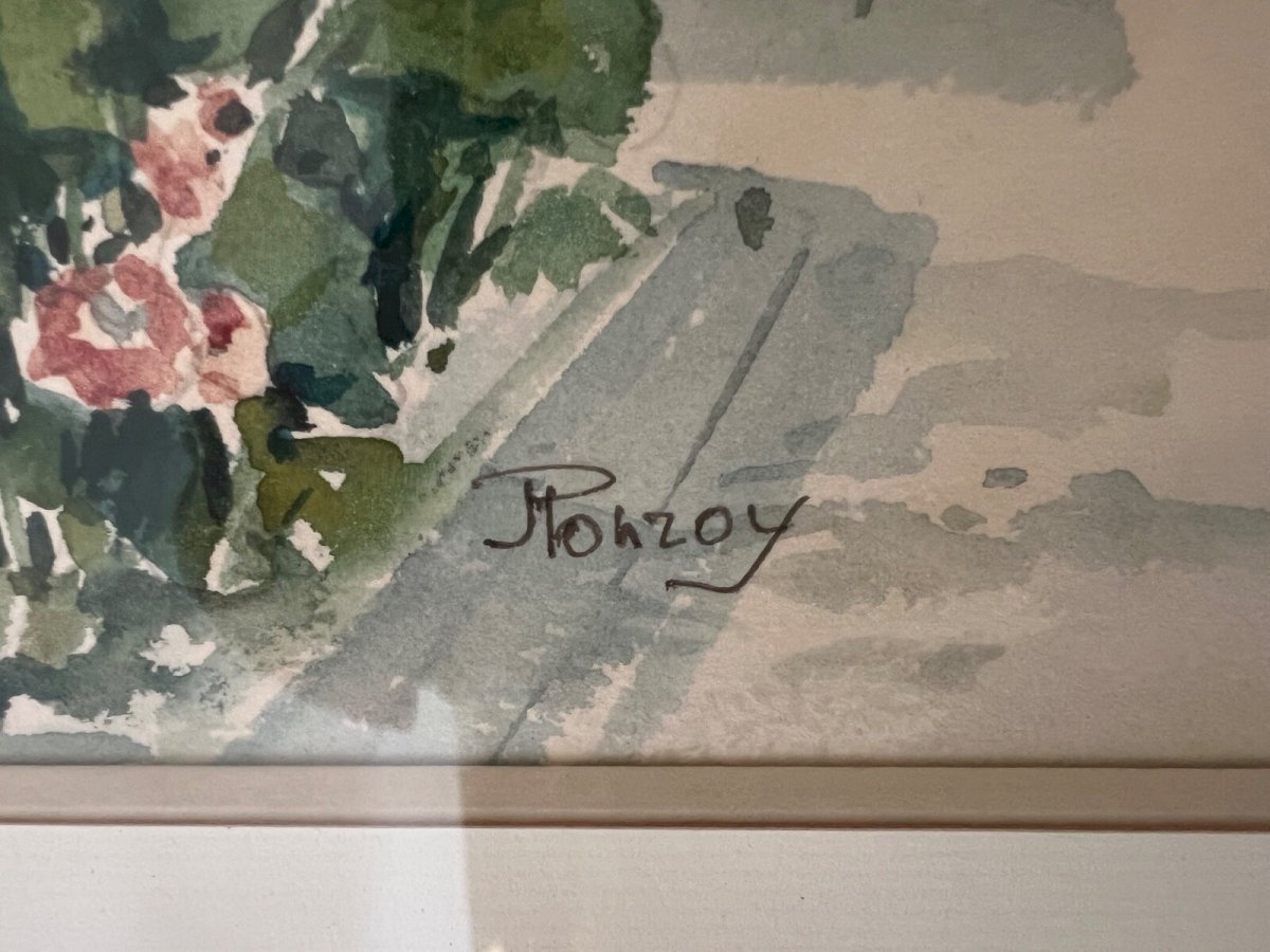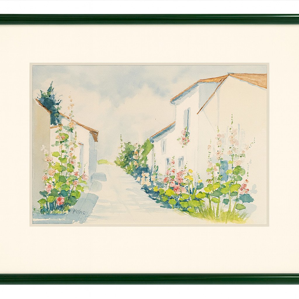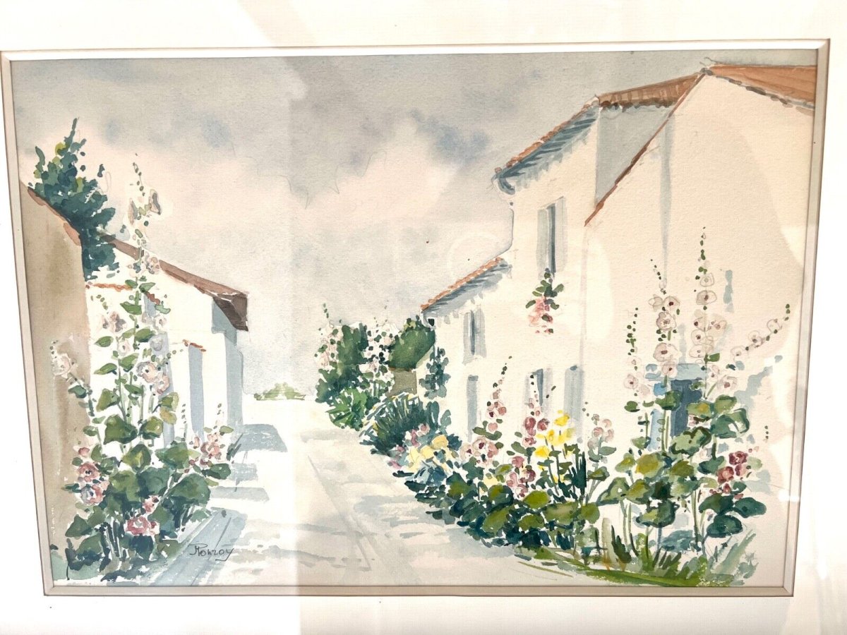 Aquarelle signée Phorzoy – Rue fleurie à Talmont (Vendée) – 49 × 39 cm Charmante aquarelle représentant une rue fleurie de Talmont en Vendée , bordée de maisons blanches et de roses trémières. L’artiste Phorzoy capture avec finesse l’atmosphère ensoleillée et paisible de ce village de caractère. L’œuvre est présentée sous verre, avec un passe-partout et un cadre vert foncé qui met en valeur la délicatesse du trait et la fraîcheur des couleurs. Caractéristiques Technique : Aquarelle sur papier Signature : Phorzoy (bas gauche) Sujet : Rue fleurie, roses trémières, maisons blanches Annotation au dos : “Une rue fleurie de Talmont (Vendée)” Dimensions encadrées : 49 × 39 cm État Excellent état général. ?? ENGLISH VERSION Watercolor signed Phorzoy – Flowered street in Talmont, Vendée – 49 × 39 cm Charming watercolor depicting a flowered street in Talmont (Vendée, France) , with white houses and hollyhocks. Signed Phorzoy , framed under glass with a dark green frame. Size with frame: 49 × 39 cm Excellent condition. Type:Aquarelle Poids:1 Pays d'origine:France Hauteur:39 Style:1980 Genre:Expressionnisme Caractéristiques:Encadré, Signé Thème:Paysage Largeur:49 Artiste:Phorzoy