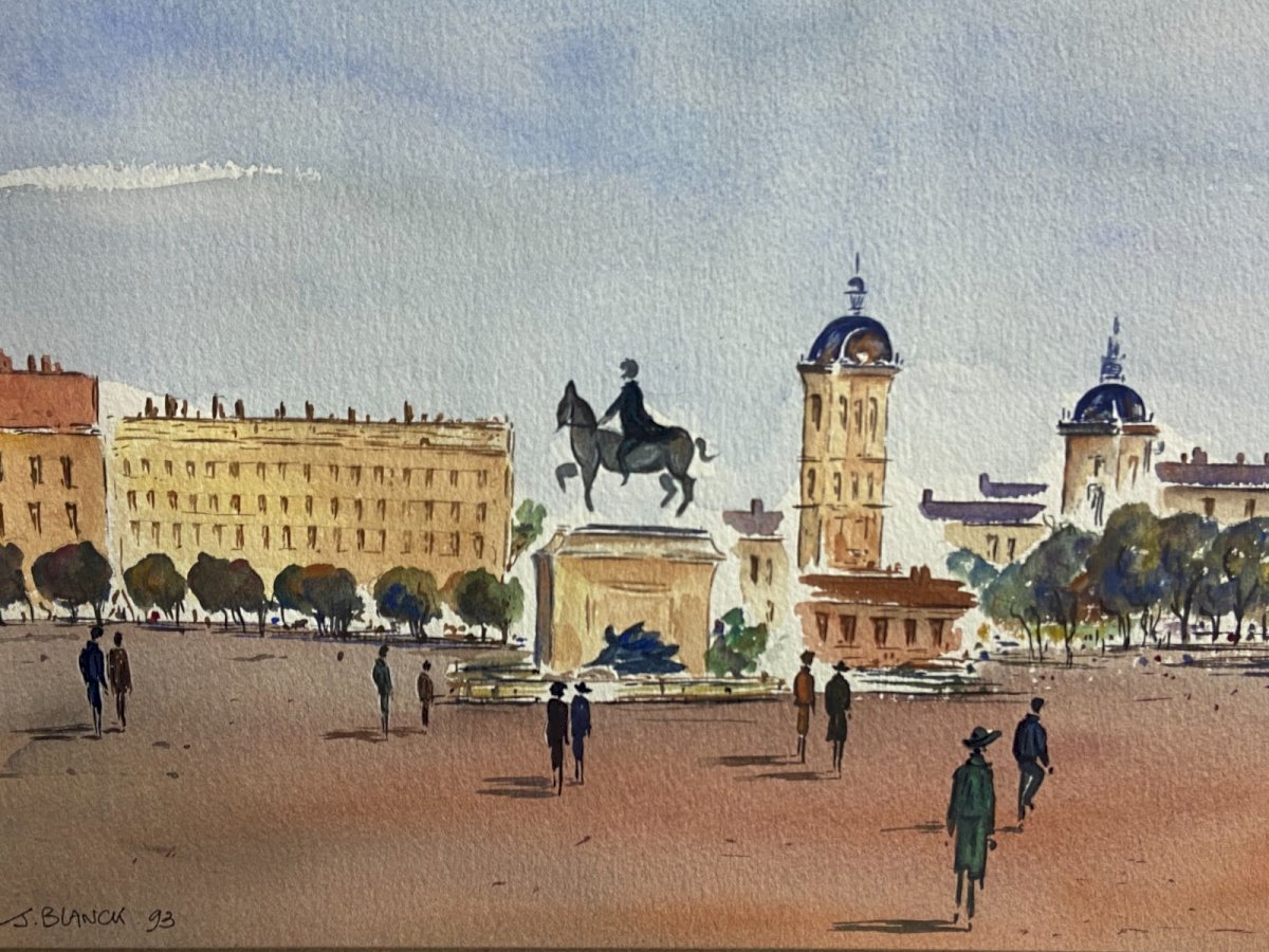 Aquarelle signée J. Blanck 93 vue animée de la Place Bellecourt à Lyon