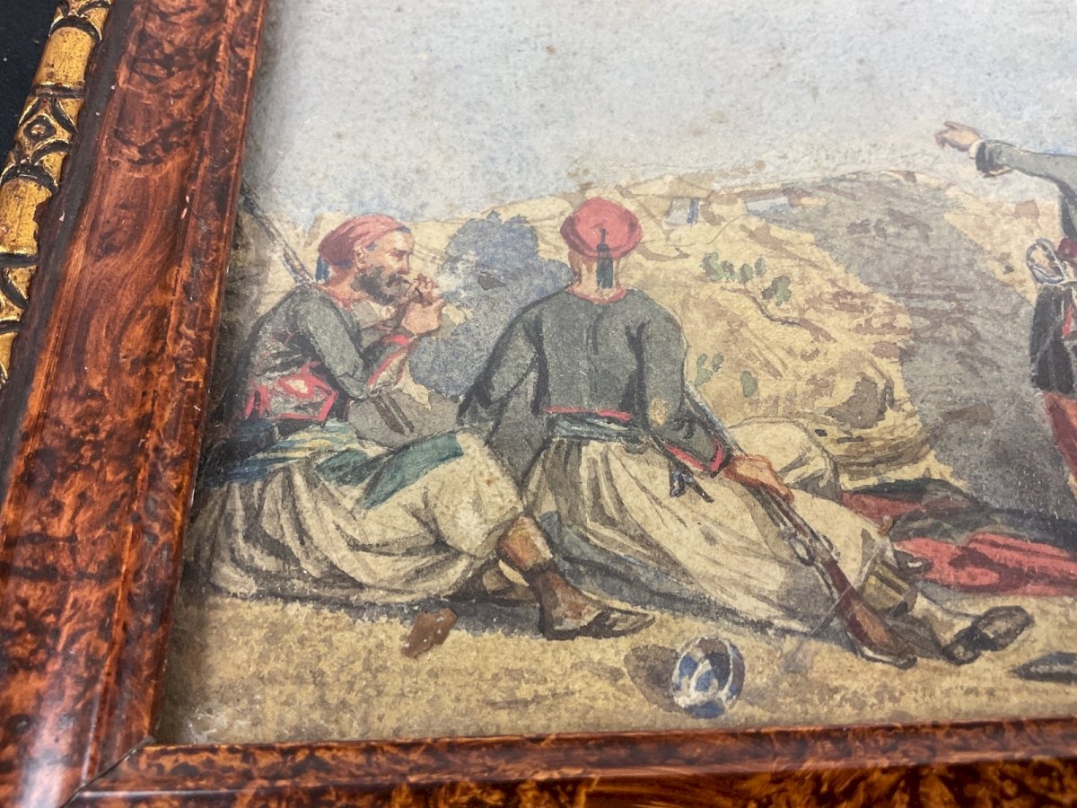 Aquarelle soldats orientalistes avec soldats français en pose  L aquarelle et coller aux verre pas possible de voir s il est signé sans la déchirer  Dimension avec cadre 30 x 18 cm Authenticité:Original Type:Dessin Période:XIXème et avant Matériau:Aquarelle Thème:Personnage