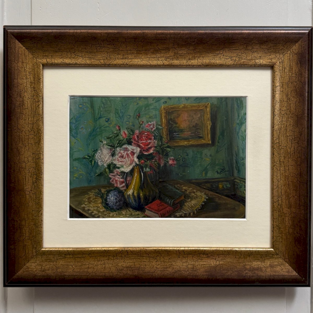 Aquarelle sur papier nature morte bouquet de fleurs XXe par Rivoto A5856 Cette aquarelle signée Rivoto est du milieu du XXe, elle représente un bouquet de fleurs dans son intérieur. Elle est de belle facture et en bon état général. Nos photos vous permettent d’apprécier la qualité de l’œuvre. Pour l’état, merci de bien détailler les photos. N’hésitez pas à zoomer. Les photos font partie intégrante de la description. Dimensions : - Cadre Hauteur : 33 cm Largeur : 39 cm Épaisseur : 2 cm - Œuvre Hauteur : 15,5 cm Largeur : 22,3 cm Je reste à votre disposition pour toute question. Authenticité:Inconnu Poids:Inconnue Type:Aquarelle Pays d'origine:France Hauteur:33 cm Style:Non-spécifié Genre:Inconnu Longueur:cm Caractéristiques:Encadré, Signé Largeur:39 cm Thème:Nature morte