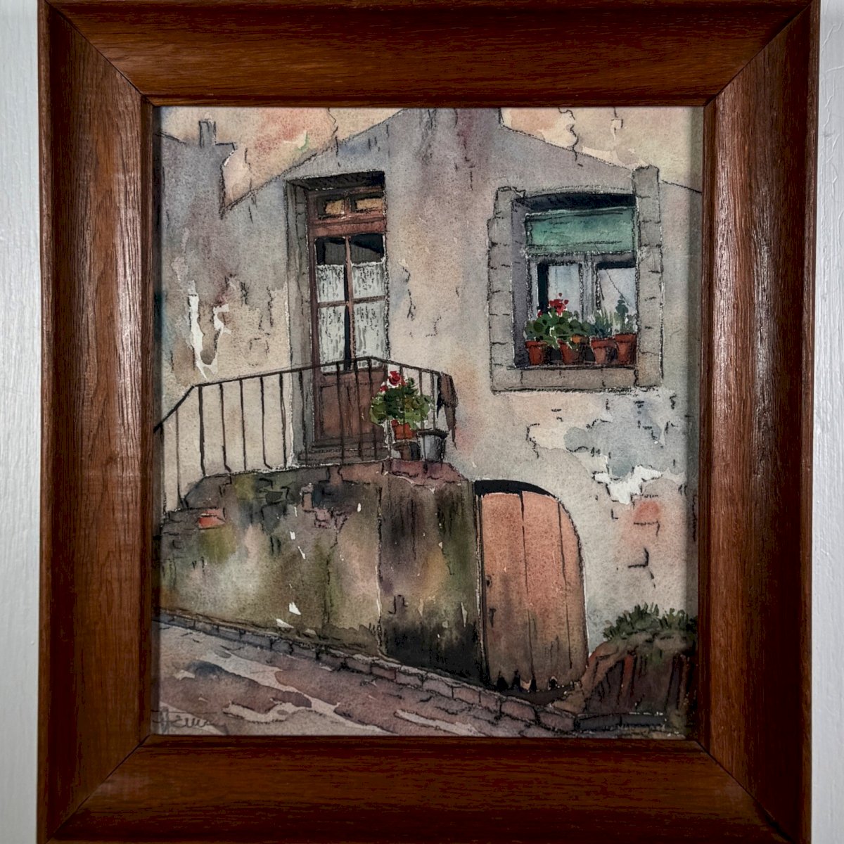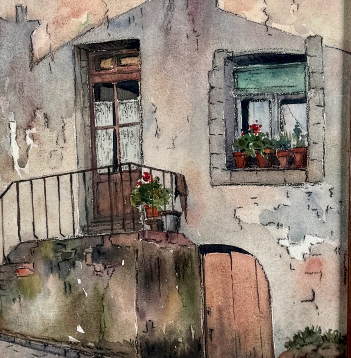 Aquarelle sur papier représentant l'entrée d'une maison début XXe A5849