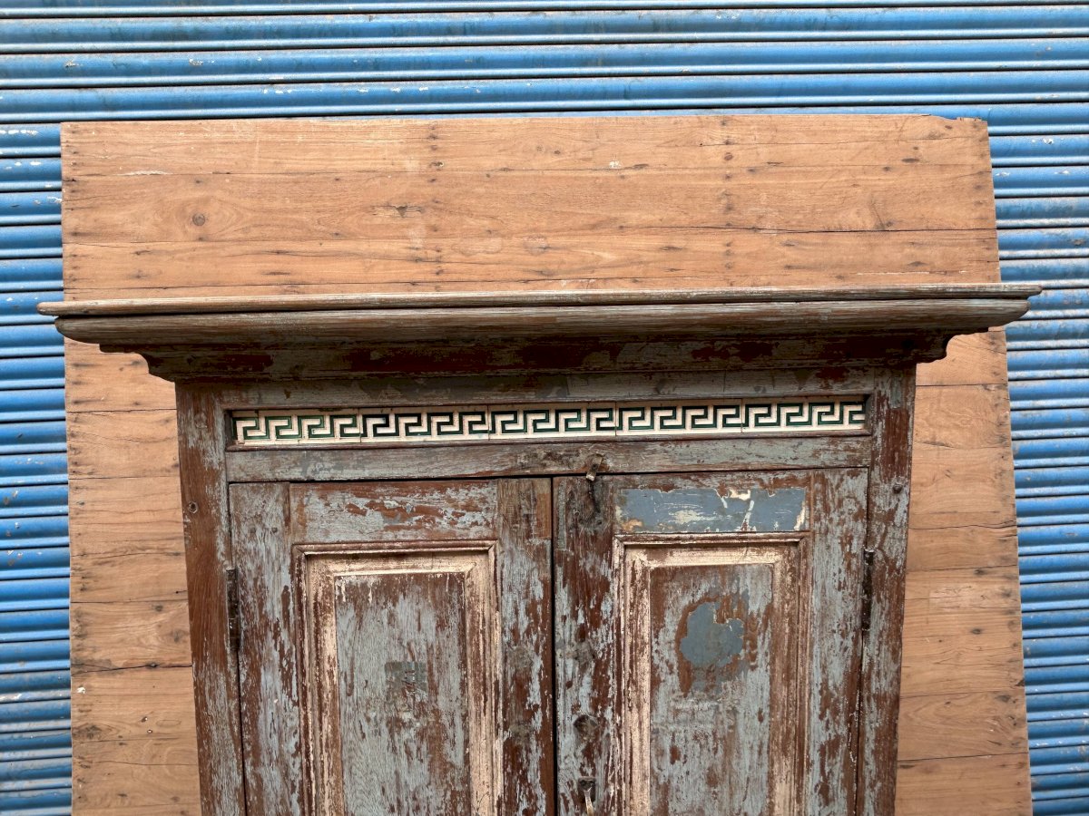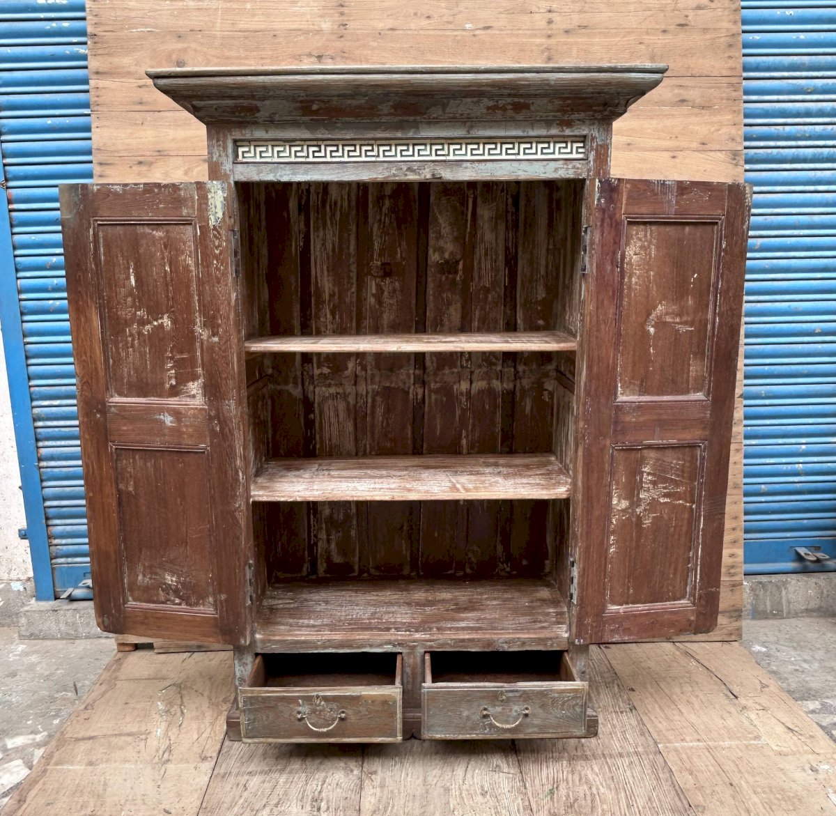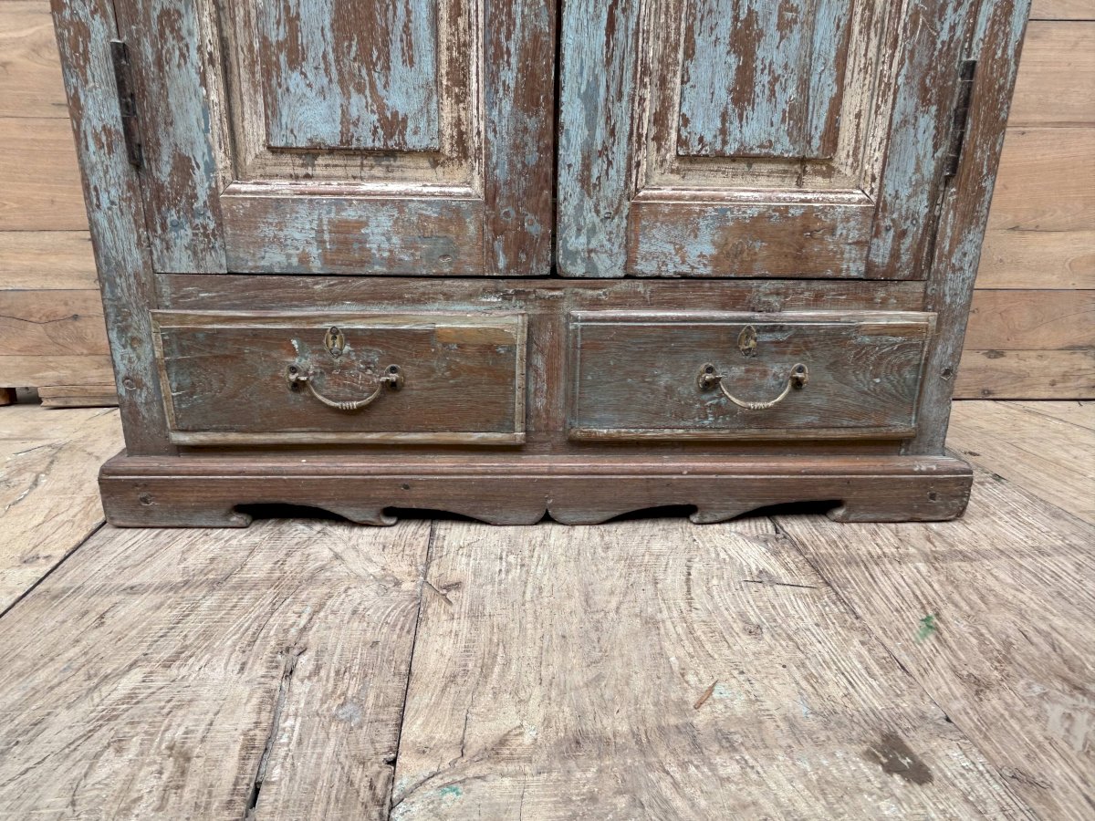 armoire rajasthanaise en teck birman avec patine d'origine / frise en carreau de faïence / 105 x 50 x 156 cm - prof int: 35 cm - haut int de H en B: 36 - 35 - 34 cm - haut tiroir: 10 cm - 109 kg