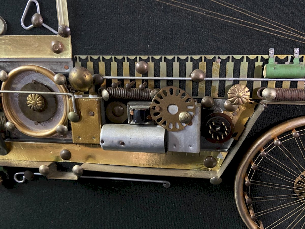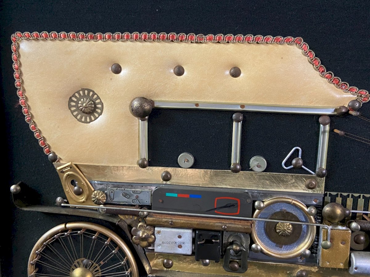 Art d'assemblage, "Junk Art", tableau réalisé à partir d'éléments, de composants et de matériaux industriels de récupérations représentant une Ford T 1908. Dimensions max avec cadre : 63 x 43 cm Poids total : 2416 grammes Très bon état Envoi ultra sécurisé à destination du monde entier - Retrait des commandes possible sur rendez-vous, 7 rue Notre-Dame 18000 Bourges. - Possibilité de groupage au sein d'un même colis : merci de bien vouloir me contacter préalablement afin que je puisse calculer vos frais de transport optimisés. Type:Composition mixte Pays d'origine:France Style:1970 Genre:Pop Art Caractéristiques:Encadré Thème:Automobile