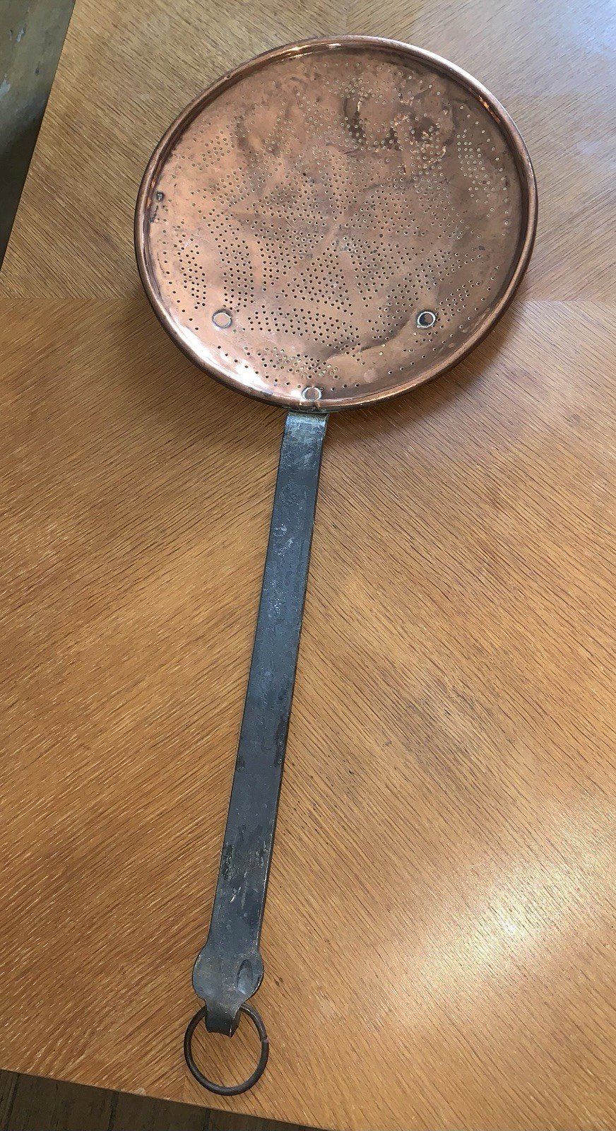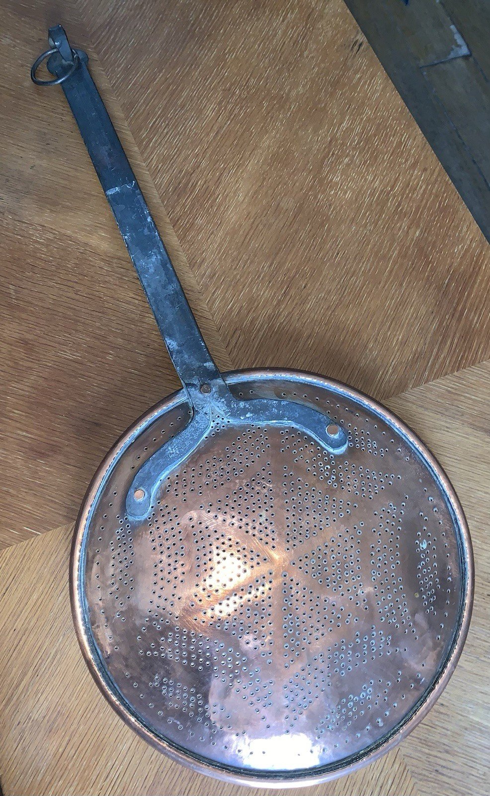 Grande écumoire XVIIIe En cuivre et fer forgé Diamètre:25,5cm Longueur:59,5cm Authenticité:Original Type:Art de la table, Cuisine Origine:France Pays de fabrication:France Sous-type:Ecumoire Matière:Cuivre Style:art populaire