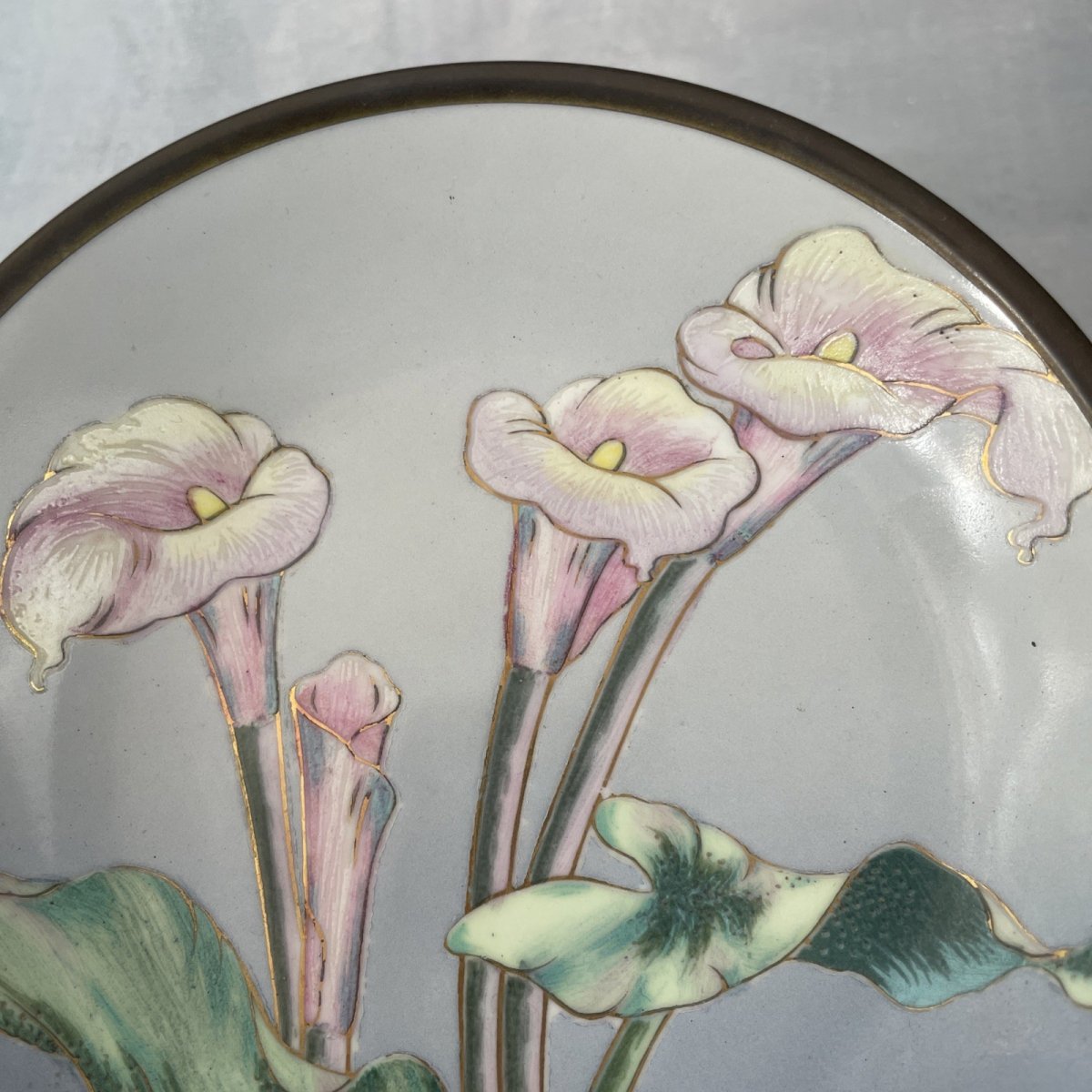 ASIE CHINE MACAO petite assiette porcelaine chinoise et laiton décor floral arum  fleurs ASIA CHINA MACAO small plate Chinese porcelain and brass floral decoration arum flowers Diamètre ~ 14 cm  Poids total ~ 0.2 kg Excellent état, une petite déformation du laiton, voir photos. Pensez à grouper vos achats pour réduire les frais de port ! Pays d'origine:Chine
