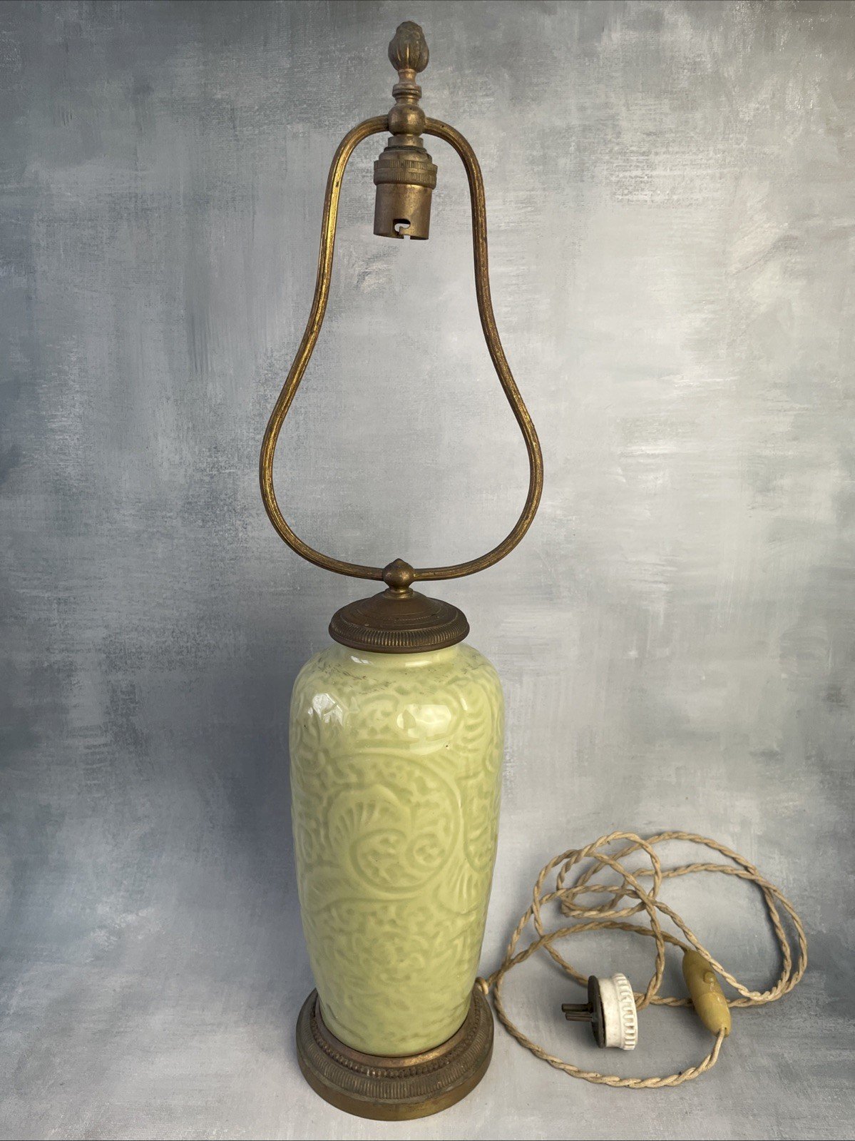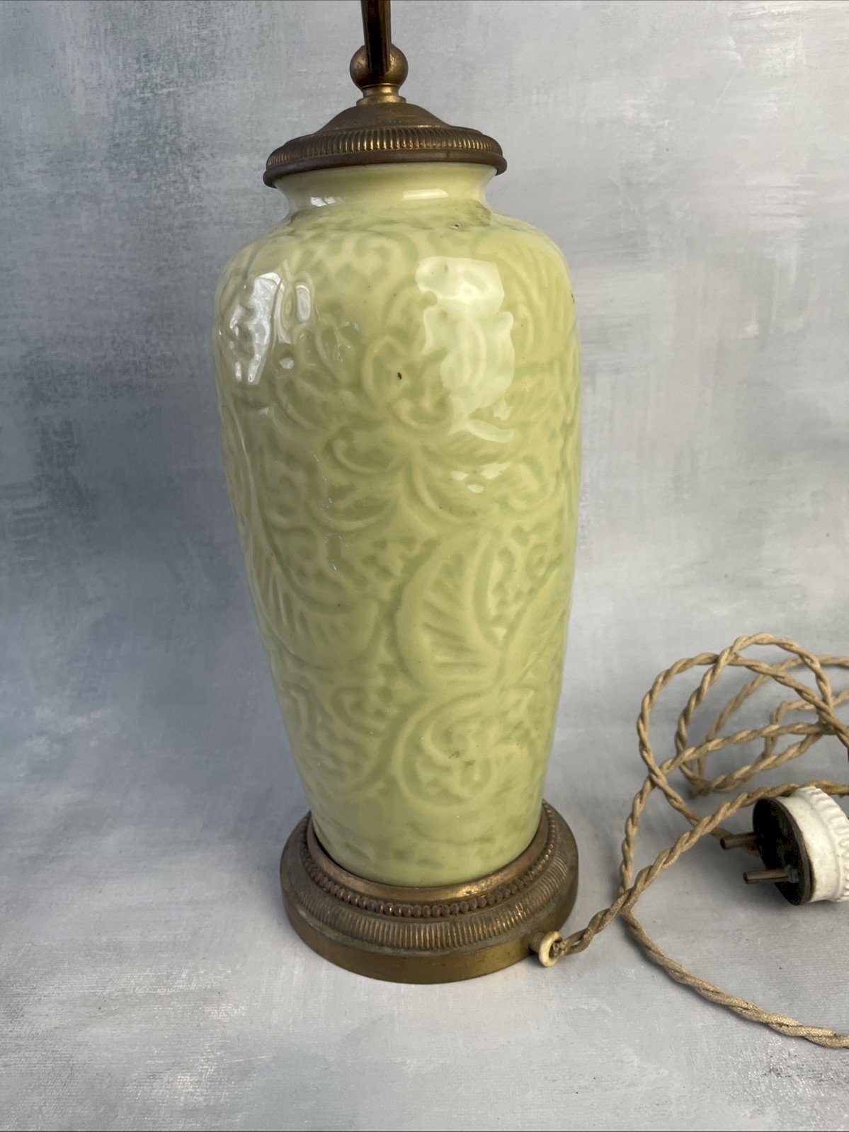 ASIE CHINE vase ancien lampe céladon décor végétal stylisé, XIXe ou plus vieux ? non marqué ASIA CHINA antique celadon vase/lamp with stylized plant decoration, 19th century or older? unmarked Hauteur total ~ 49.5 cm Hauteur vase ~ 20.5 cm Diamètre base ~ 10 cm Poids total ~ 1.5 kg Rayures, partie métallique a nettoyer ou changer, électrification ancienne à revoir (vendu en l'état, non testé et sans garanti), voir photos. Pensez à grouper vos achats pour réduire les frais de port ! Pays d'origine:Chine