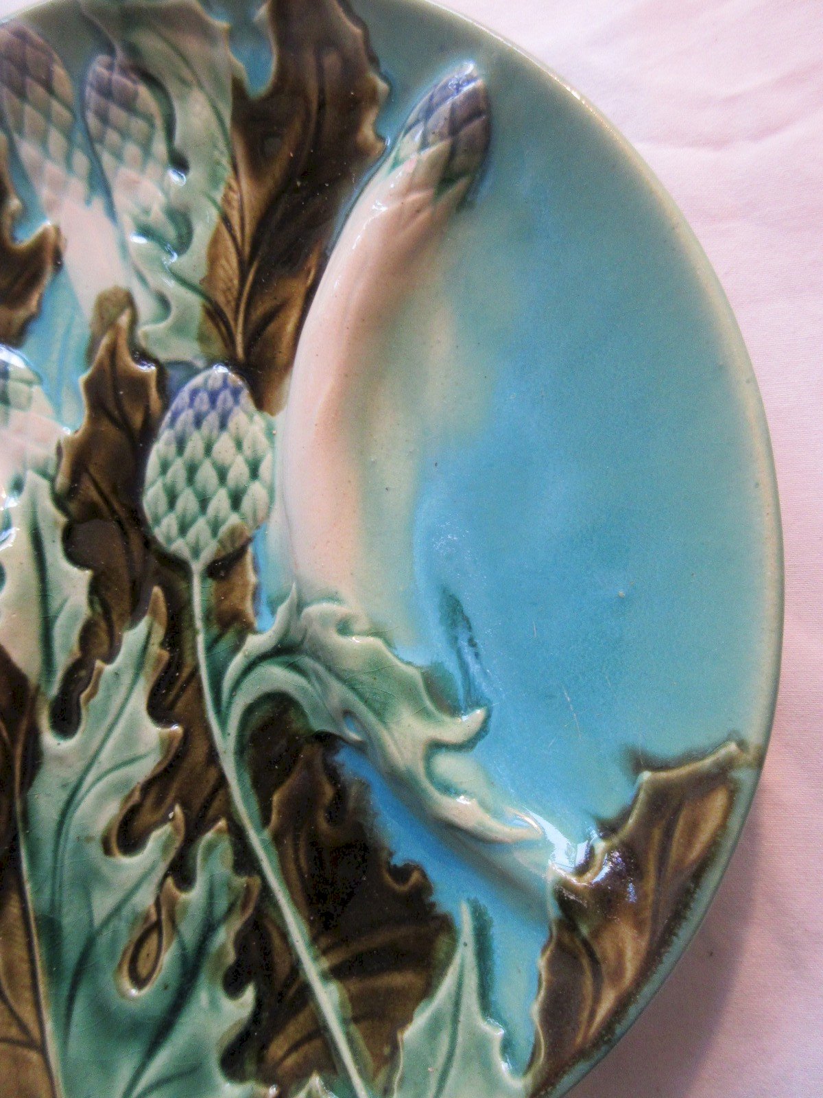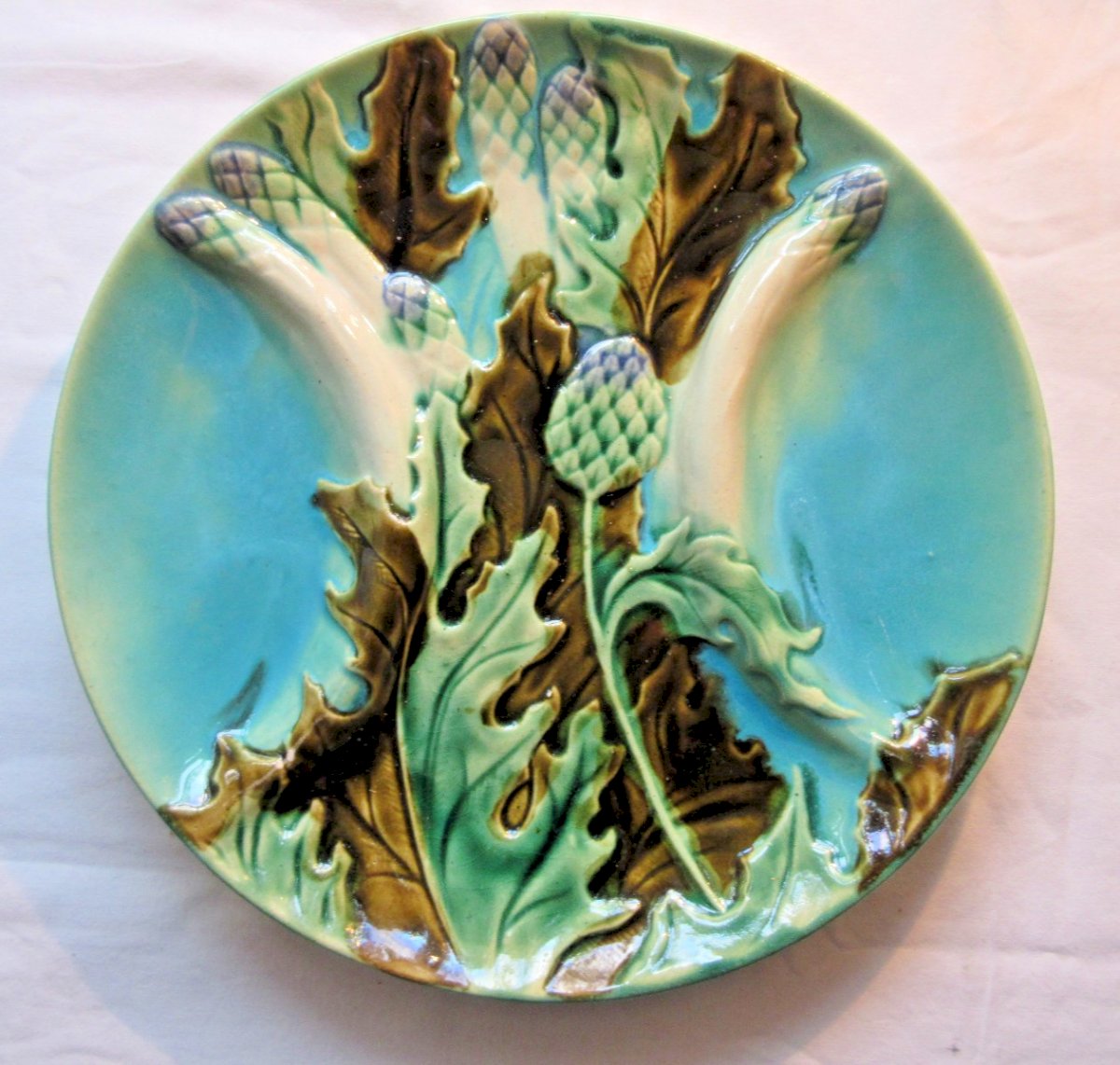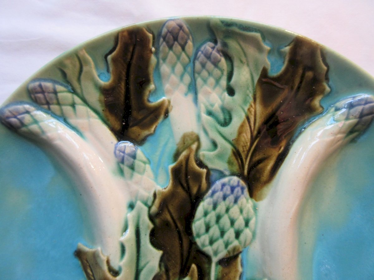 Assiette à asperges en barbotine Salins les Bains, asperges et artichauts