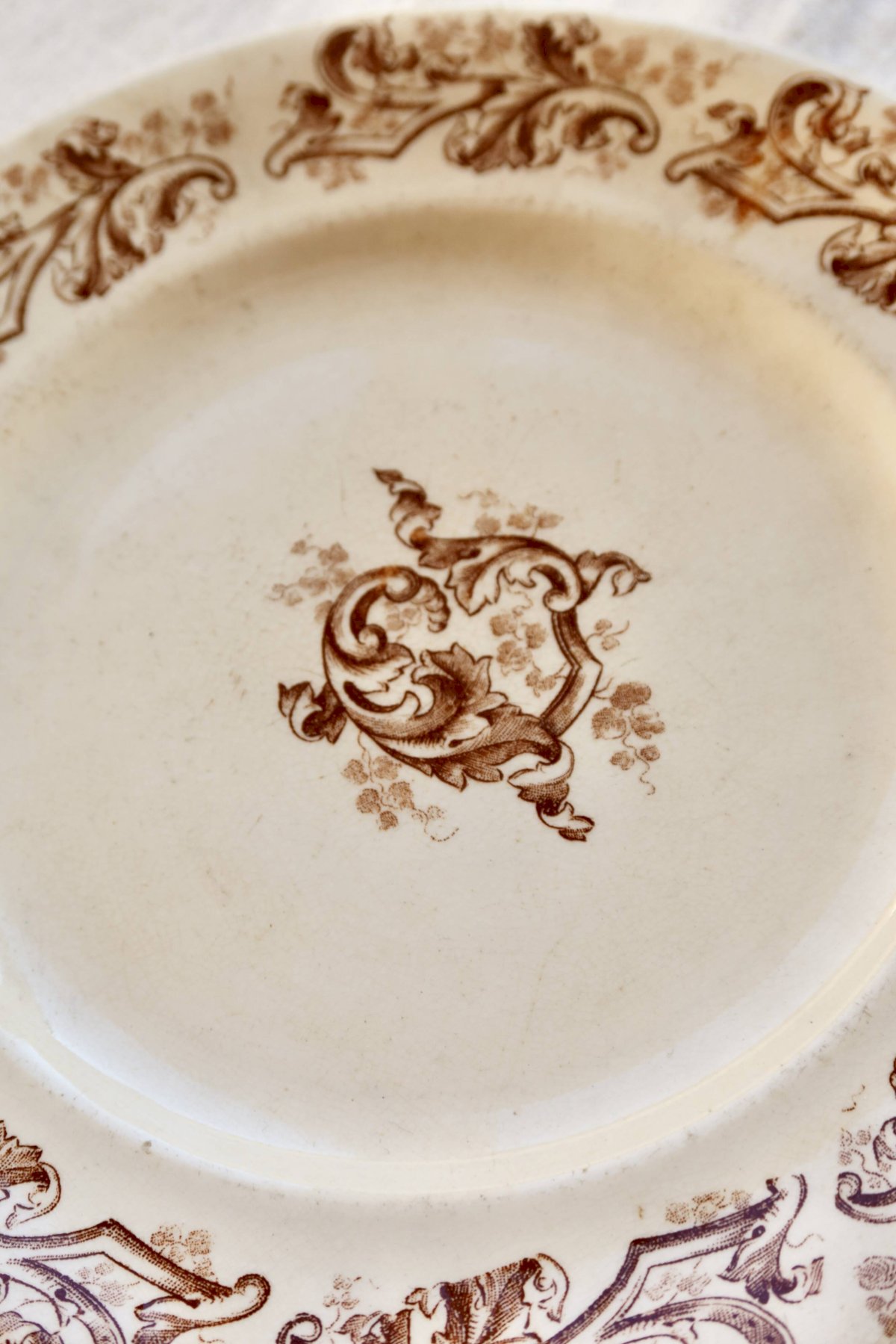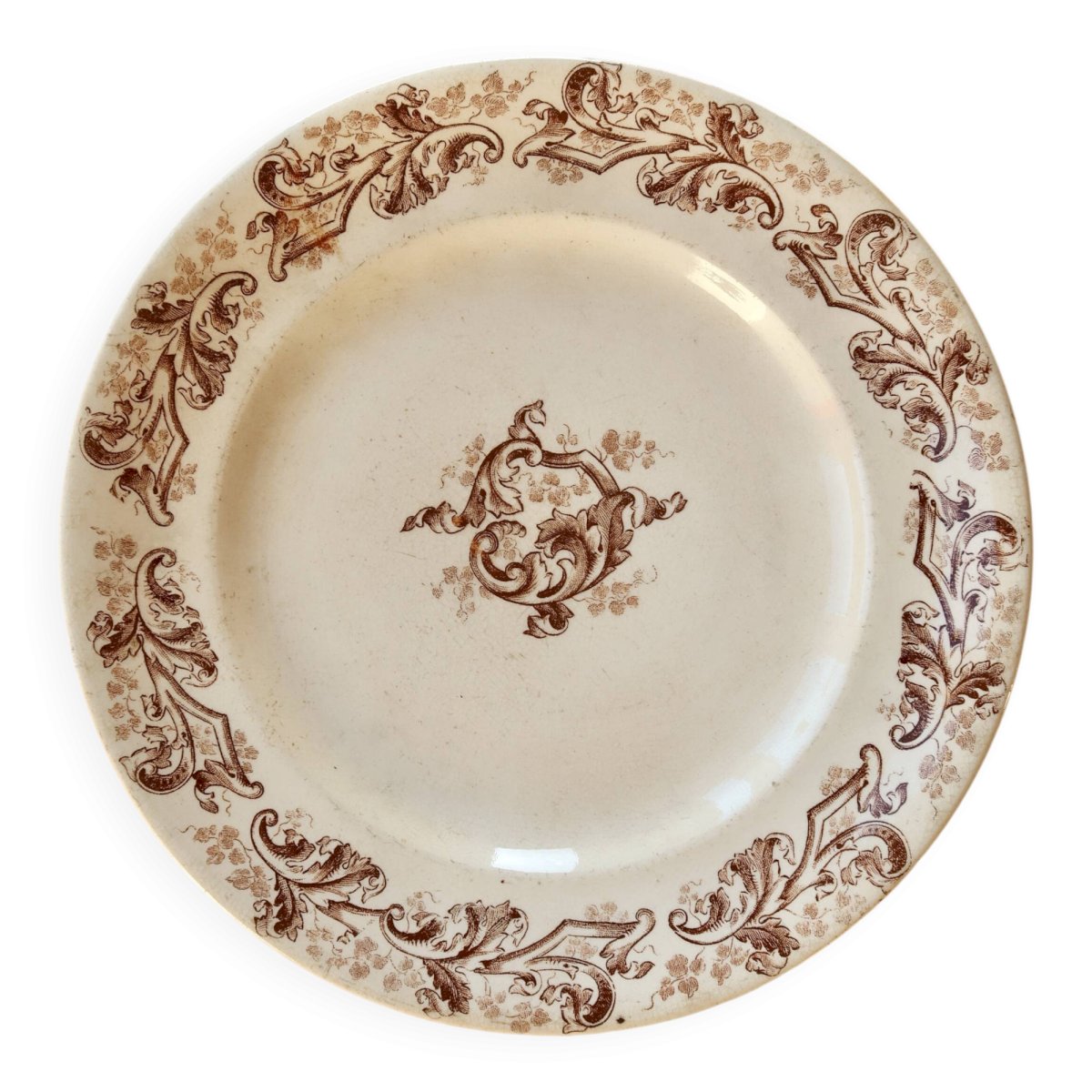 Assiette à dessert ancienne en terre de fer de la faïencerie de Longwy, décorée du modèle Russe aux élégants motifs végétaux bruns disposés sur le marli et en son centre.
