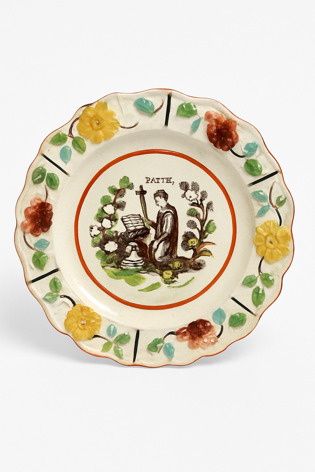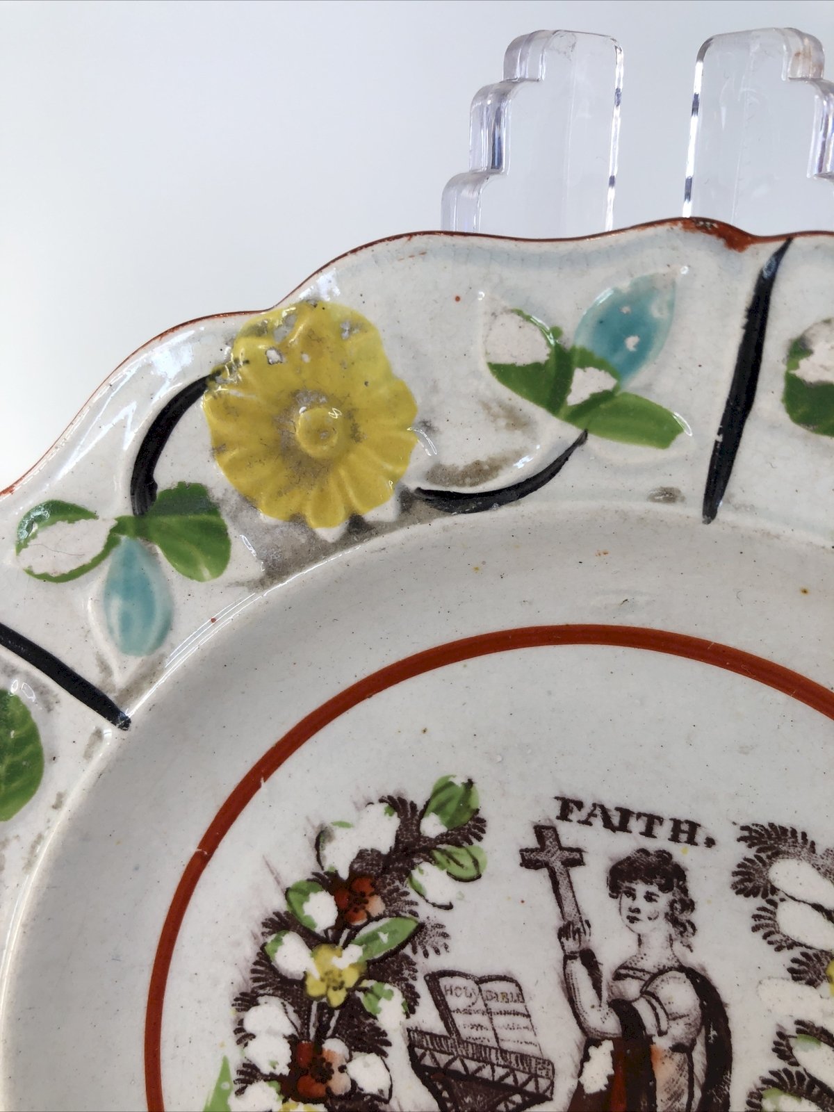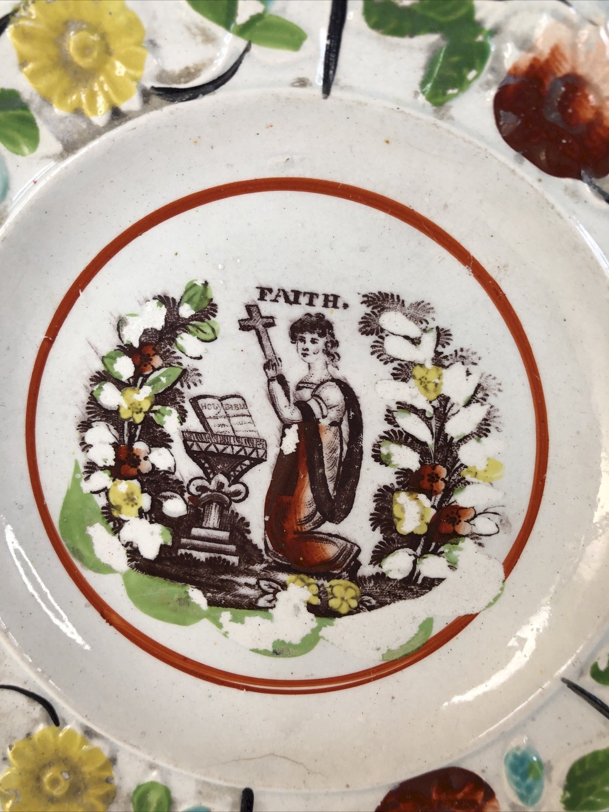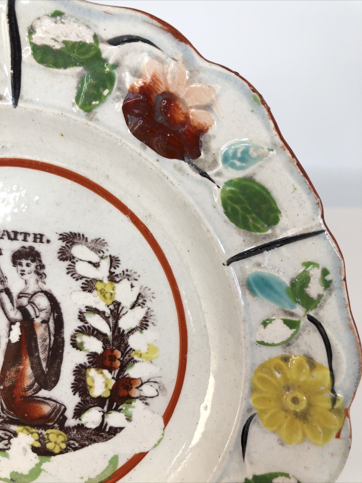 Cette assiette ancienne anglaise porte en son centre une scène religieuse rare, marquée du mot “FAITH” — la Foi. Une jeune femme agenouillée, un autel, des branches fleuries : tout semble murmurer une prière venue d’un autre siècle, un écho de ferveur douce qui traverse le temps. Le marli est décoré de fleurs en barbotine , modelées et peintes à la main : jaunes, brunes, vertes, turquoise… Un décor typique des faïences anglaises du début du XIXe siècle, vibrant encore sous la patine du temps. Caractéristiques Origine : Angleterre Période : début 19e siècle Décor : scène religieuse “FAITH” + fleurs en barbotine Matière : faïence Technique : imprimé central + barbotine polychrome Diamètre : env. 17 cm (≈ 6.7 inches) État : petits manques de décor cheveu au verso usure du temps cohérente avec l’âge Pièce authentique et décorative , idéale pour collection ou intérieur ancien. Pays d'origine:Royaume-Uni