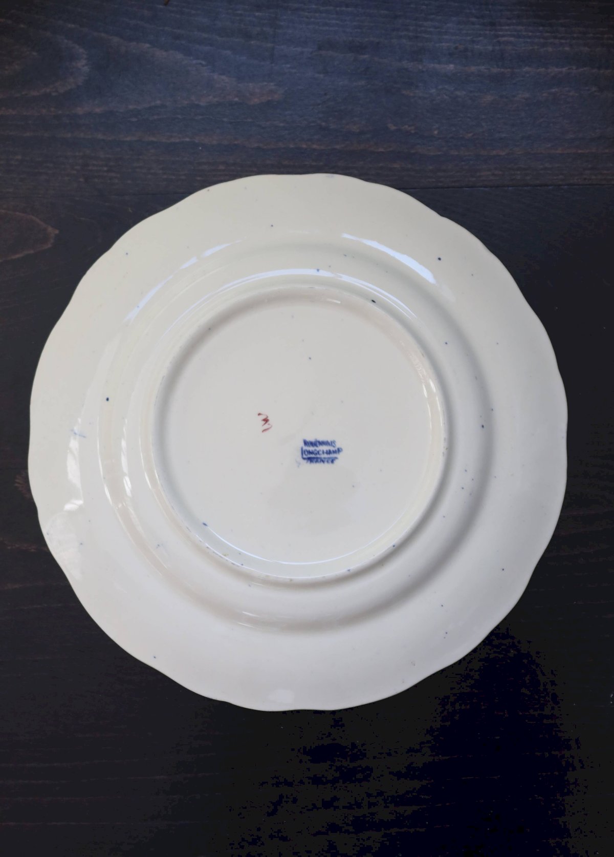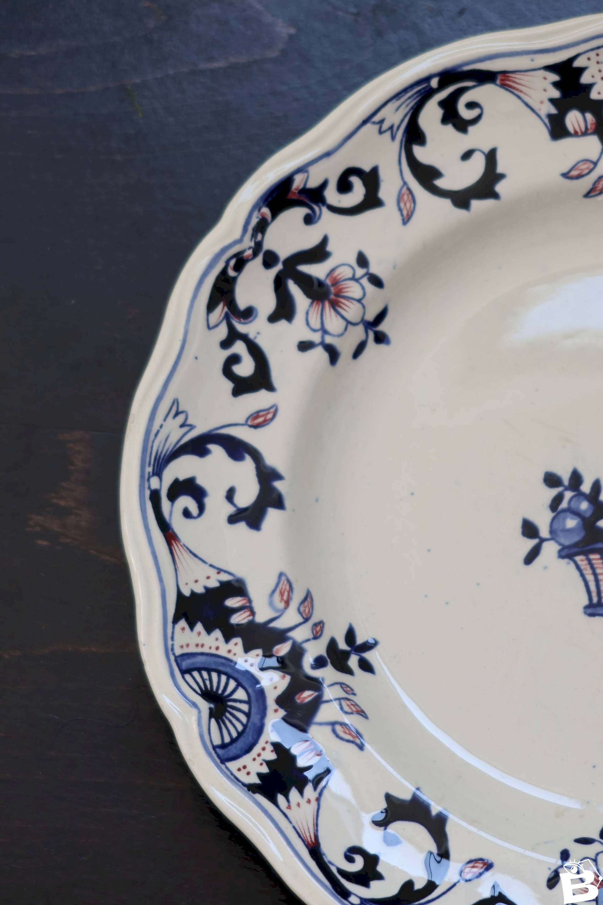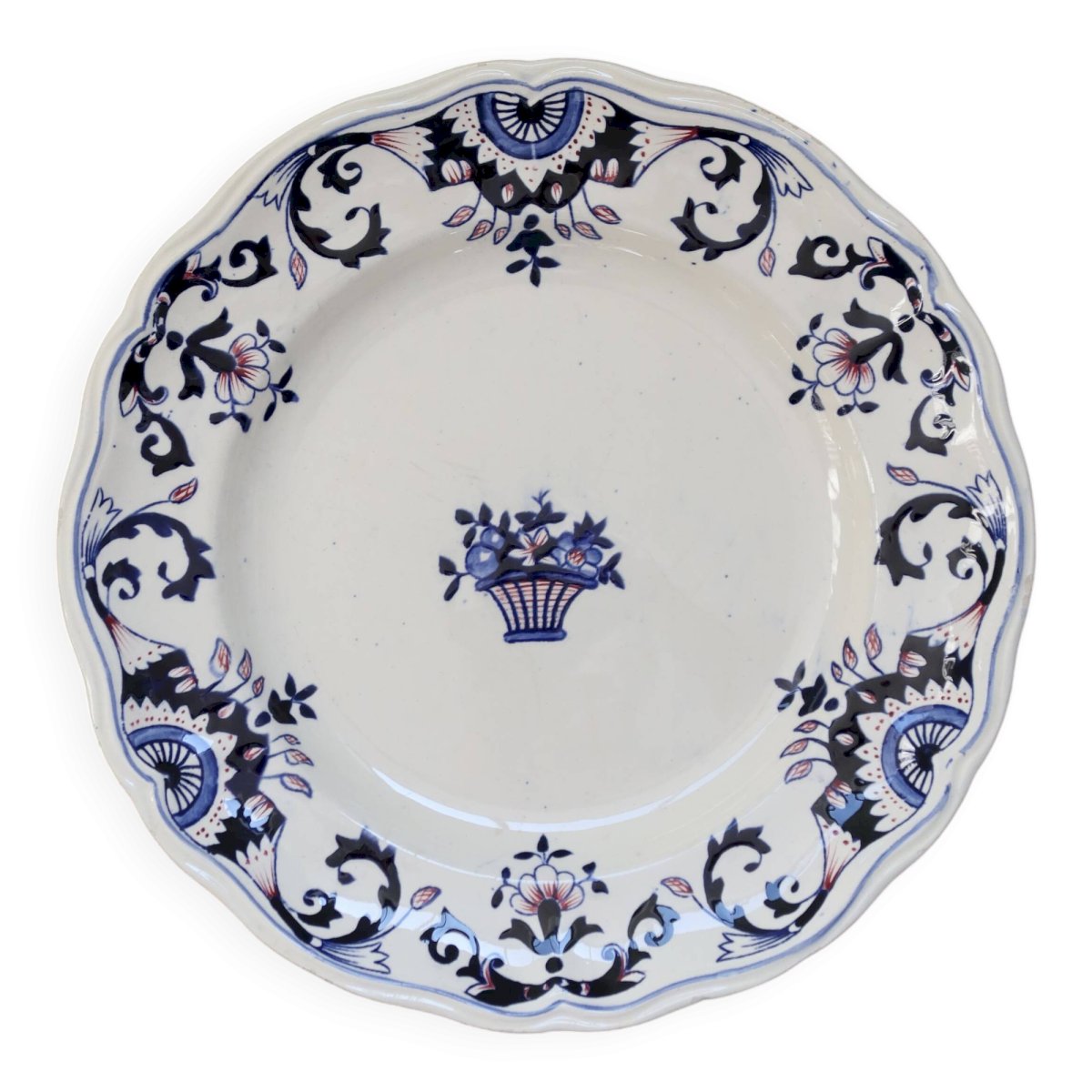 Superbe assiette plate Longchamp, décor Rouennais: panier fleuri au centre, large aile festonnée ornée de volutes et fleurettes bleu nuit, noir et rouge.