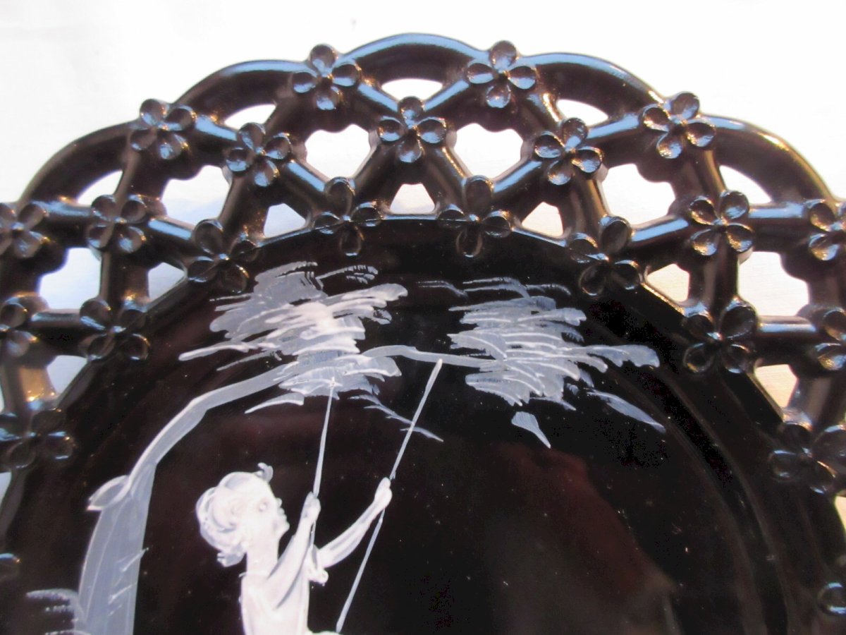 Vente dans le monde entier. Assiette opaline Art Déco. Belle assiette décorative en opaline noire. Le tour est ajouré de croisillons avec des petites fleurs  à chaque croisement. Décor blanc représentant une fillette et son petit chien, faisant penser au style Marie-Grégory. Diamètre: 21,5 cm. Bon état. A collectionner ou à offrir.