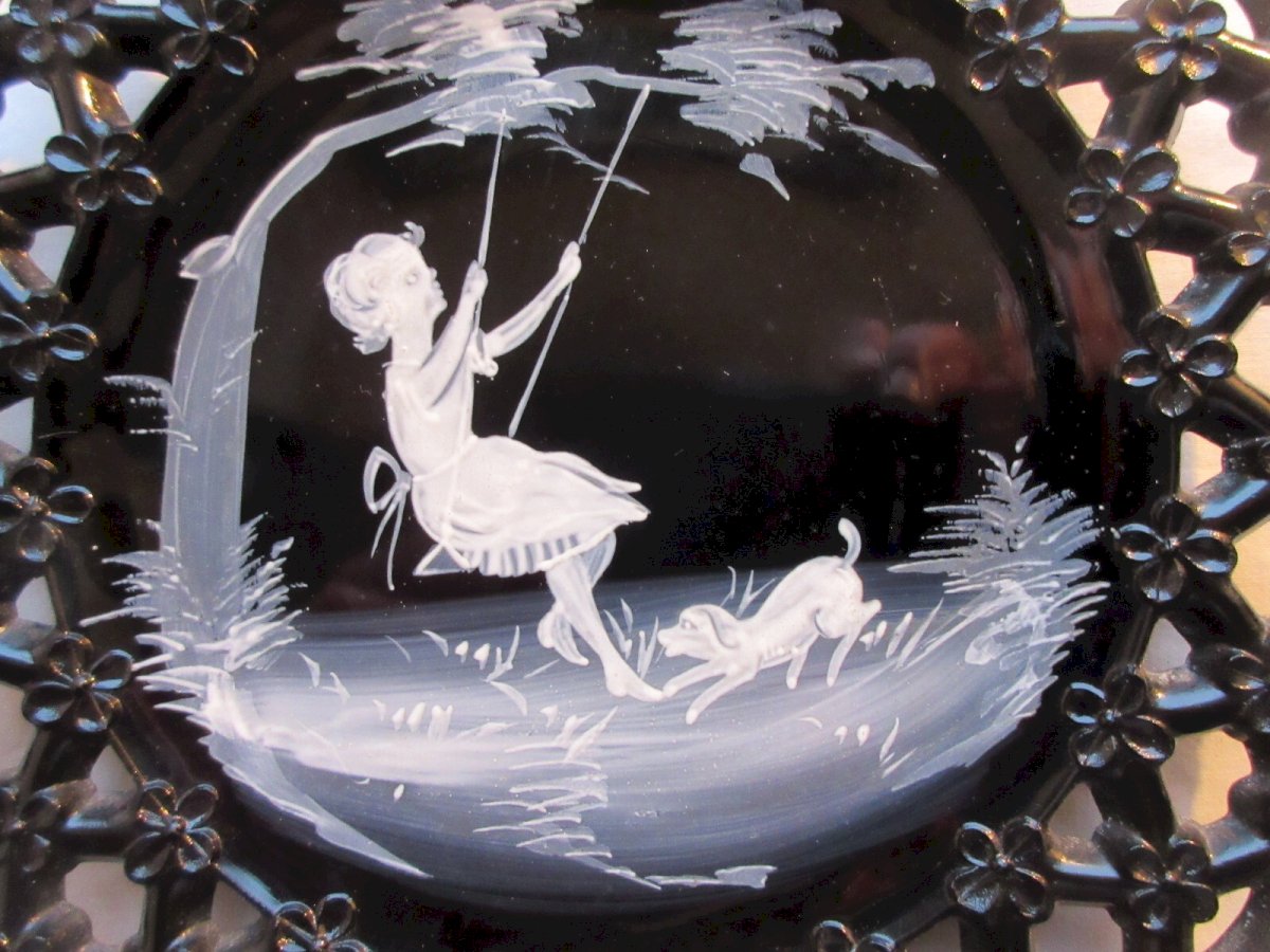Assiette décorative Art Déco, opaline noire ajourée, Fillette et son Petit Chien