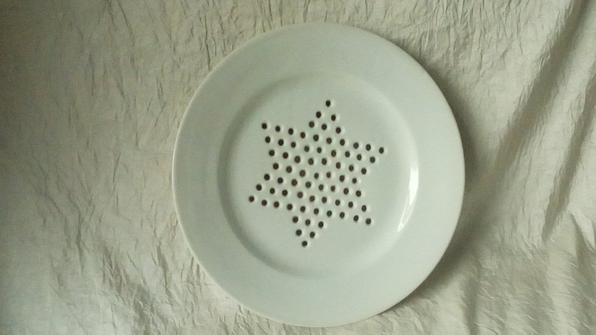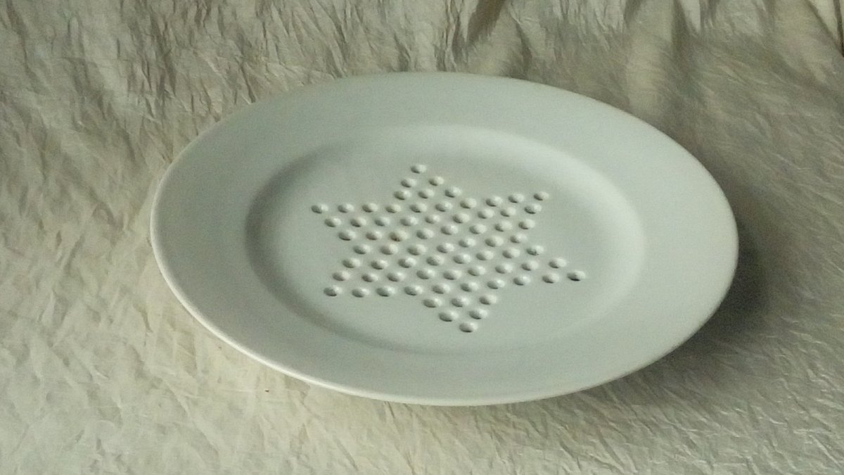 TRES BEL ÉGOUTTOIR  EN PORCELAINE POUR FRUITS APPELER AUSSI FRAISIER DECOR ÉTOILE HAUTEUR 3 cm DIAMETRE 25.58 cm EN BON ÉTAT Pays d'origine:France