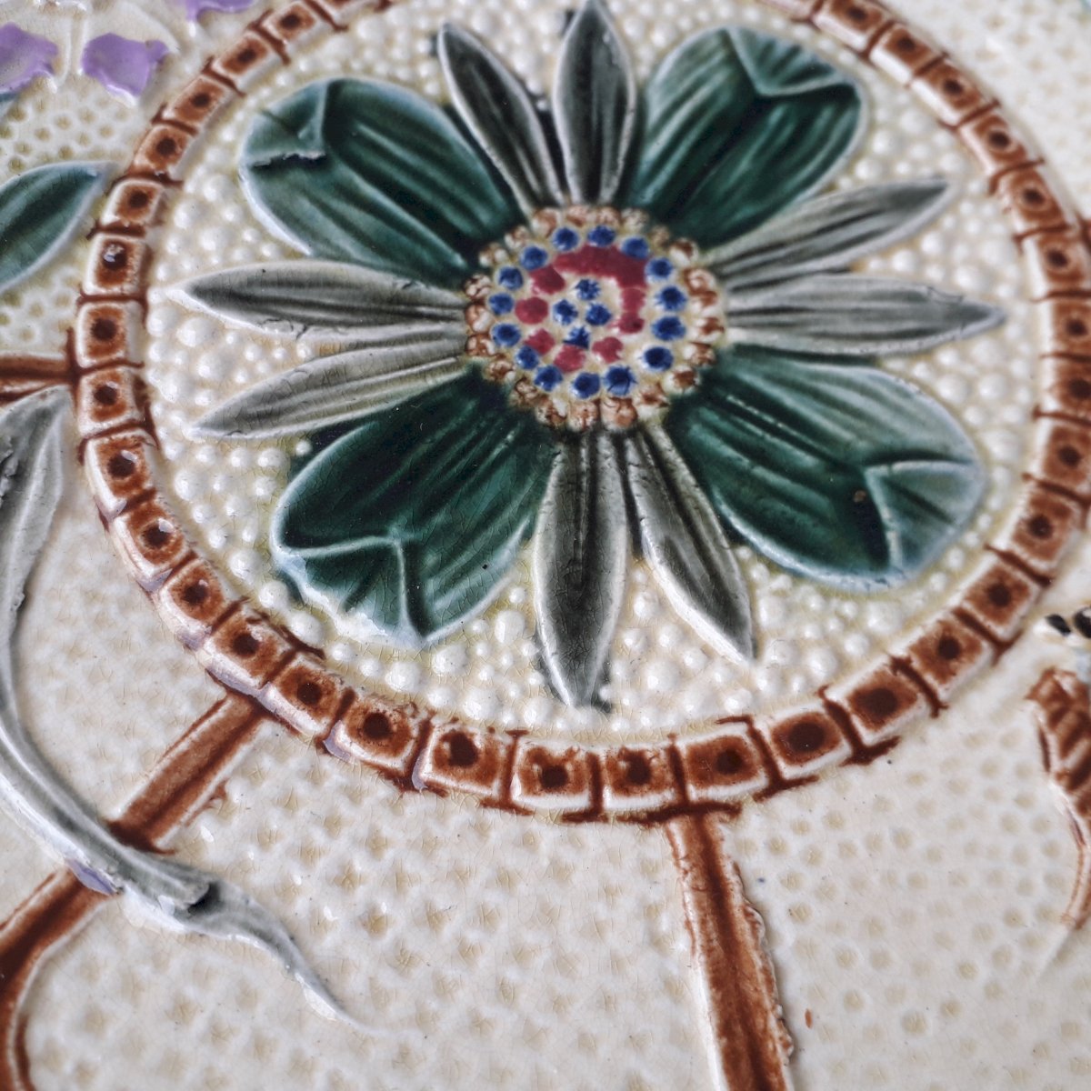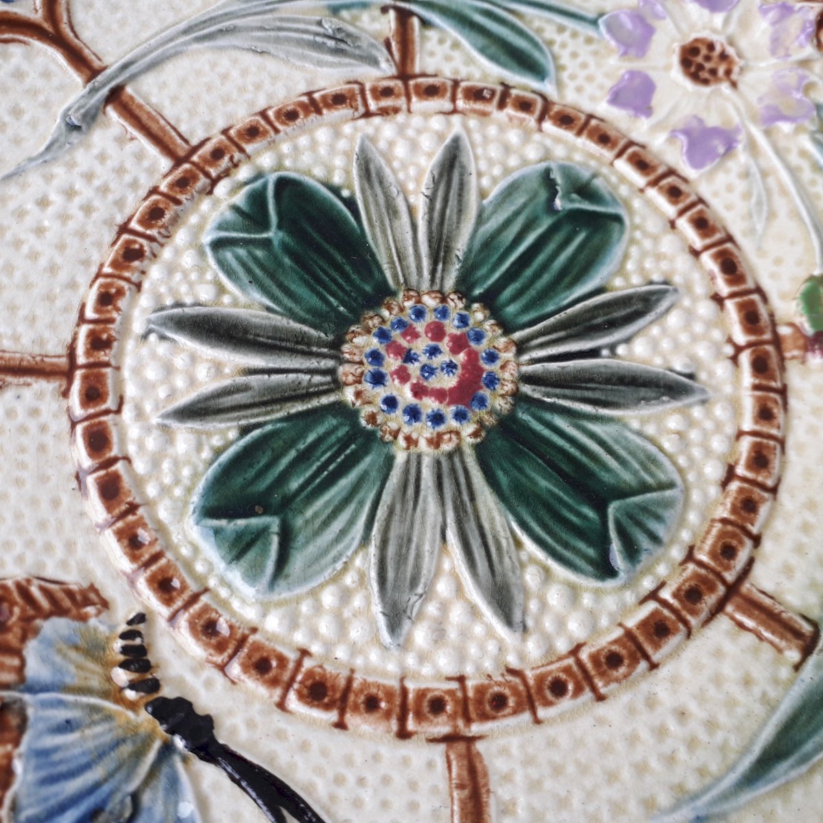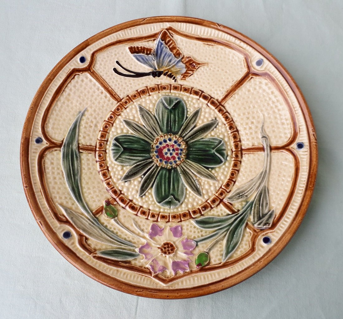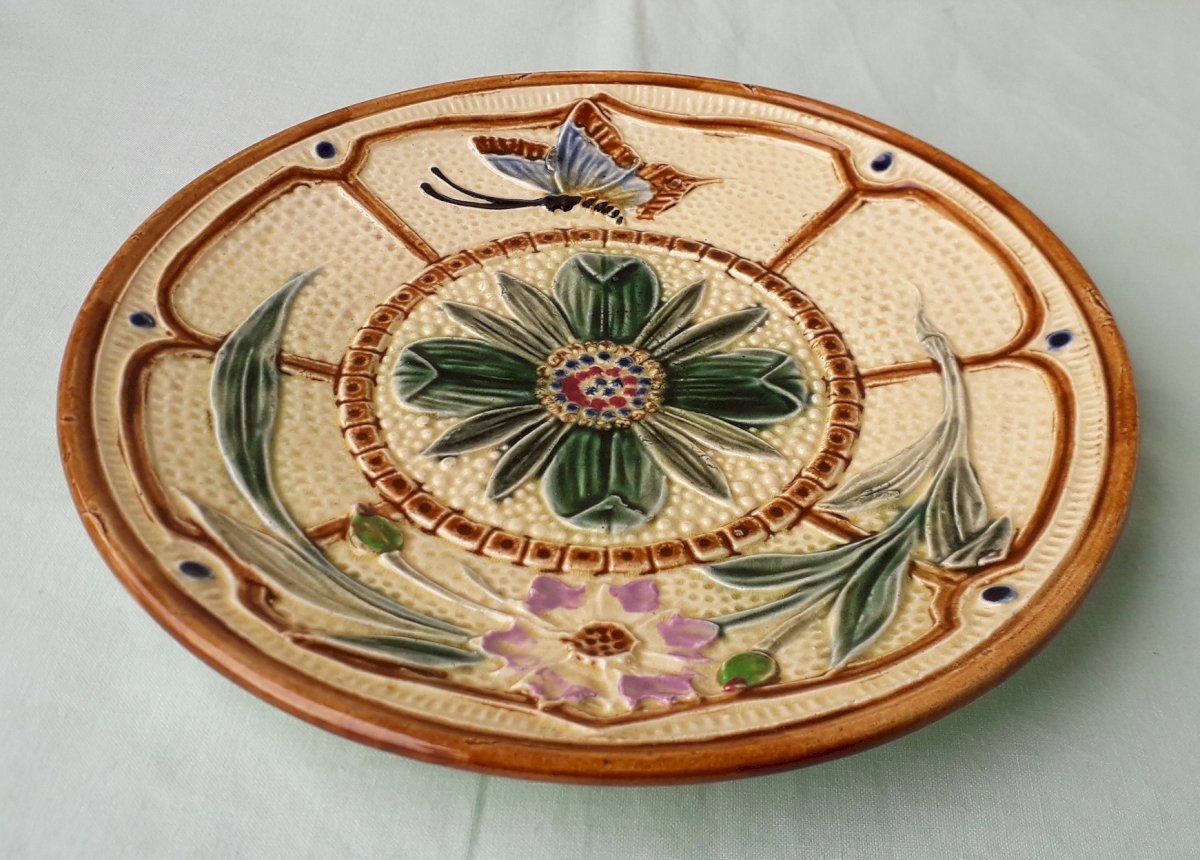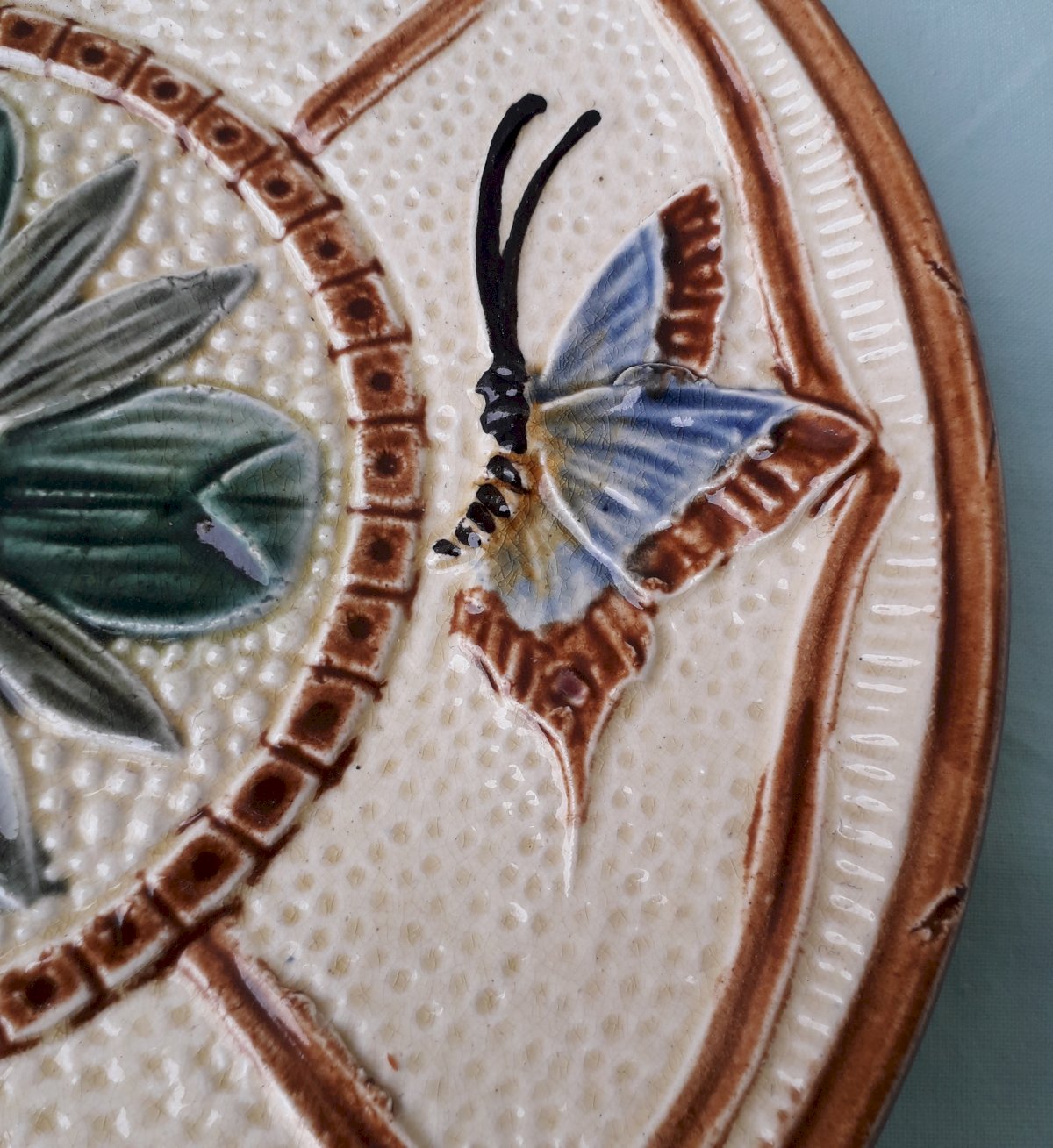 Assiette en barbotine, de la faïencerie belge de Wasmuël, au décor de papillon et de fleur.