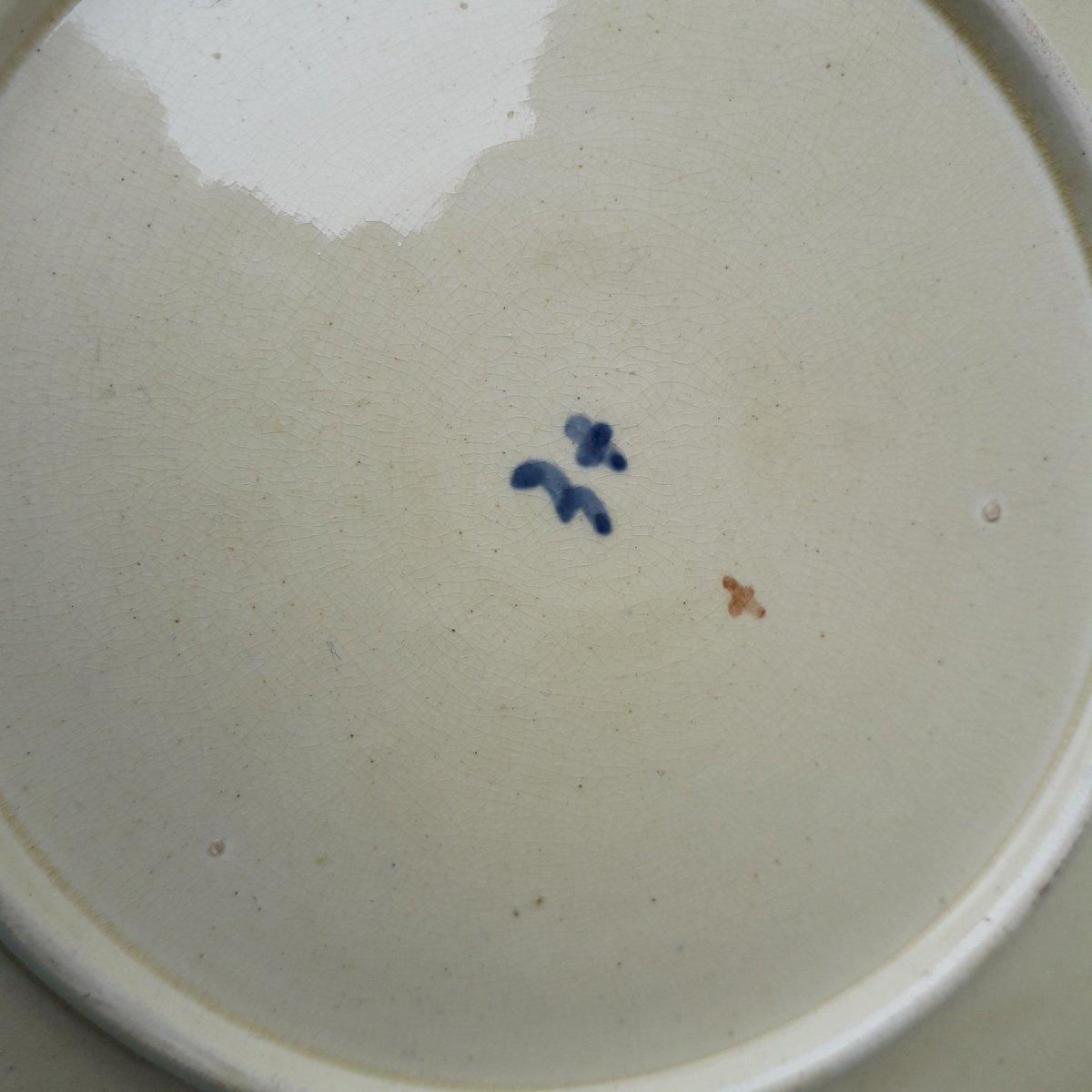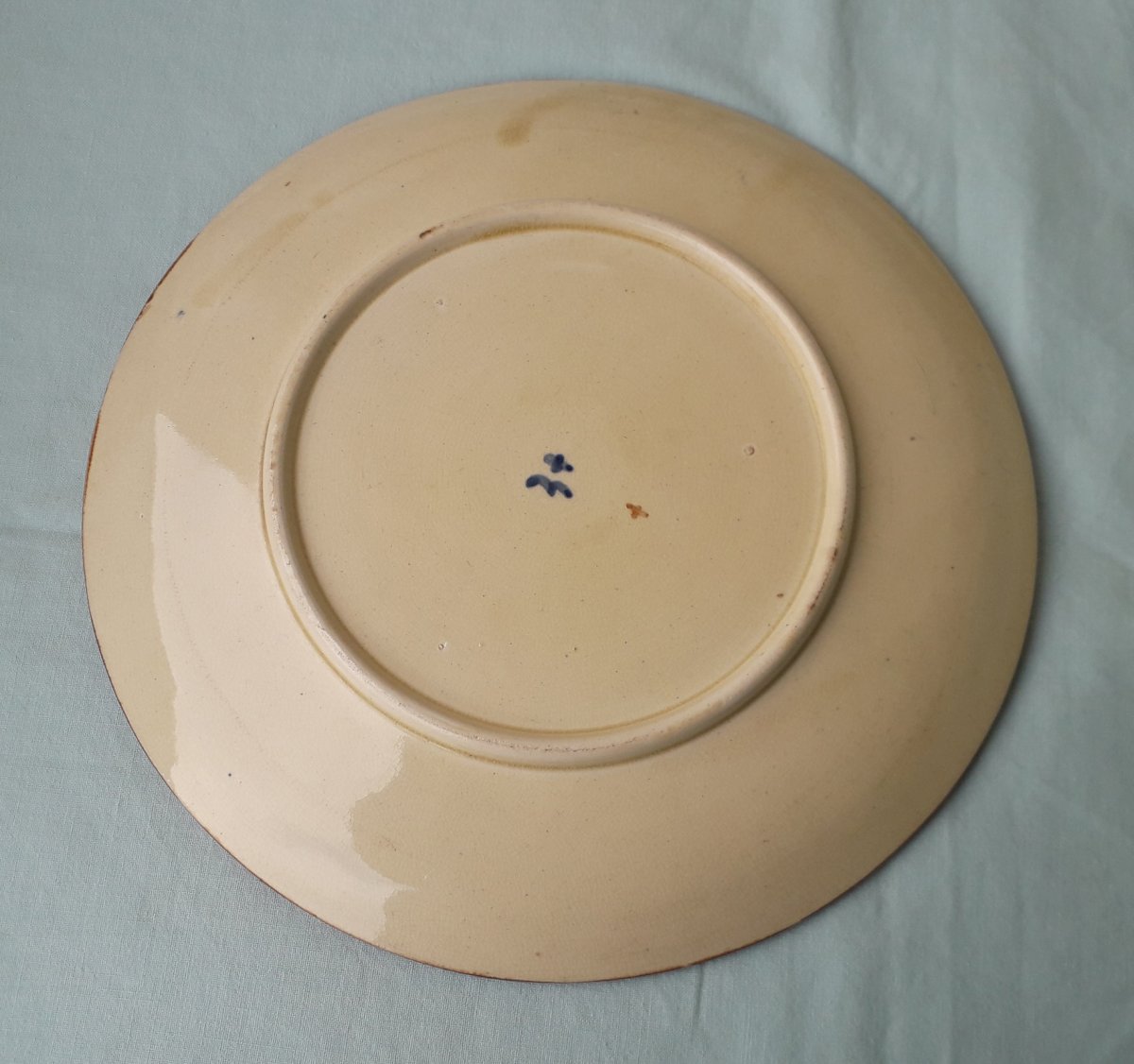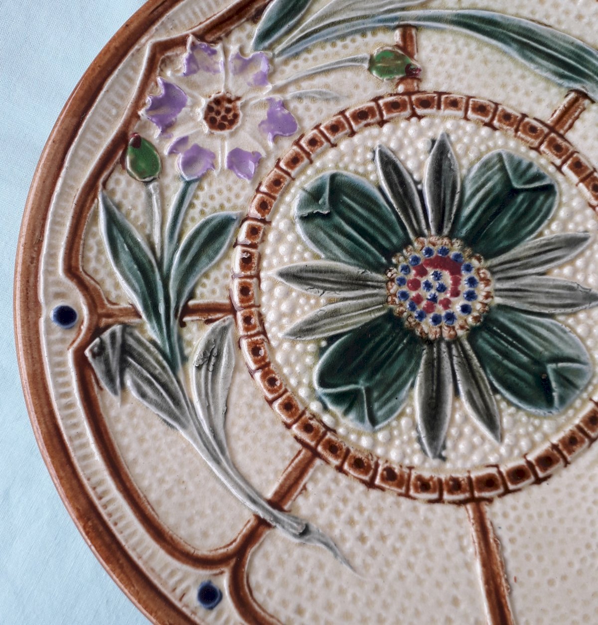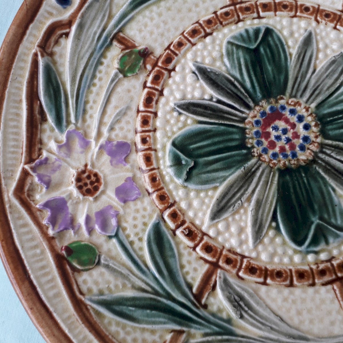 Assiette en barbotine, de la faïencerie belge de Wasmuël, au décor de papillon et de fleur.