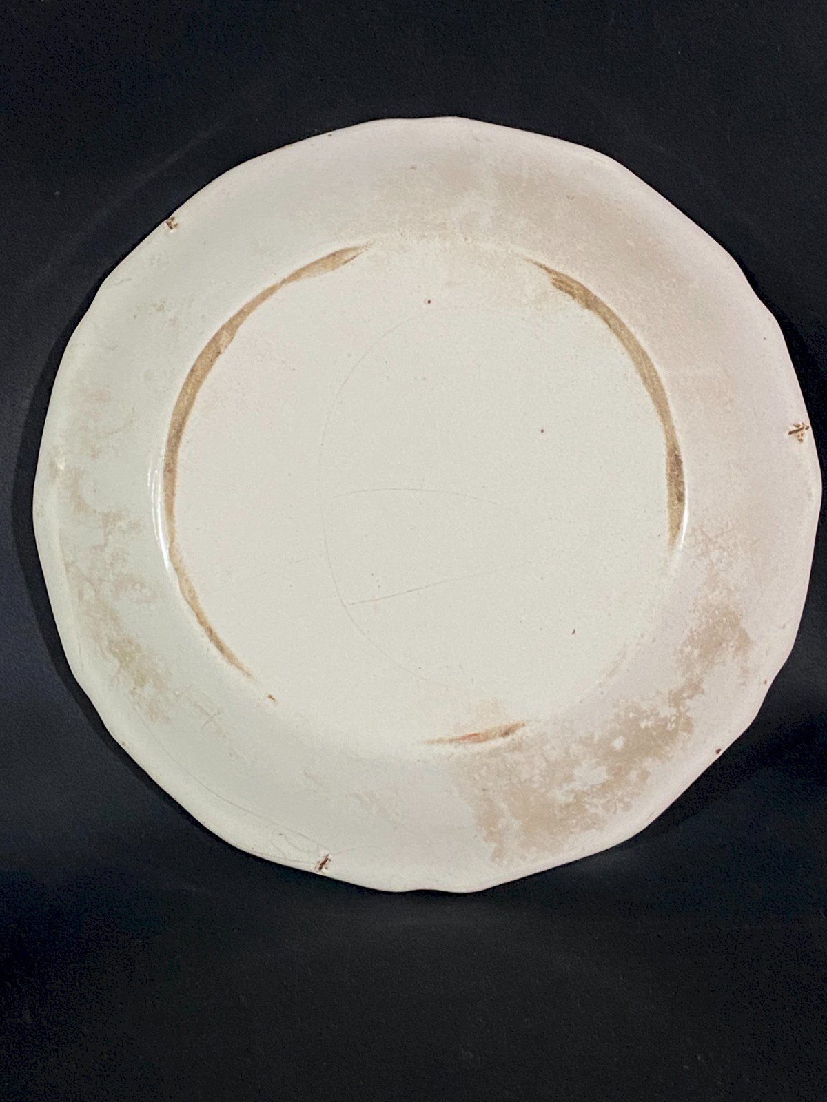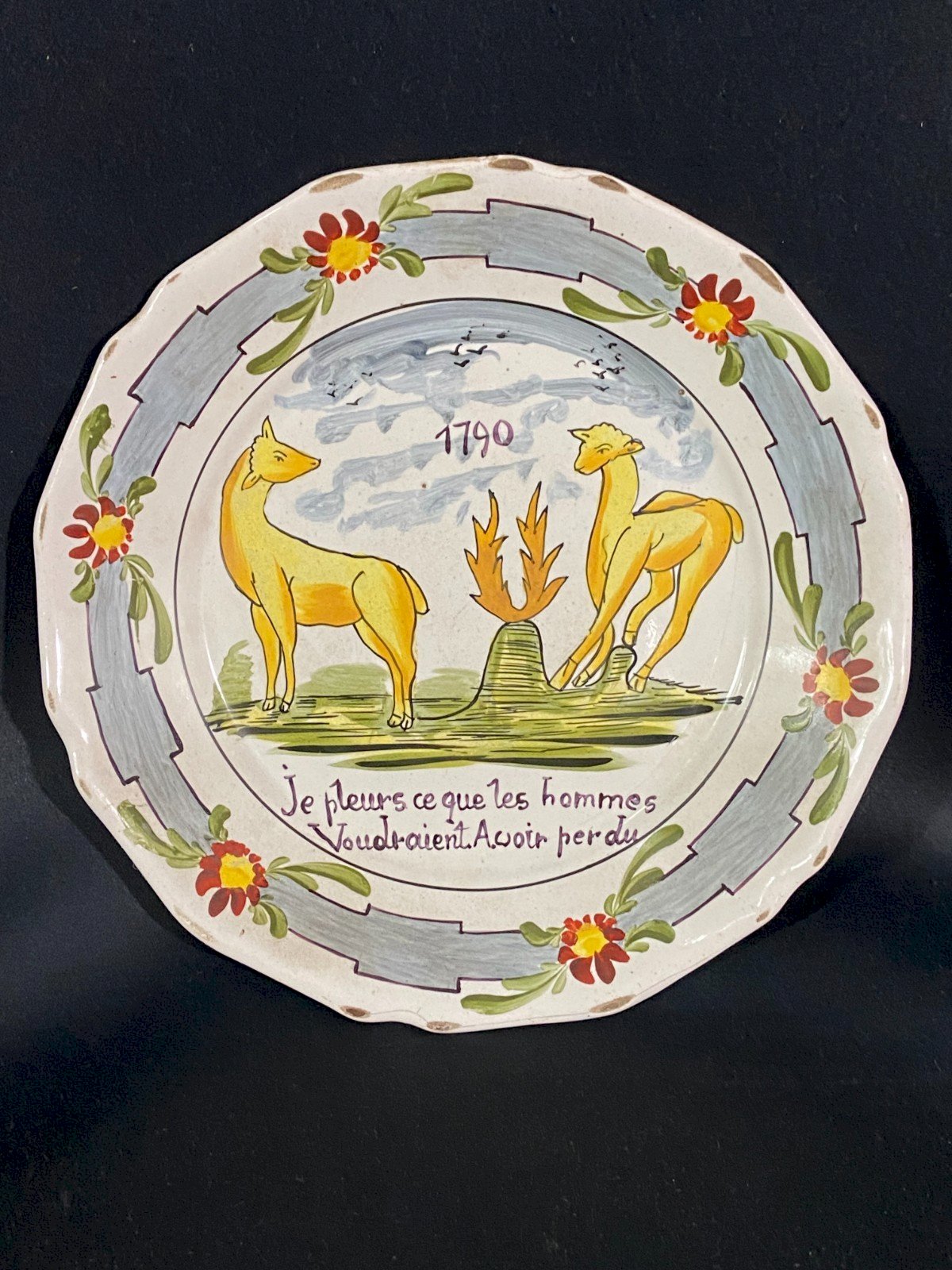 Assiette en faïence de Nevers de style révolutionnaire XIXe Décor polychrome peint au pinceau  Au centre, deux biches encadrant une flamme sur tertre, la date "1790" et la devise peinte "Je pleurs ce que les hommes voudraient avoir perdu" Marli à rubans gris violacés et fleurettes Bord festonné Revers non marqué, traces d'enfournement. Dimensions max : Diamètre 23,3 x 3 cm Poids : 458 grammes Très bon état Envoi TRES soigné dans le monde entier Matériaux provenant de:France