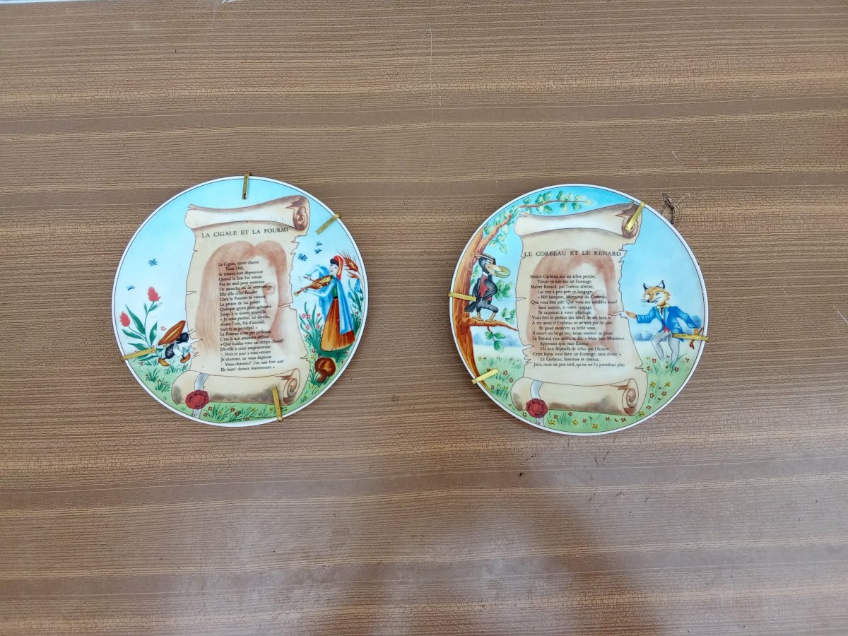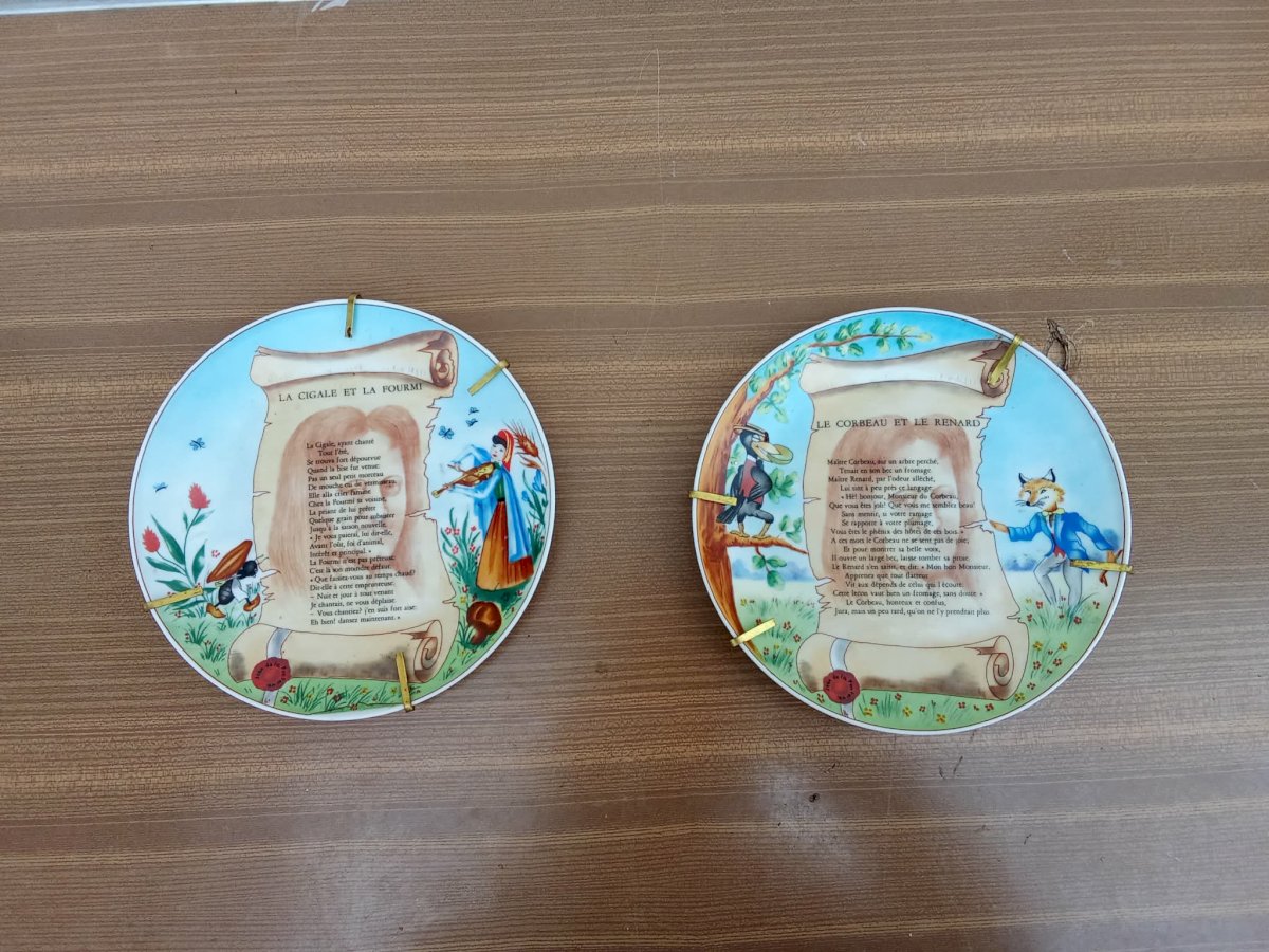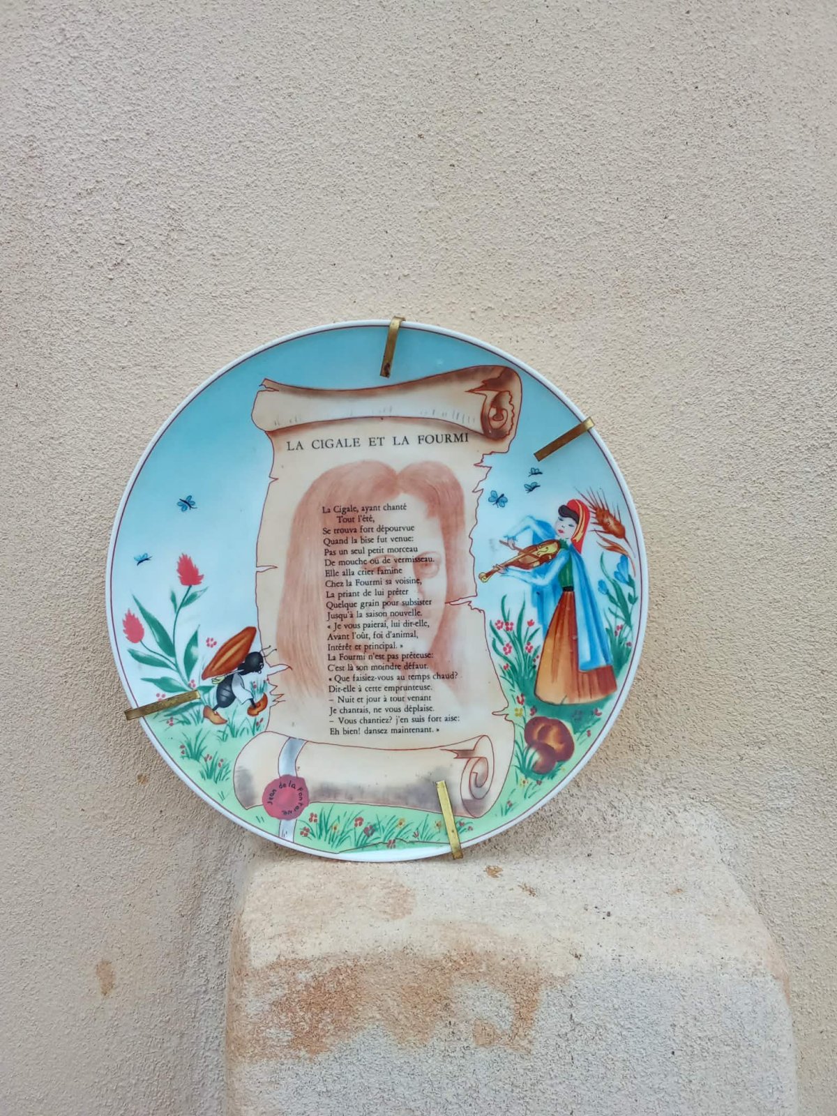Assiette en porcelaine avec fable de la fontaine la cigale et la fourmi et le corbeau et le renard