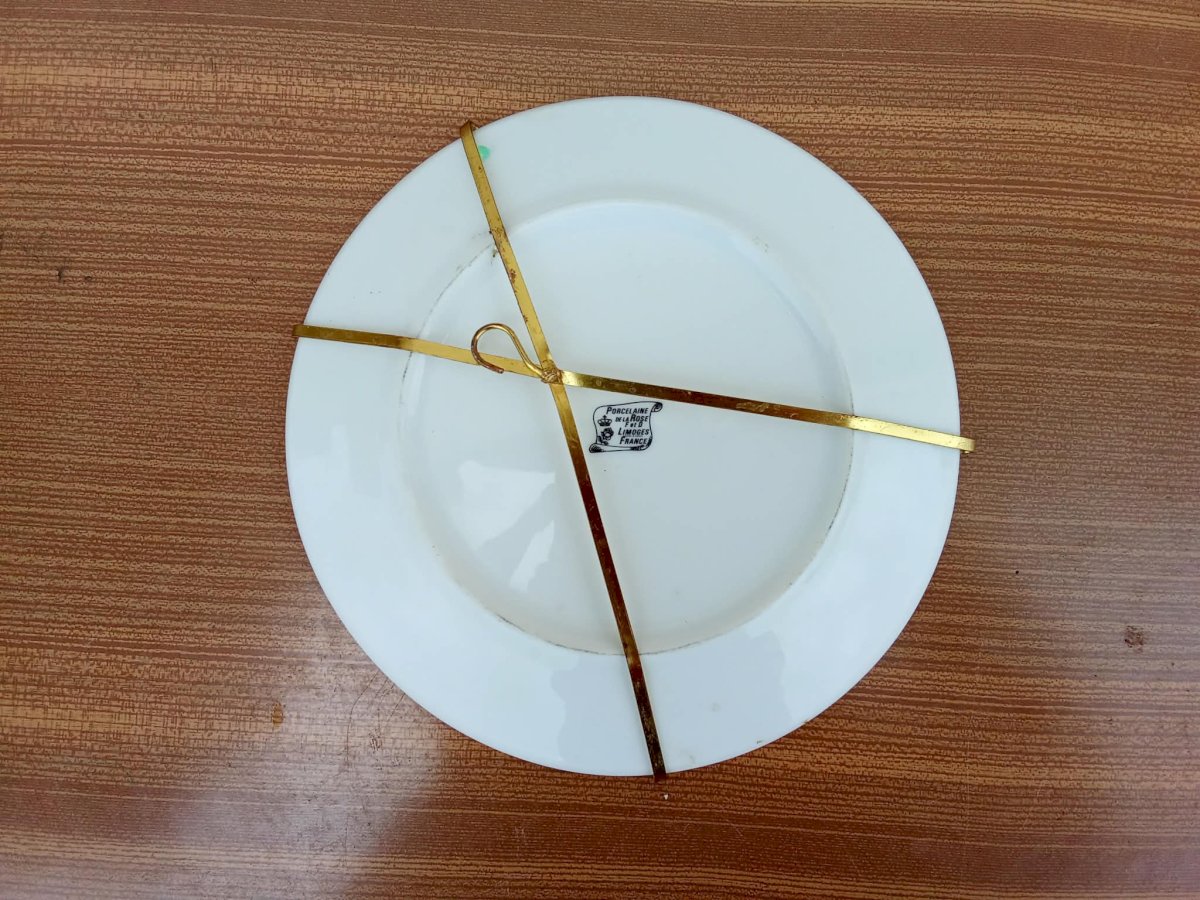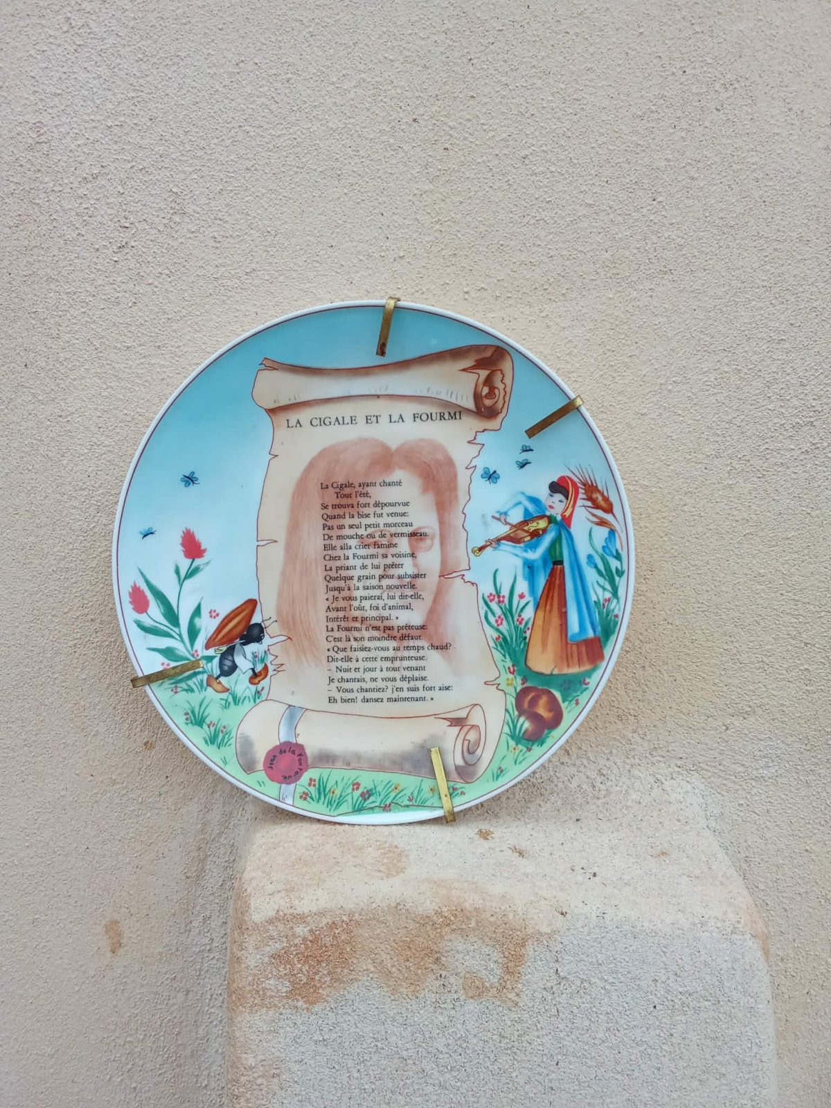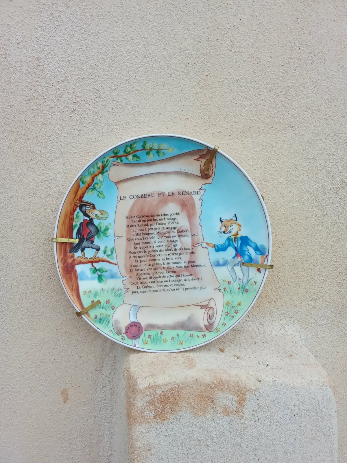 Assiette en porcelaine avec fable de la fontaine la cigale et la fourmi et le corbeau et le renard