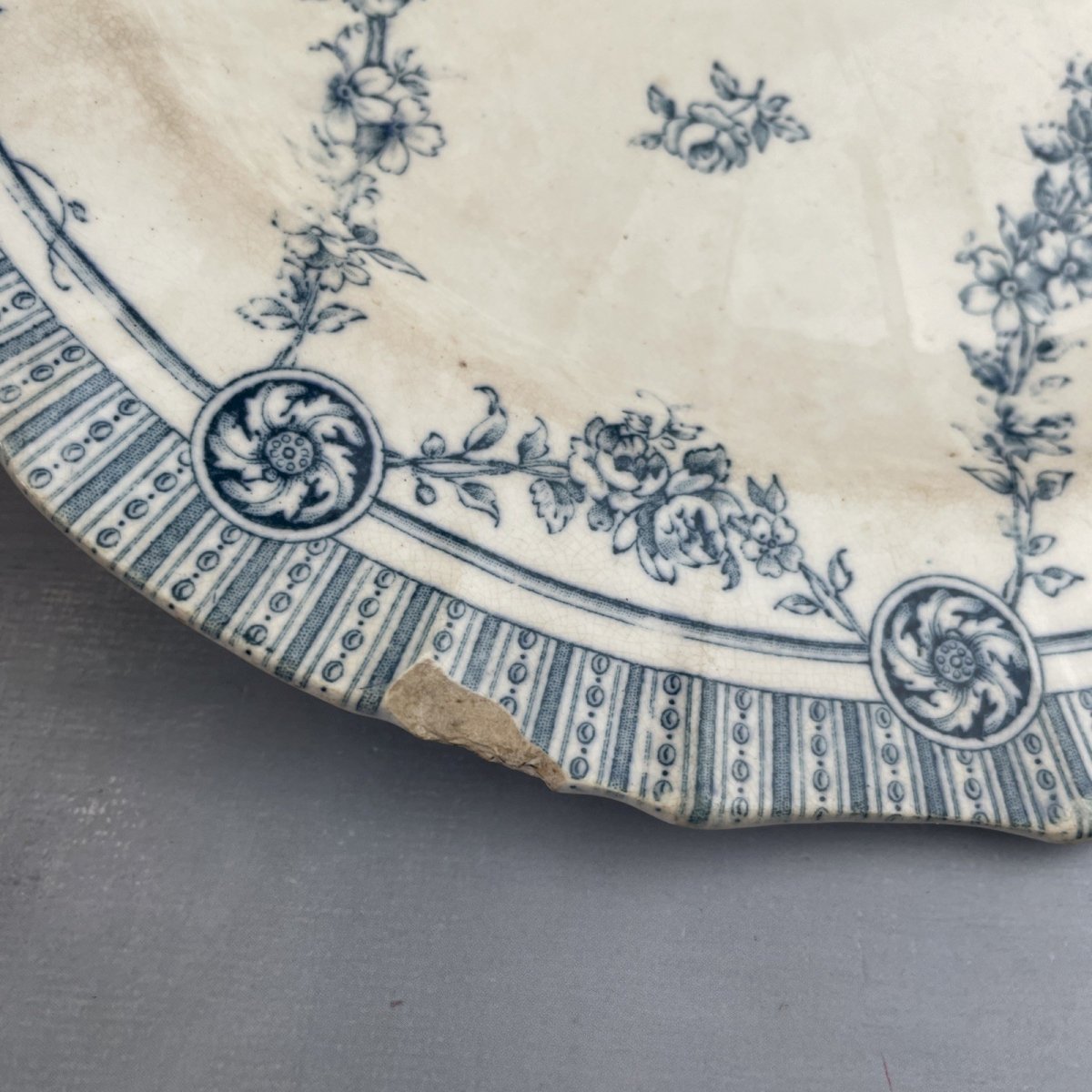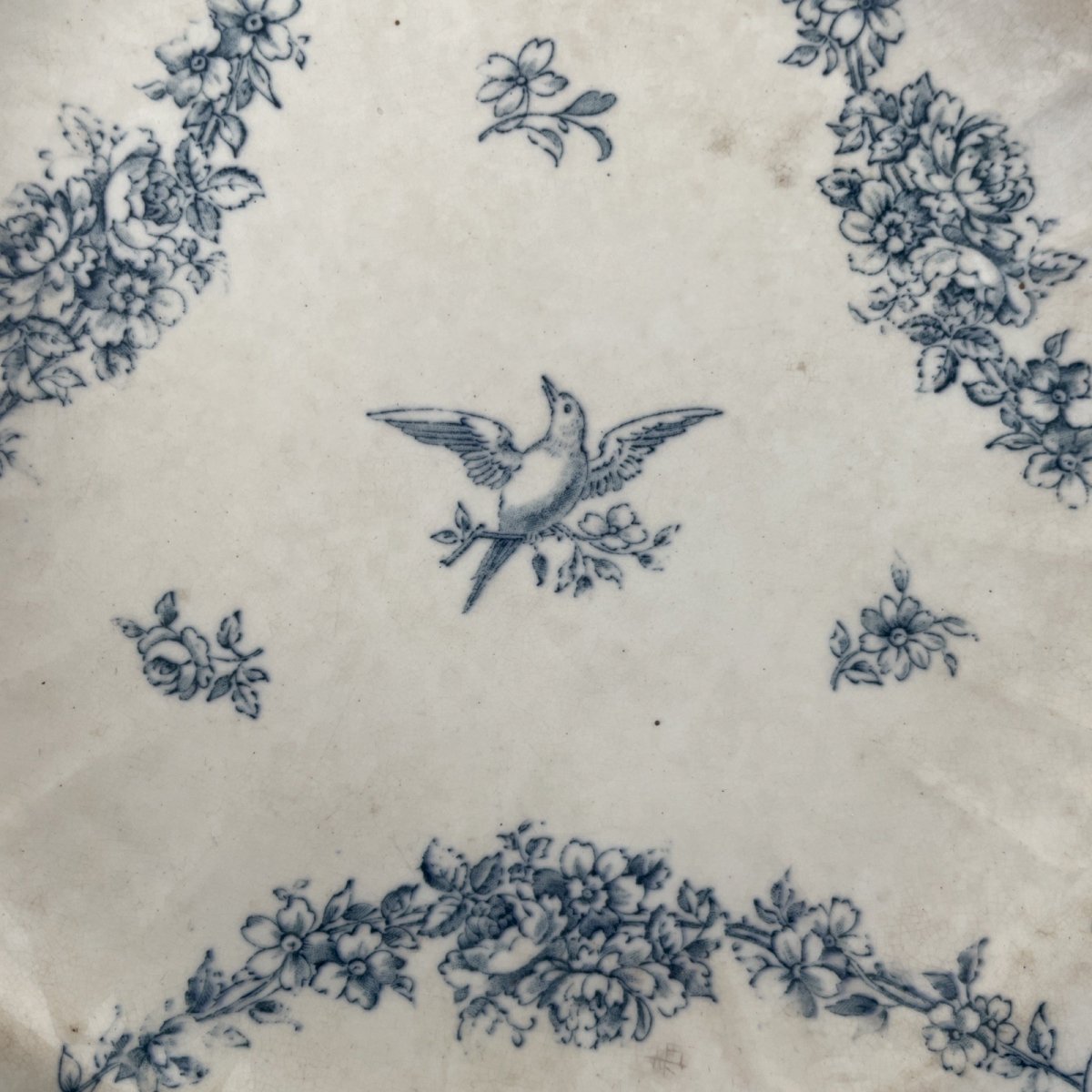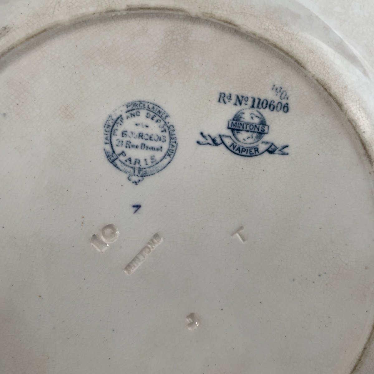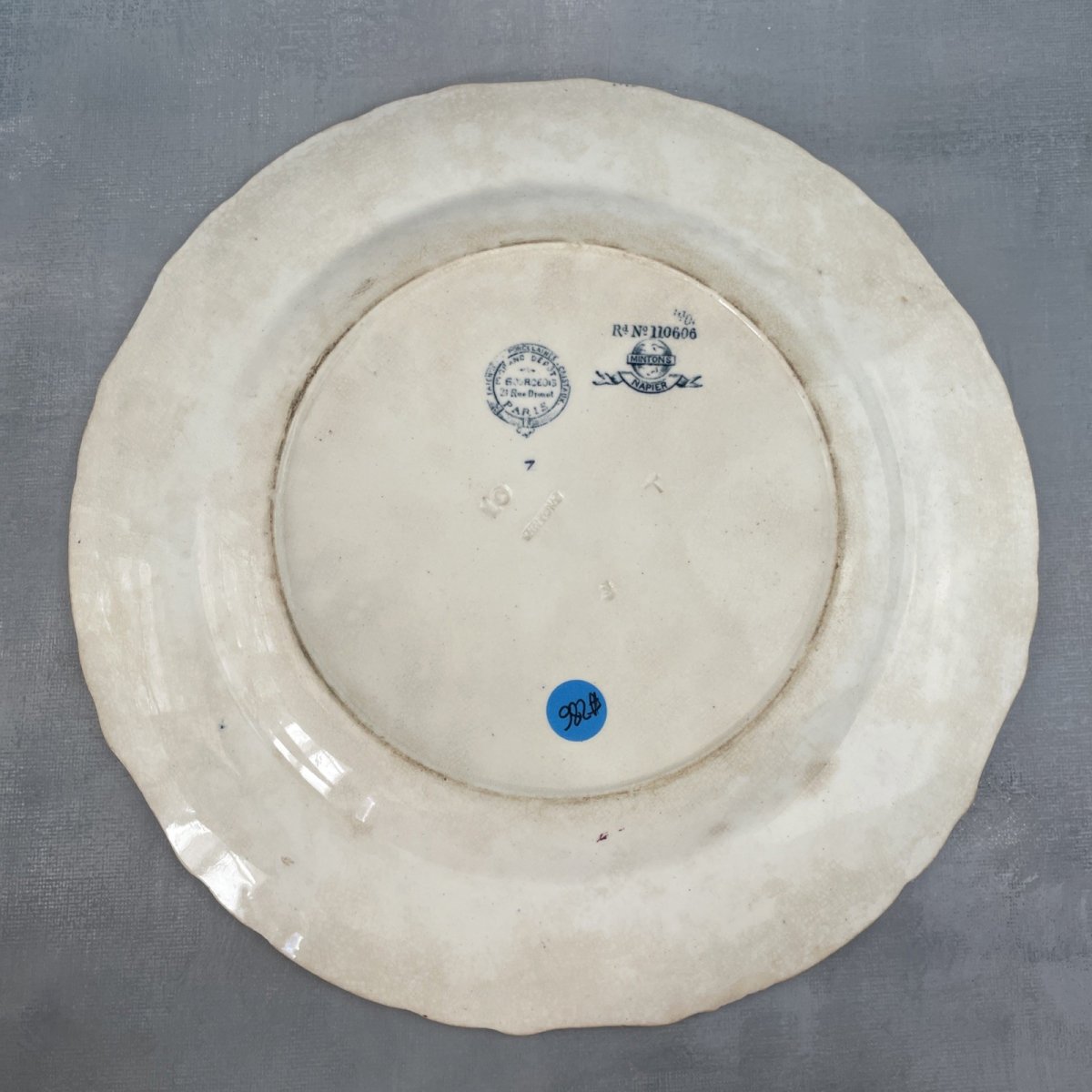 Assiette MINTONS décor NAPIER oiseau distribué par Emile Bourgeois Diam. ~26cm Diamètre ~ 26 cm Poids total ~ 0.6 kg Traces du temps, belle patine, un gros éclat, taches et égrenures, voir photos Pensez à grouper vos achats pour réduire les frais de port !