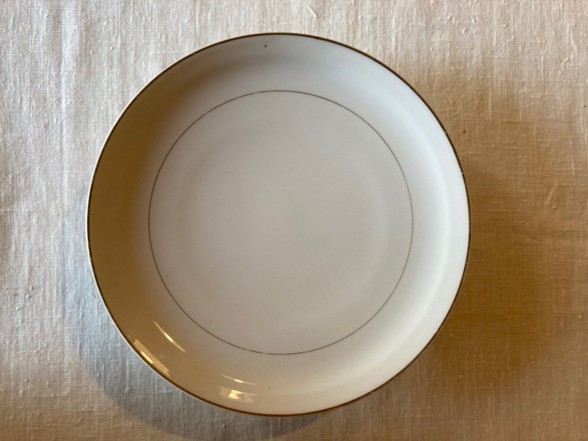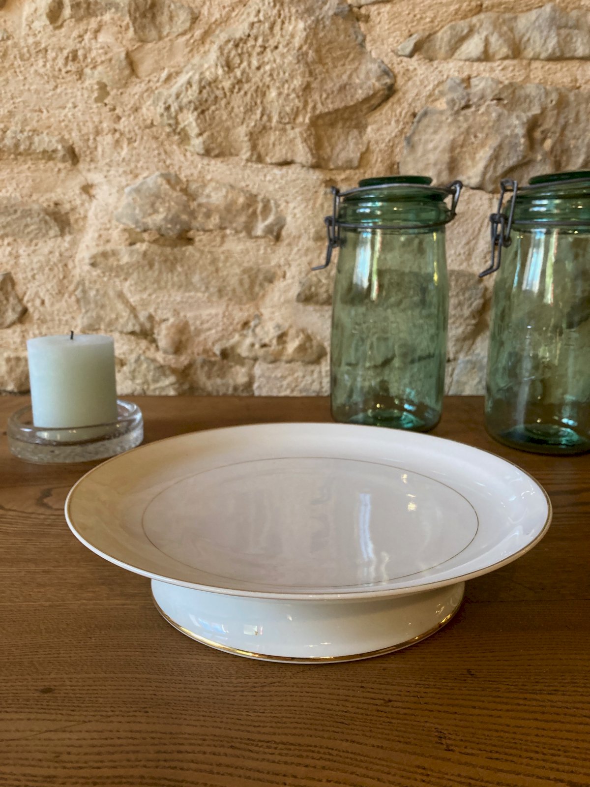 Assiette montée de la faïencerie Frank Haviland à Limoge en porcelaine blanche décorée de liserés doré. Bel état général, légers signes d’usures sur les dorures.
