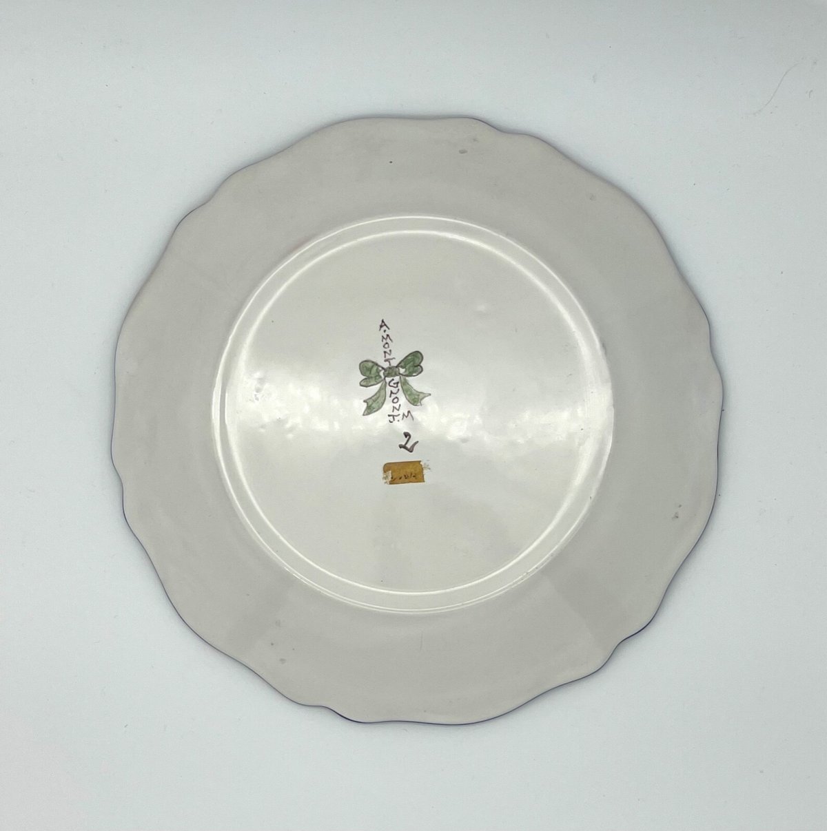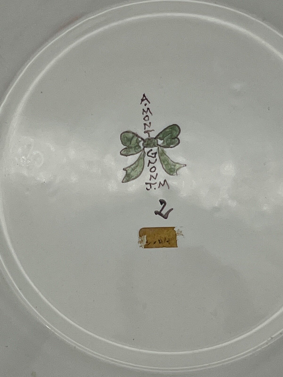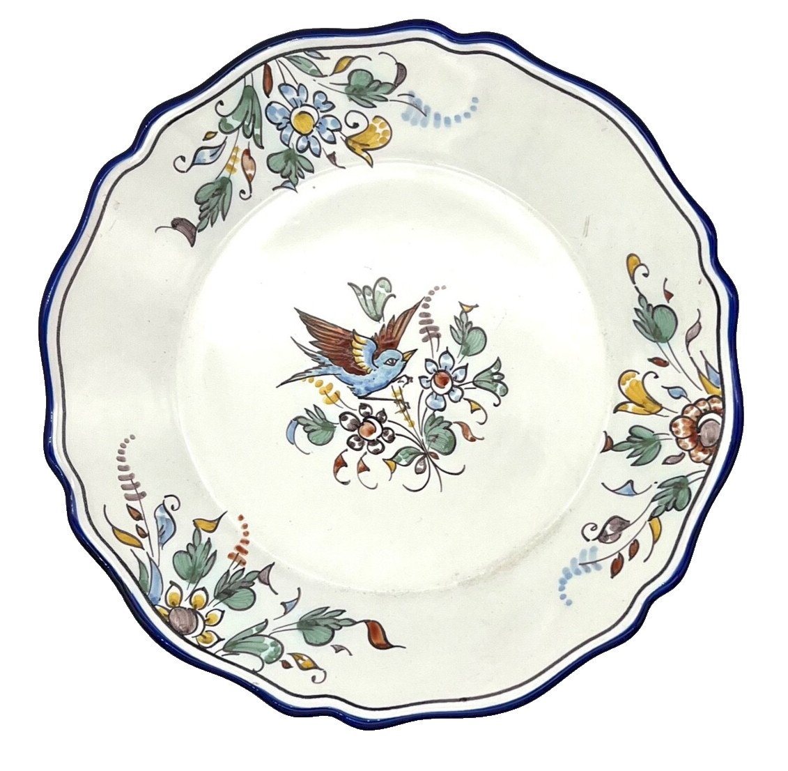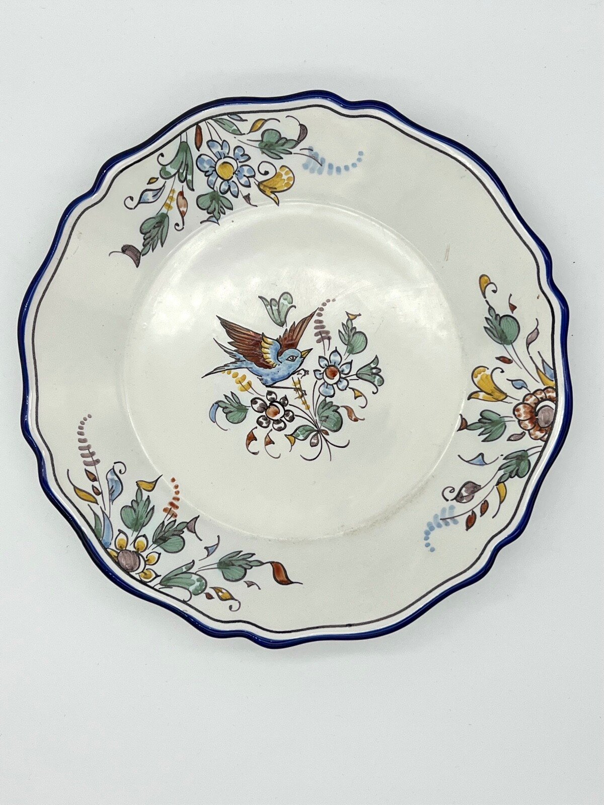 Assiette en faience de Nevers signé JM Montagnon pour Jean Montagnon. daté entre 1937 et 1978 Joli décor d'un oiseau bleu à aile rouge et jaune posé sur un bouquet de fleur. Le contour de l'assiette est chantourné avec un Filet bleu. Assiette en très bon état Diamètre : 23,5cm hauteur : 3,5cm Pays d'origine:France