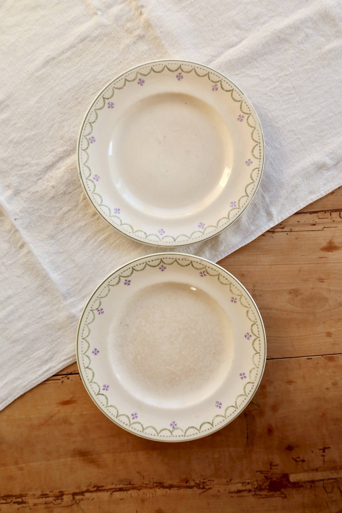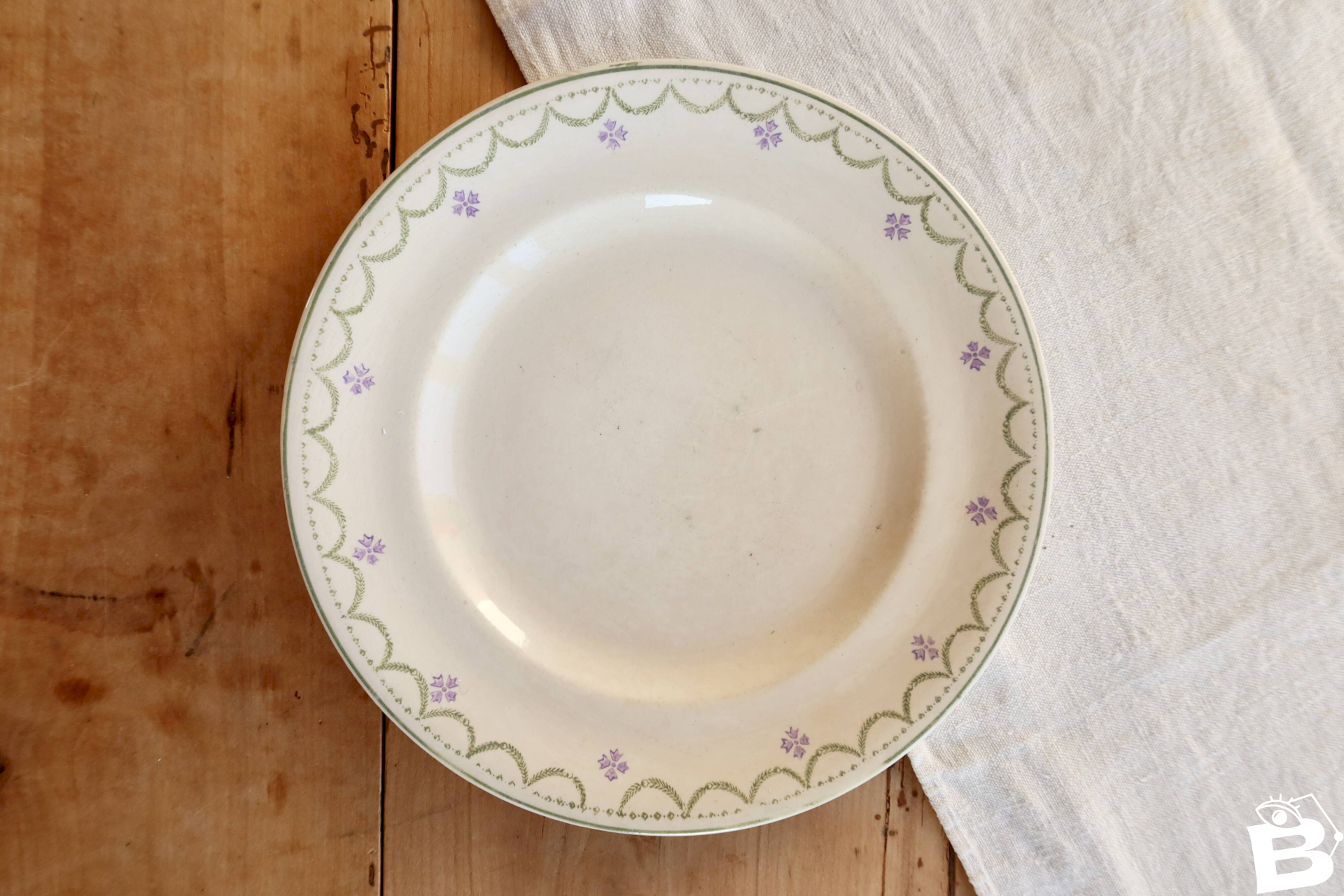 Assiette plate ancienne en terre de fer de la manufacture de Longwy, modèle Violetta, reconnaissable à son élégant décor vert et violet à frise géométrique et fleurettes d’inspiration classique.La faïence présente une belle patine du temps, avec un émail légèrement satiné typique des productions du milieu du XXᵉ siècle, idéale pour une table ancienne ou une composition décorative.Vendue à l'unité, deux assiettes disponibles.Dimensions: 23, 5cm de diamètre.
