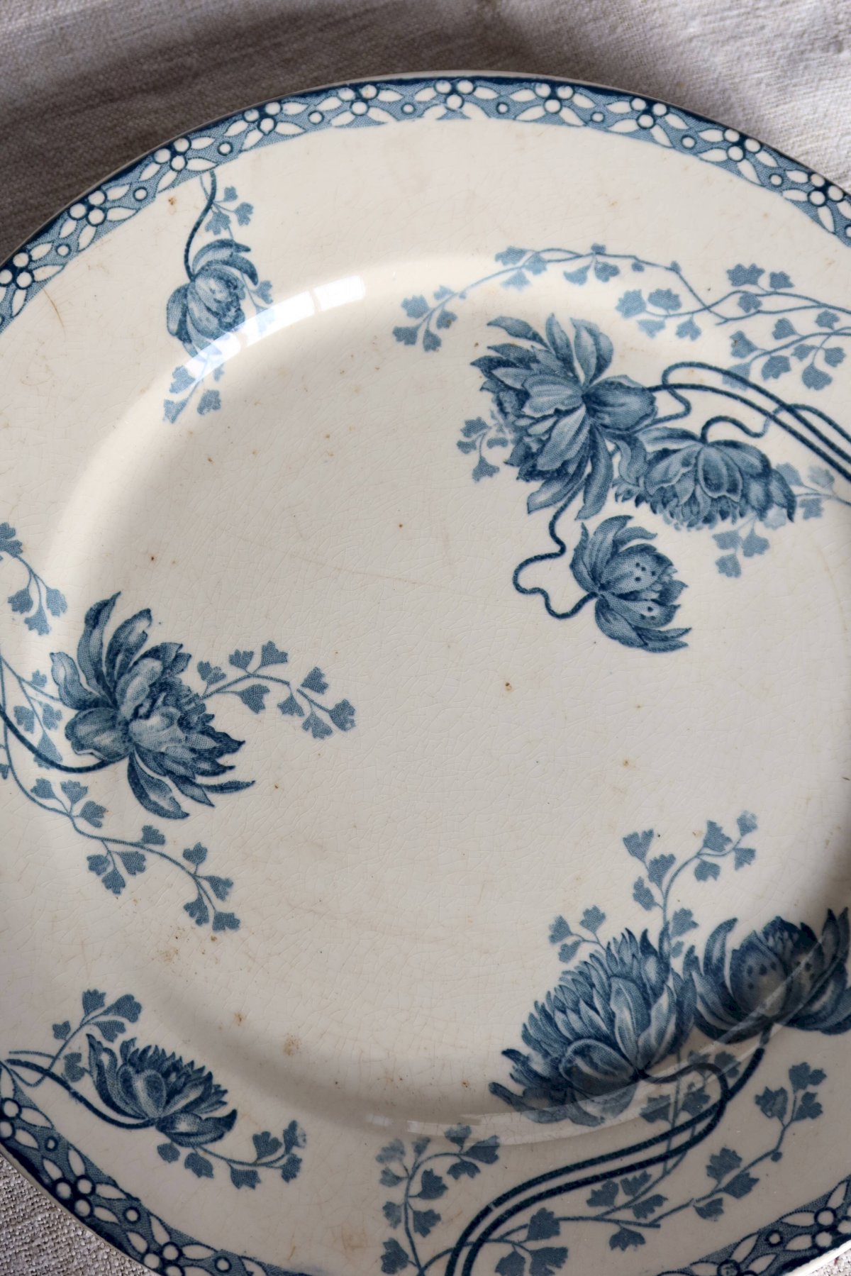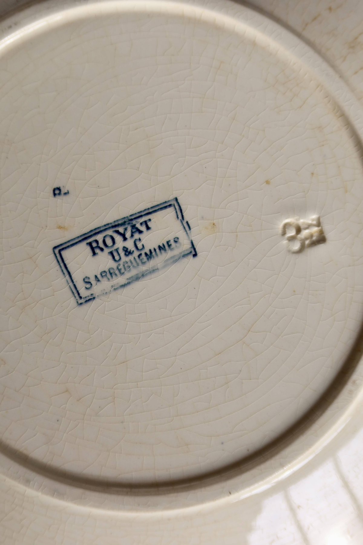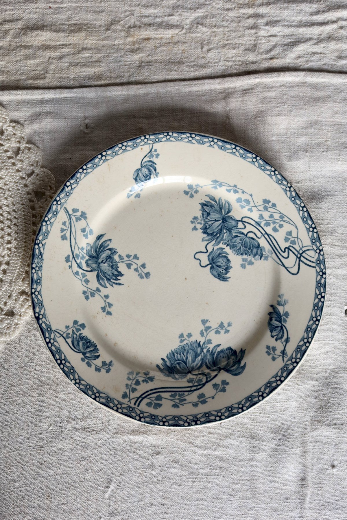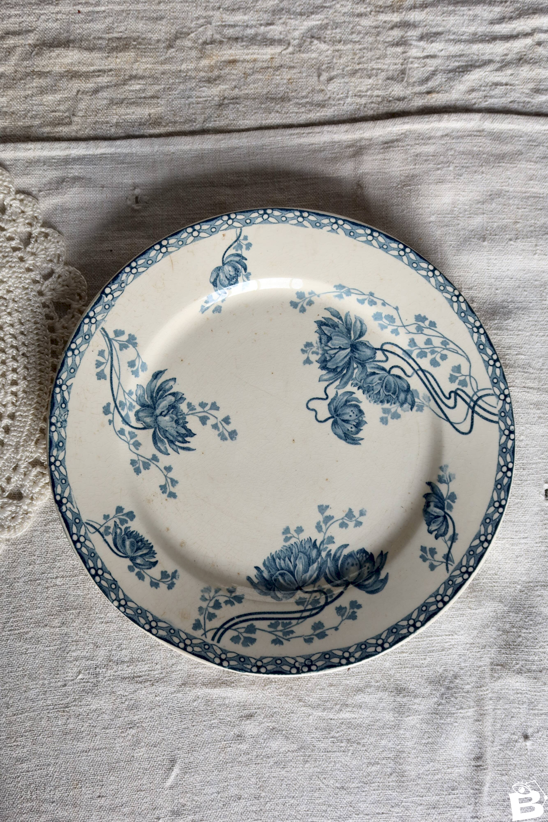 Superbe terre de fer ivoire de Sarreguemines, modèle Royat, ornée par transfert d’un décor romantique bleu : bouquets stylisés, rubans sinueux et petites vrilles de vigne qui courent sur le marli.Patine d’époque avec griffes et légers craquelures d’émail cohérents avec l’âge, charme brocante garanti.Dimensions: 23cm de diamètre.