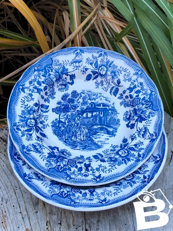 4 assiettes creuses vintage dépareillées porcelaine bleue blanche bistrot papillons