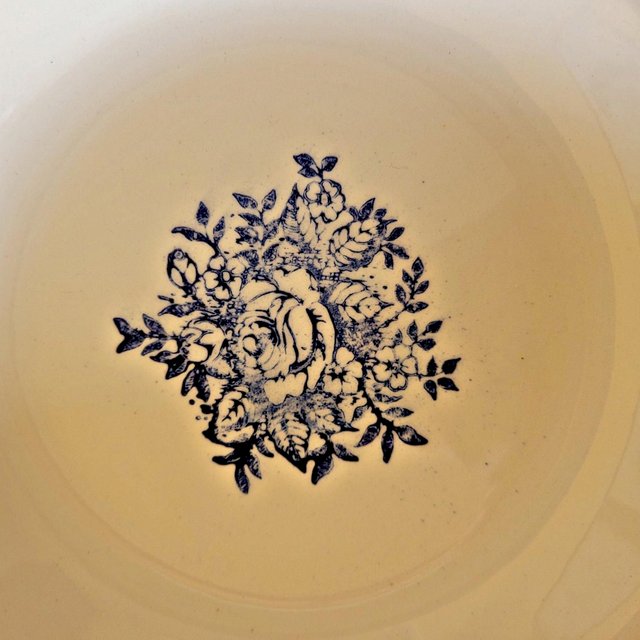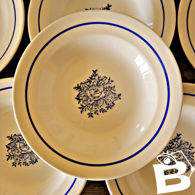 Assiettes creuses vintage faïence ADP, motifs de roses couleur bleu Formica