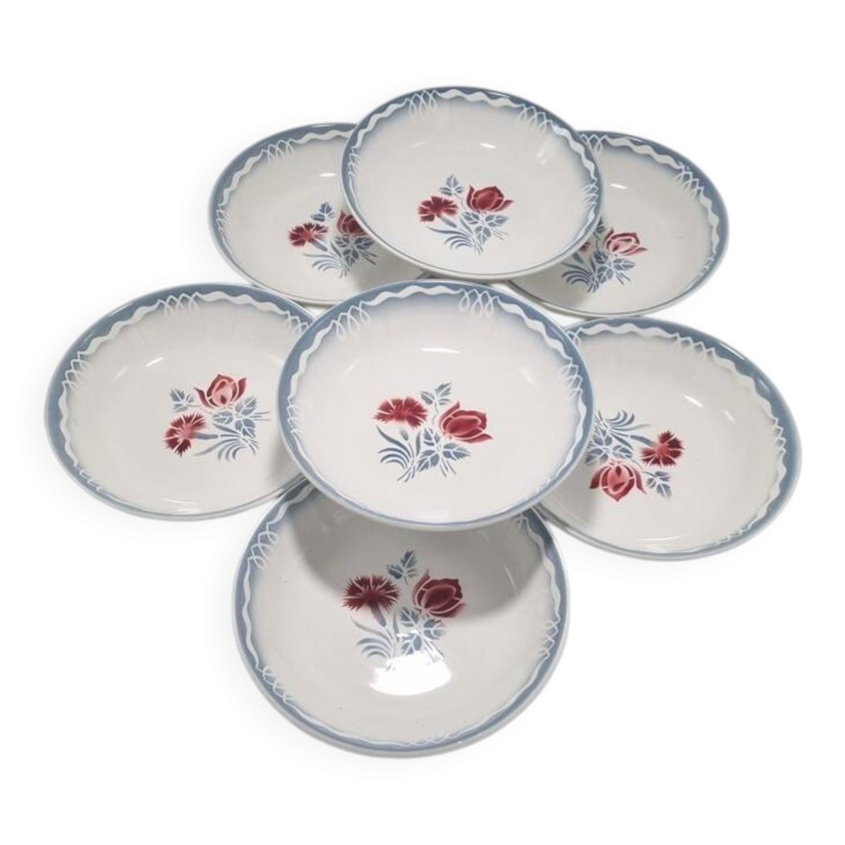 Lot de 7 assiettes à soupe Digoin Sarreguemines modèle Juliette,aux teintes bleu gris et rose bordeaux.Dimensions : 21 x 4.5 cmPoids du lot : environ 2.4 kg